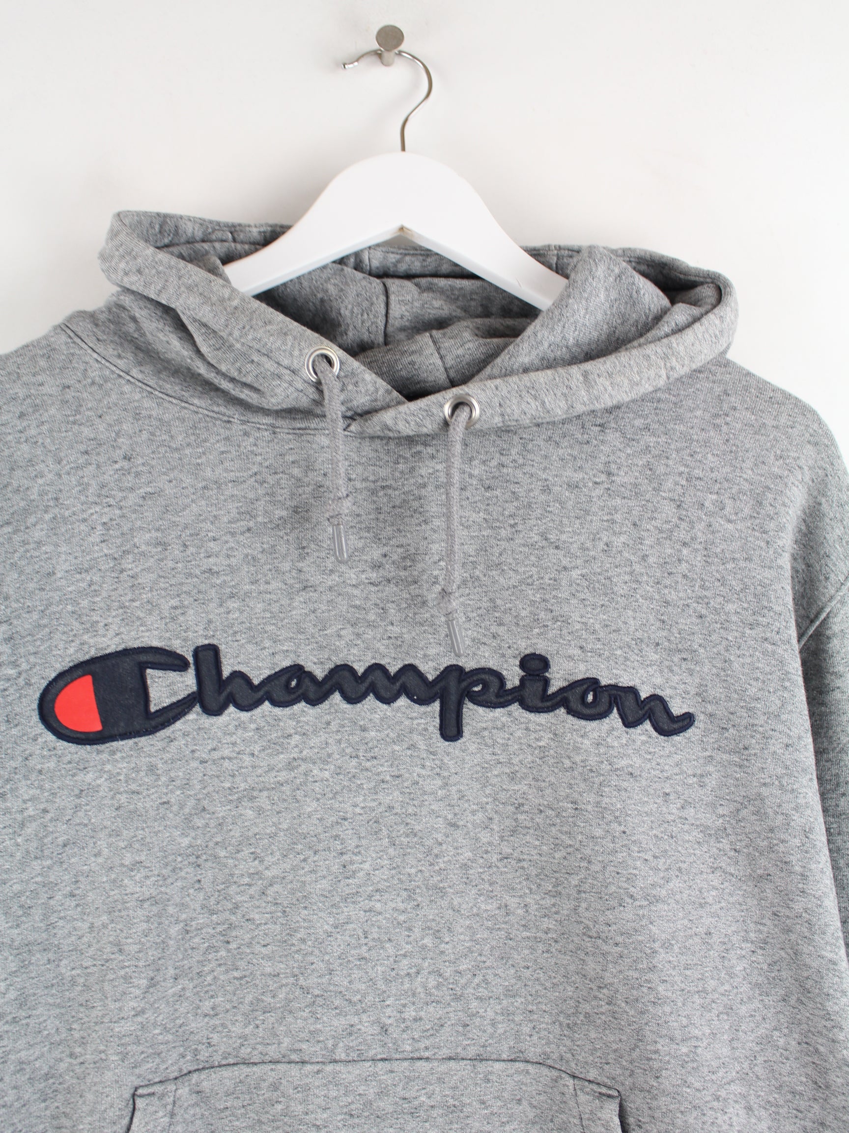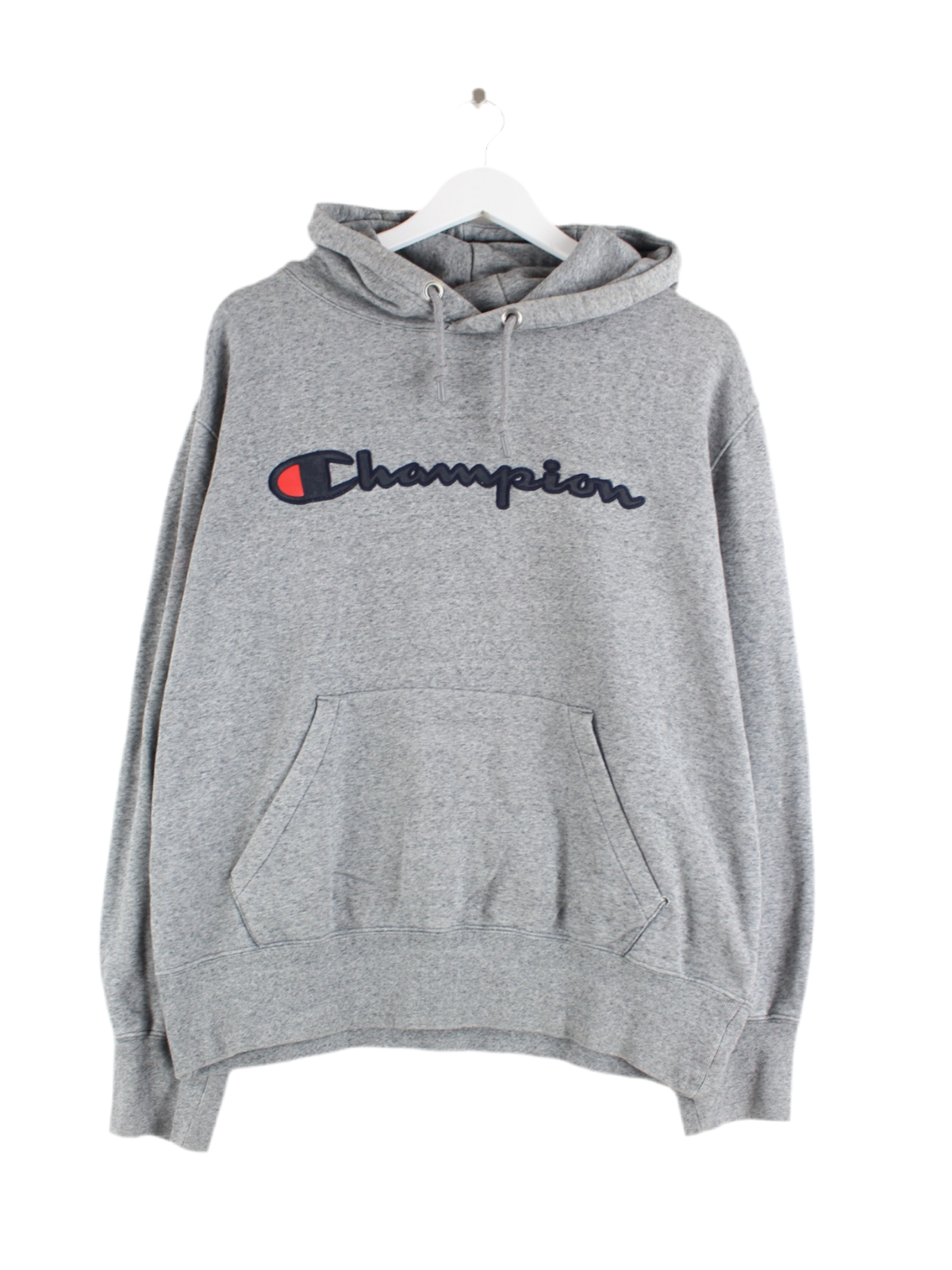 Grauer Hoodie mit Stick von Champion in Größe XL. Er ist aus einer Baumwollmischung . Den Zustand würden wir als 'In Ordnung' bezeichnen (vergl. Bilder).
