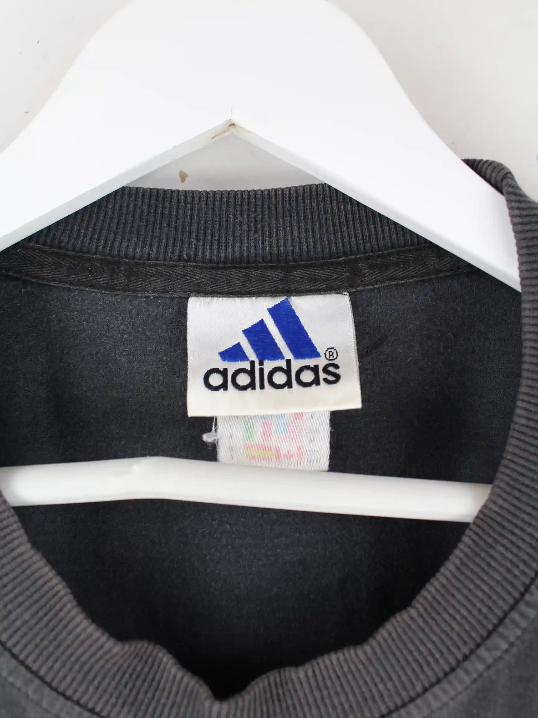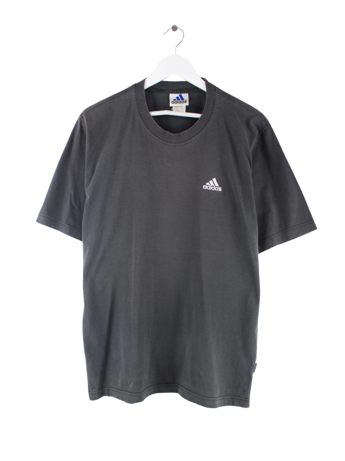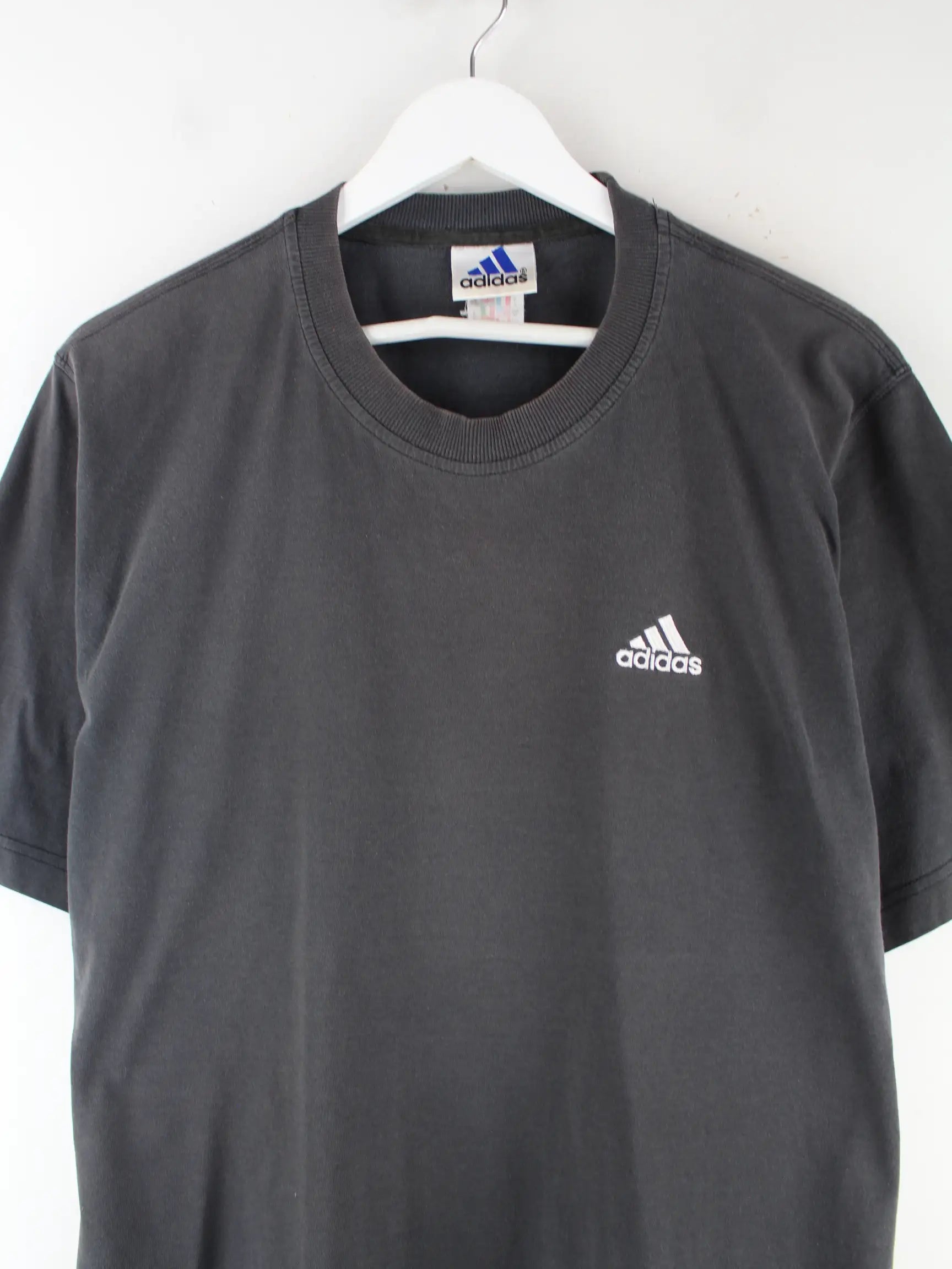 Schwarzes T-Shirt vom Brand Adidas aus den 90'ern in Größe XL. Es ist aus Baumwolle und in gutem Zustand bei uns zu bekommen.