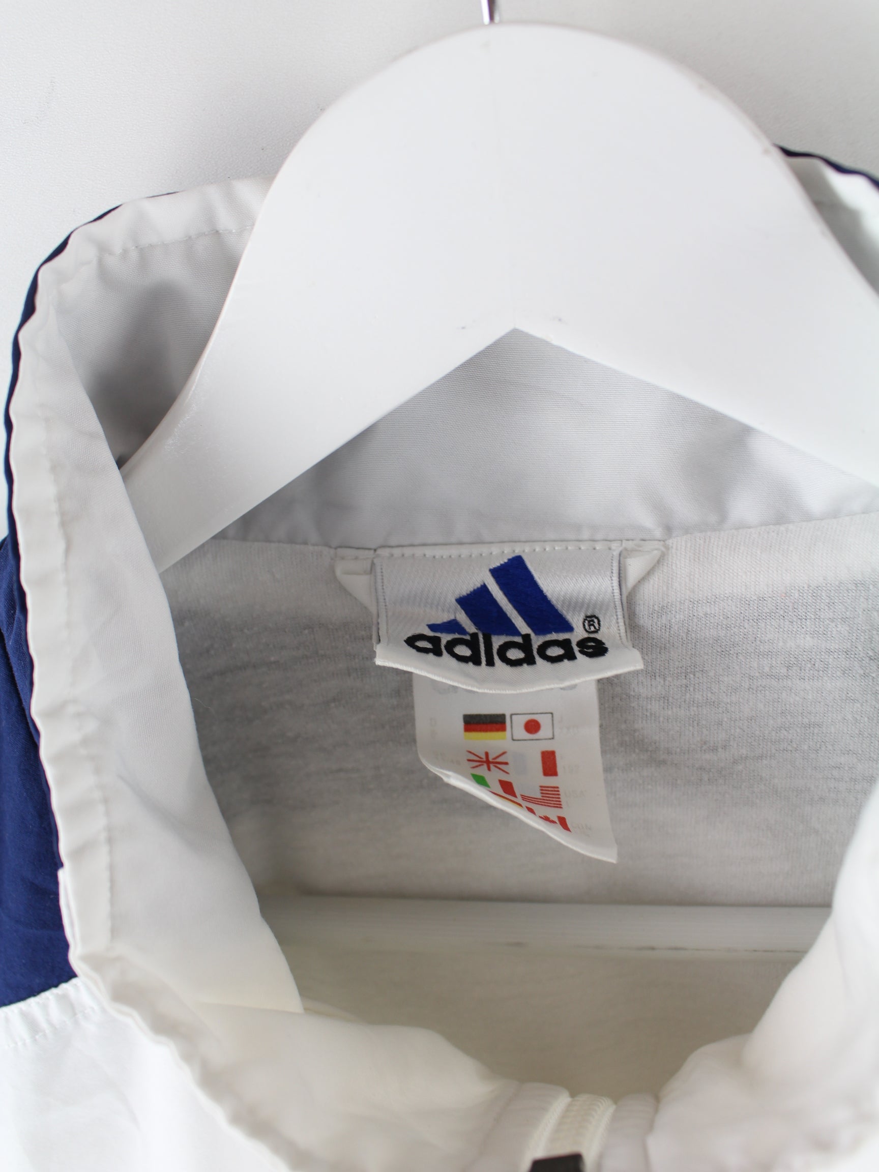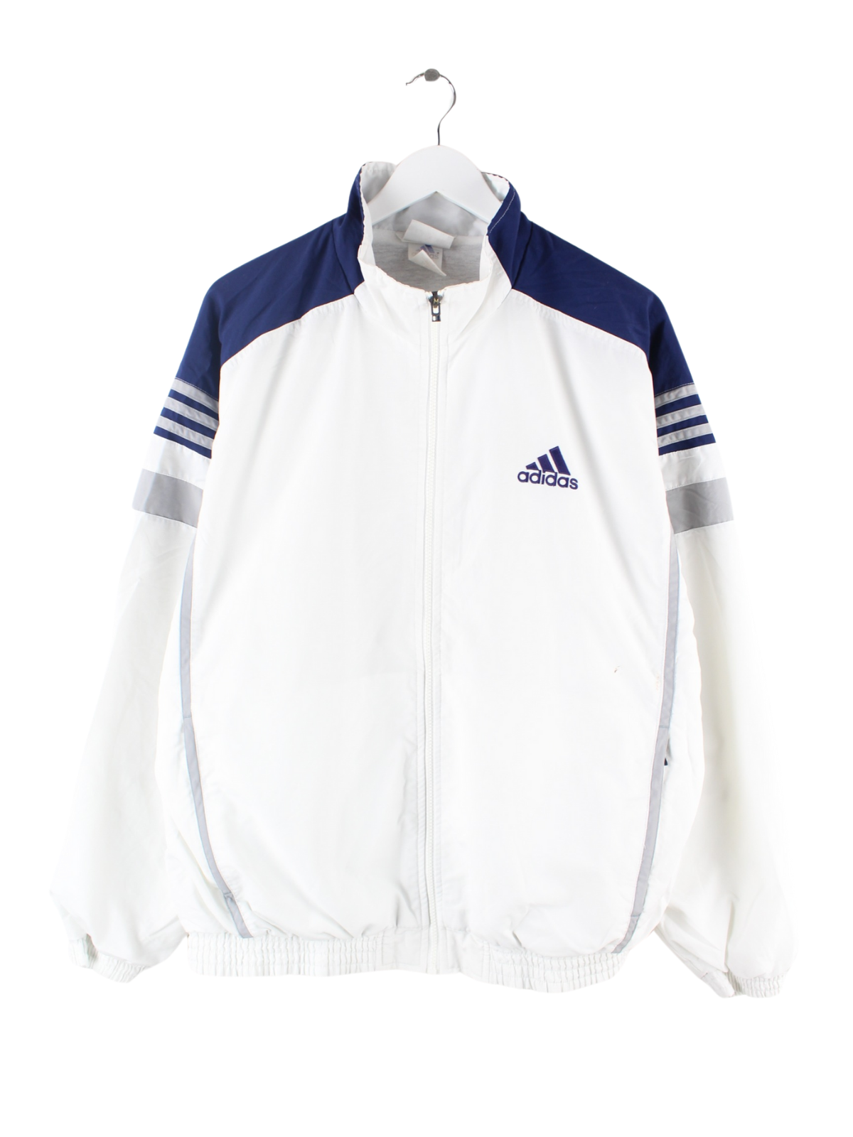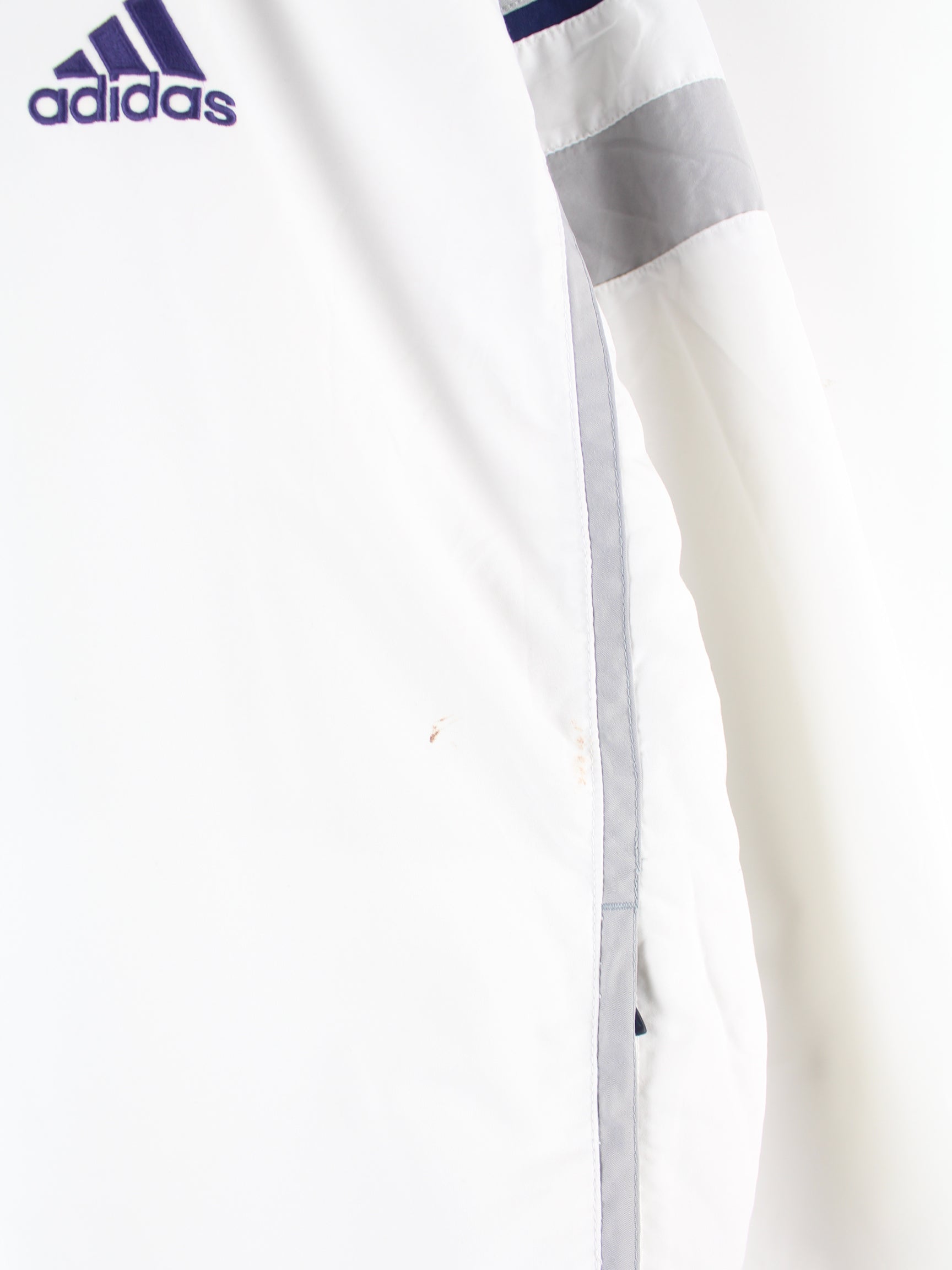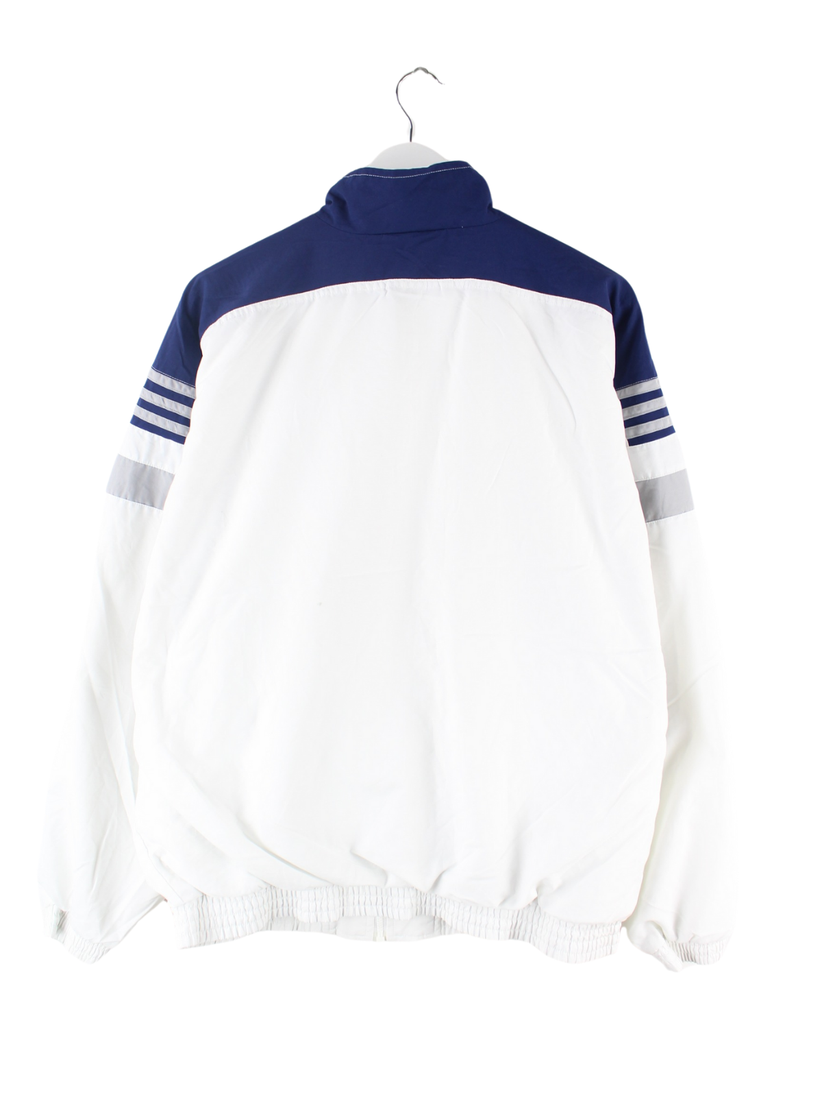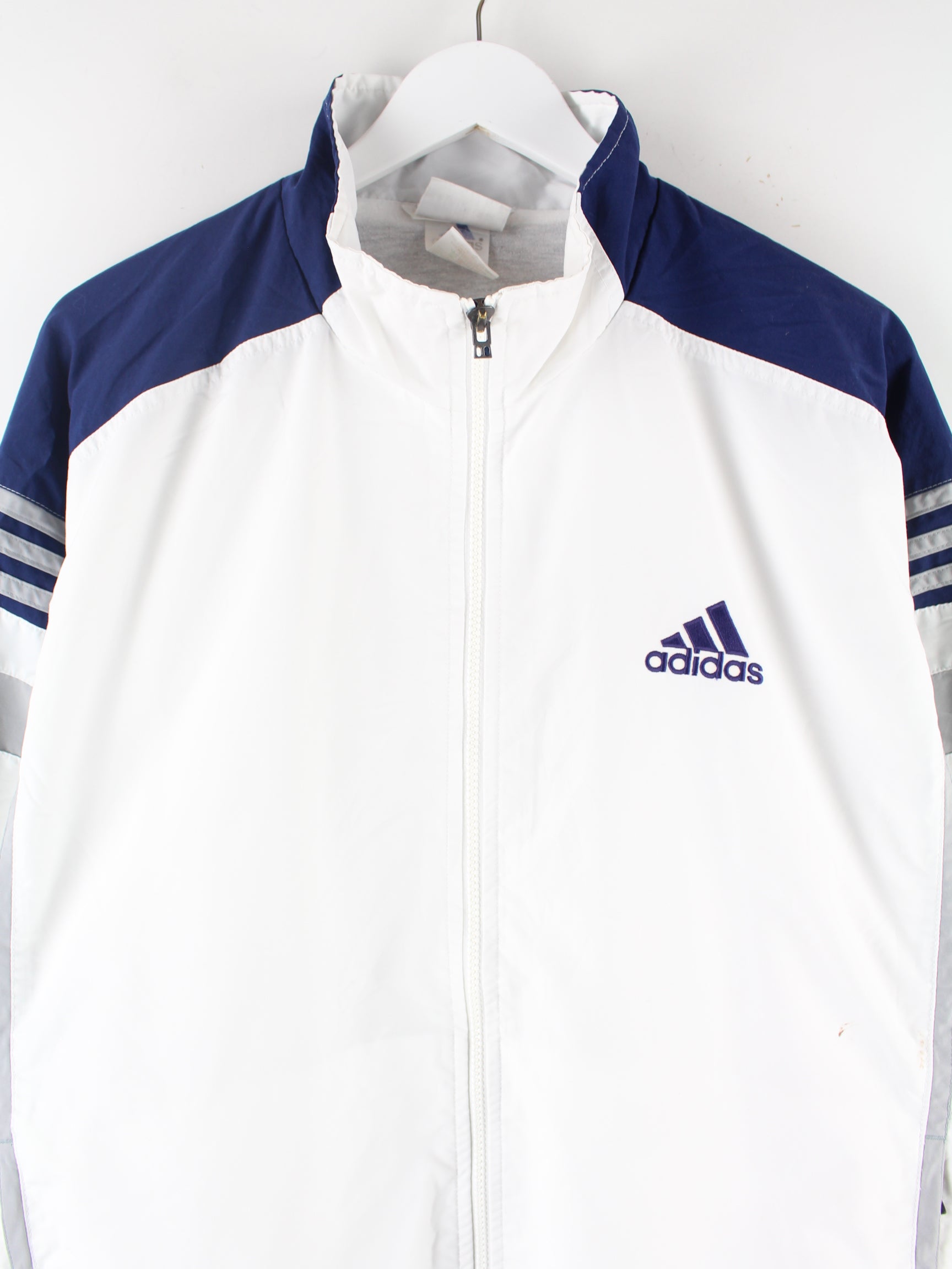 Weiße Trainingsjacke vom Label Adidas aus den 90'ern in Größe XL. Sie ist aus Synthetik gefertigt. Den Zustand würden wir als 'In Ordnung' bezeichnen (vergl. Bilder).