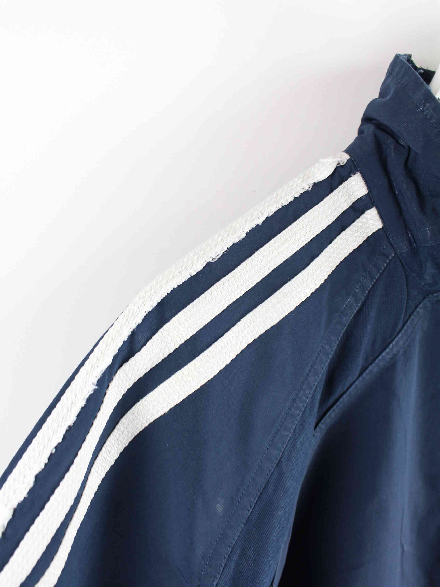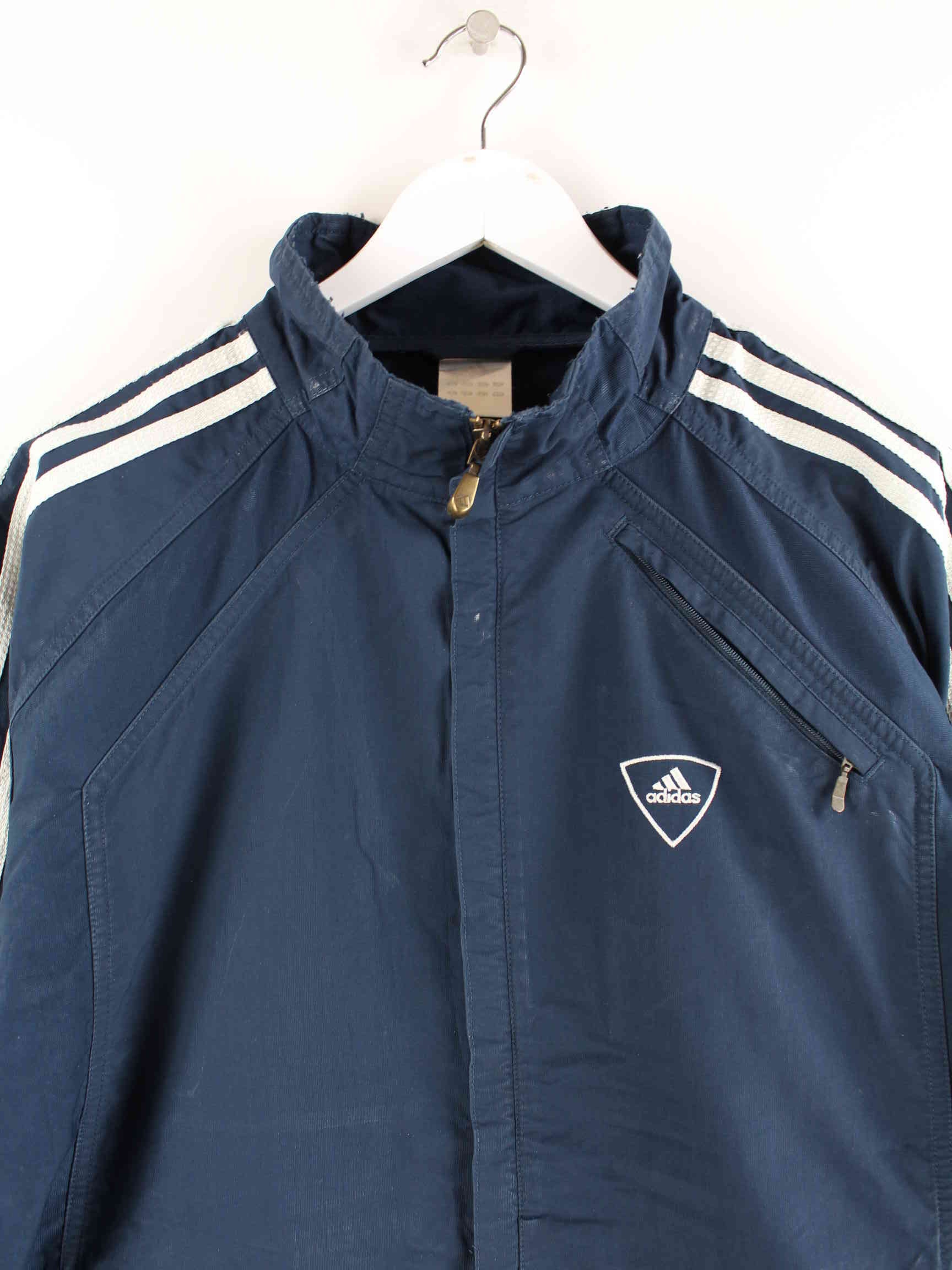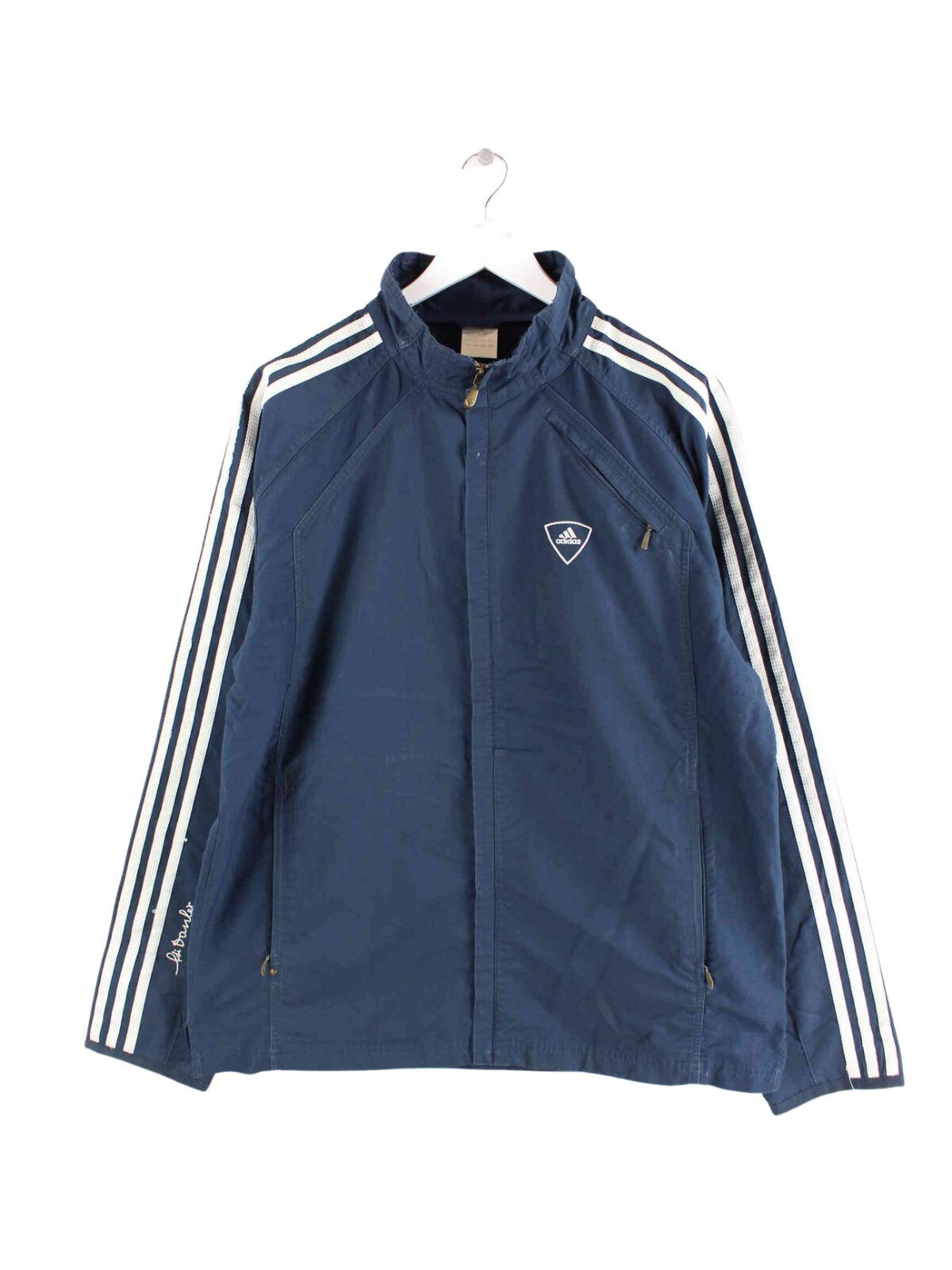 Blaue Trainingsjacke des Labels Adidas aus Anfang der 2000'er in Größe L. Sie ist aus Synthetik hergestellt und in gutem Zustand bei uns zu bekommen.