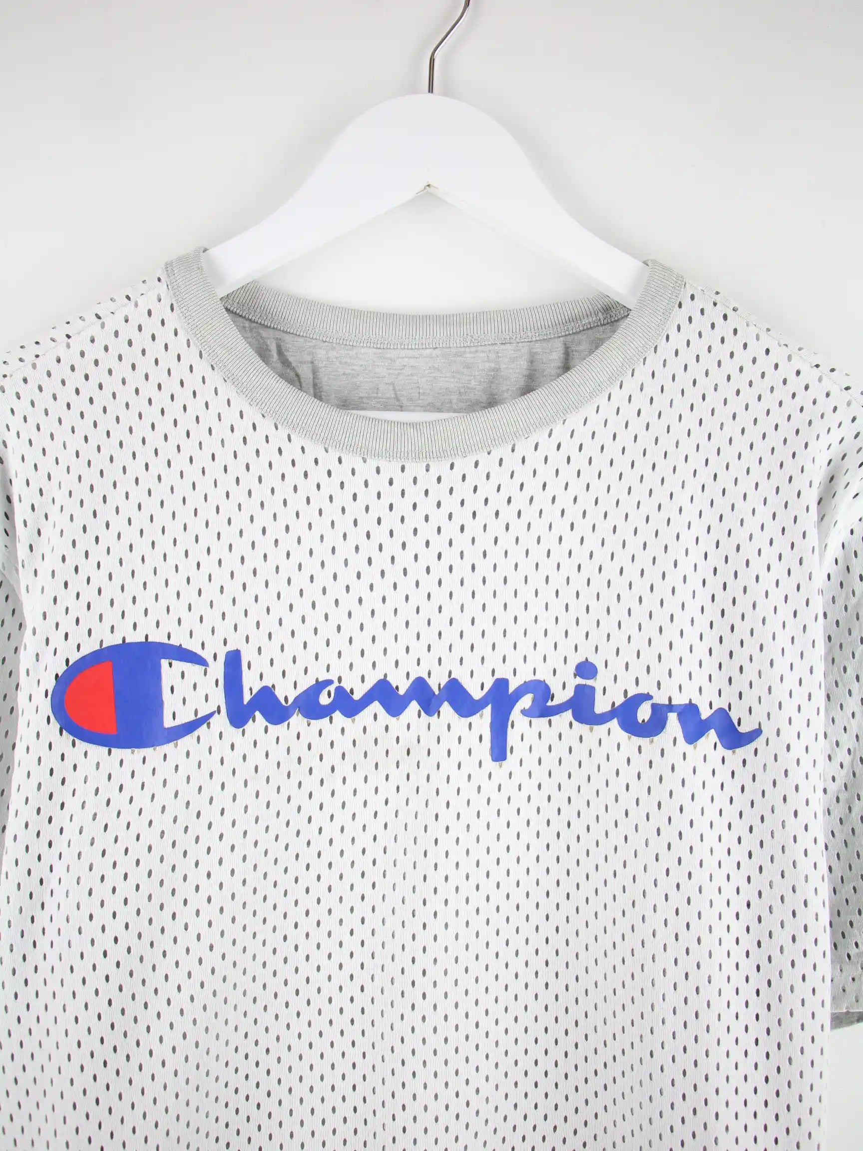 Weißes Trikot vom Label Champion in Größe L. Es ist aus Synthetik hergestellt und in gutem Zustand im Angebot.