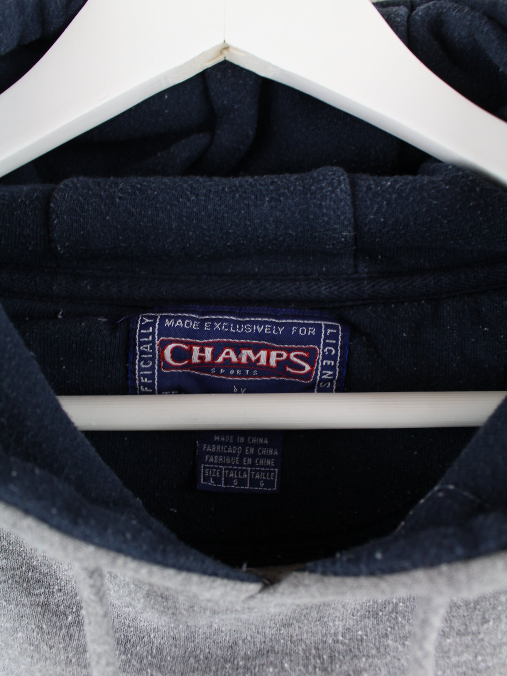 Grauer Hoodie der Marke Champs aus den 90'ern in Größe L. Er ist aus einer Baumwollmischung angefertigt und in sehr gutem Zustand im Angebot.