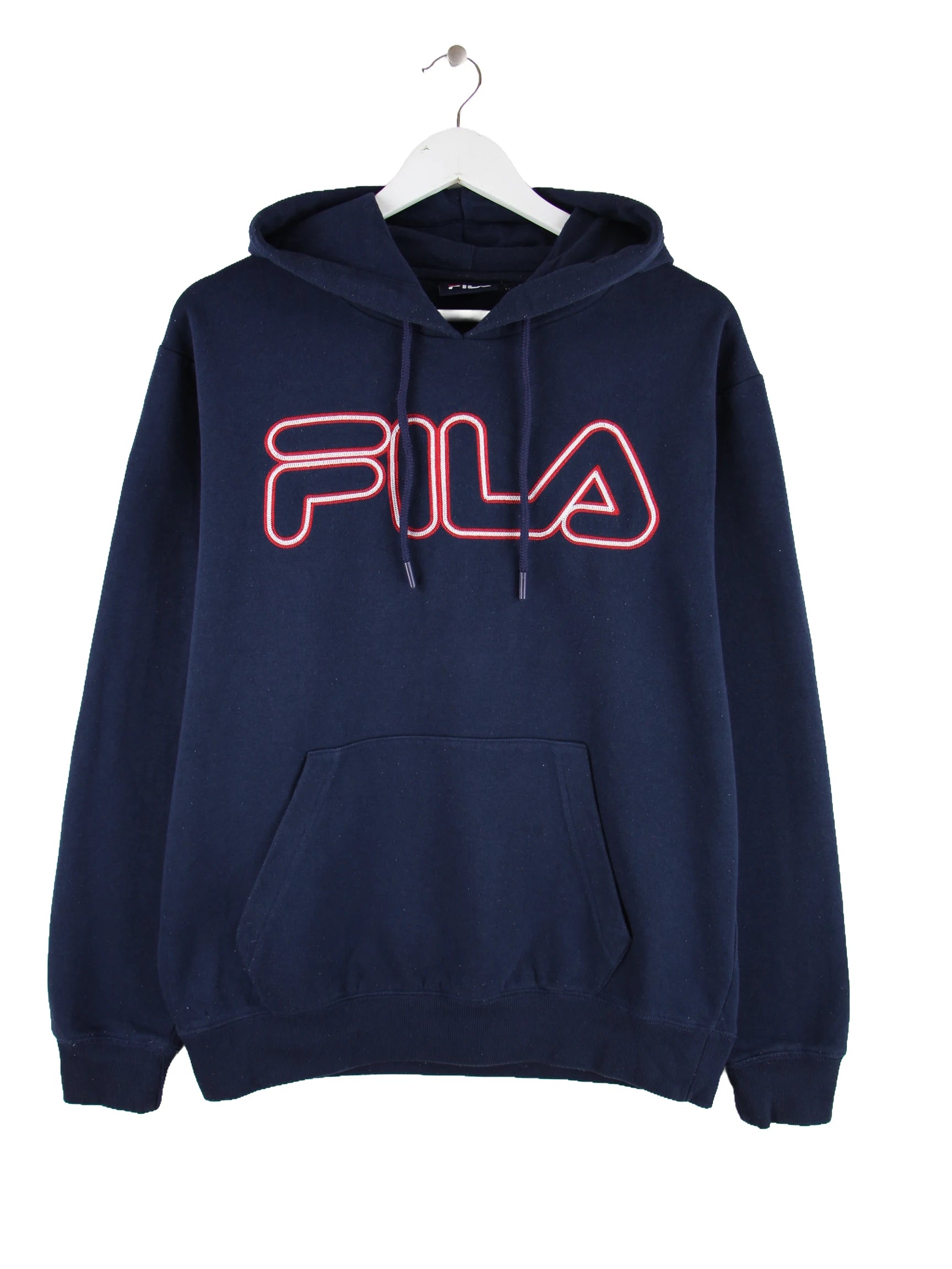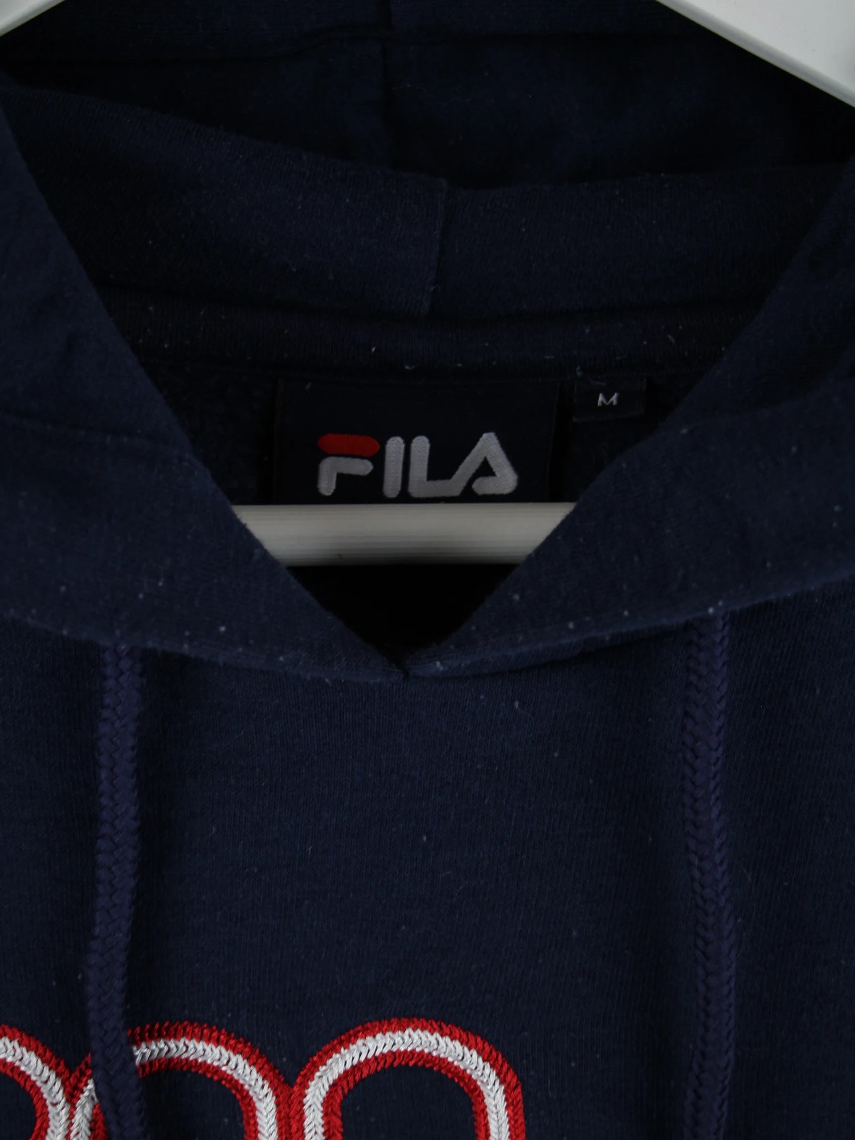 Hoodie der Marke Fila in Größe M. Er ist aus einer Baumwollmischung hergestellt und in Blau im Bestand.
