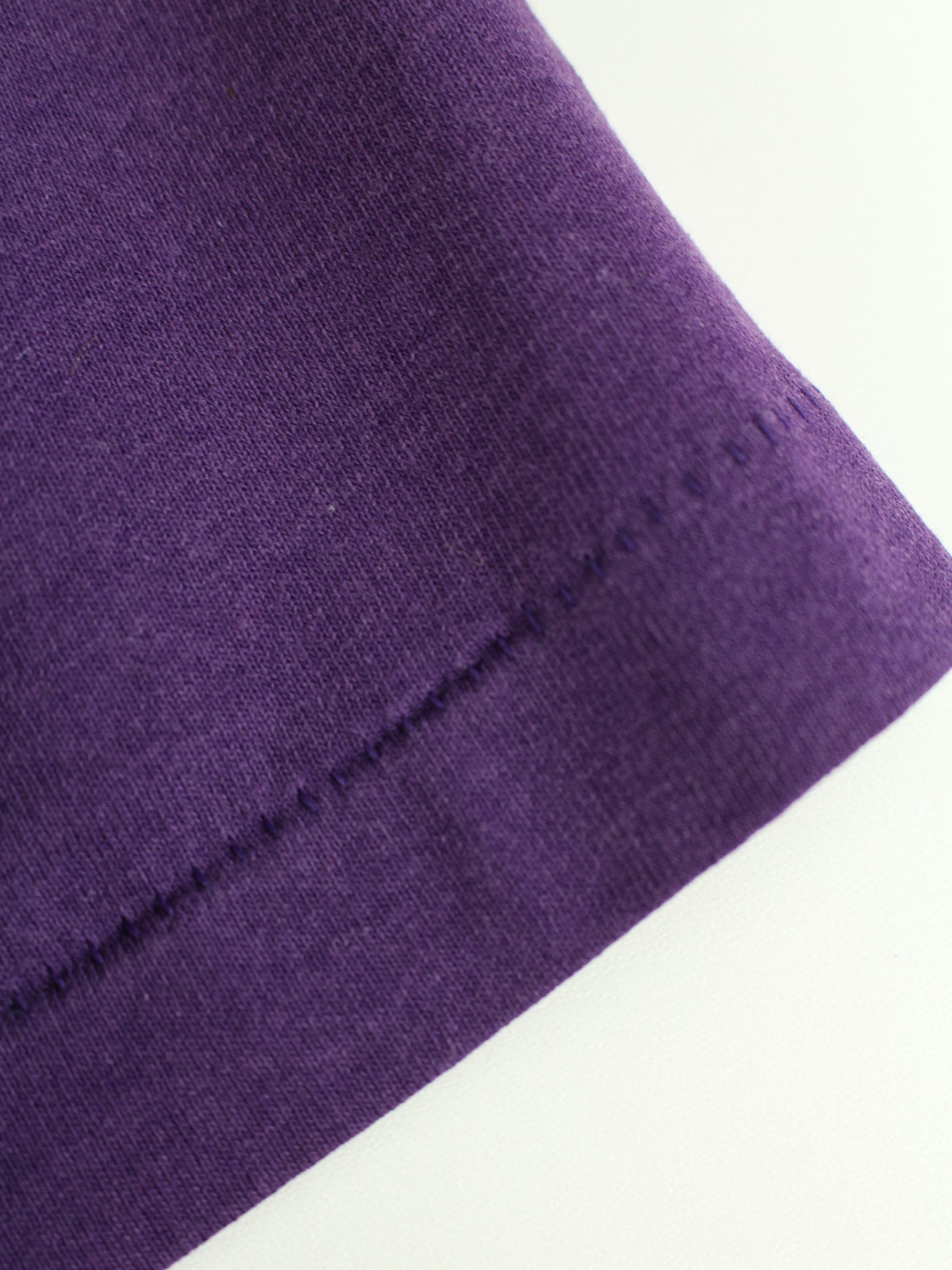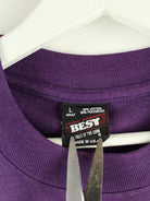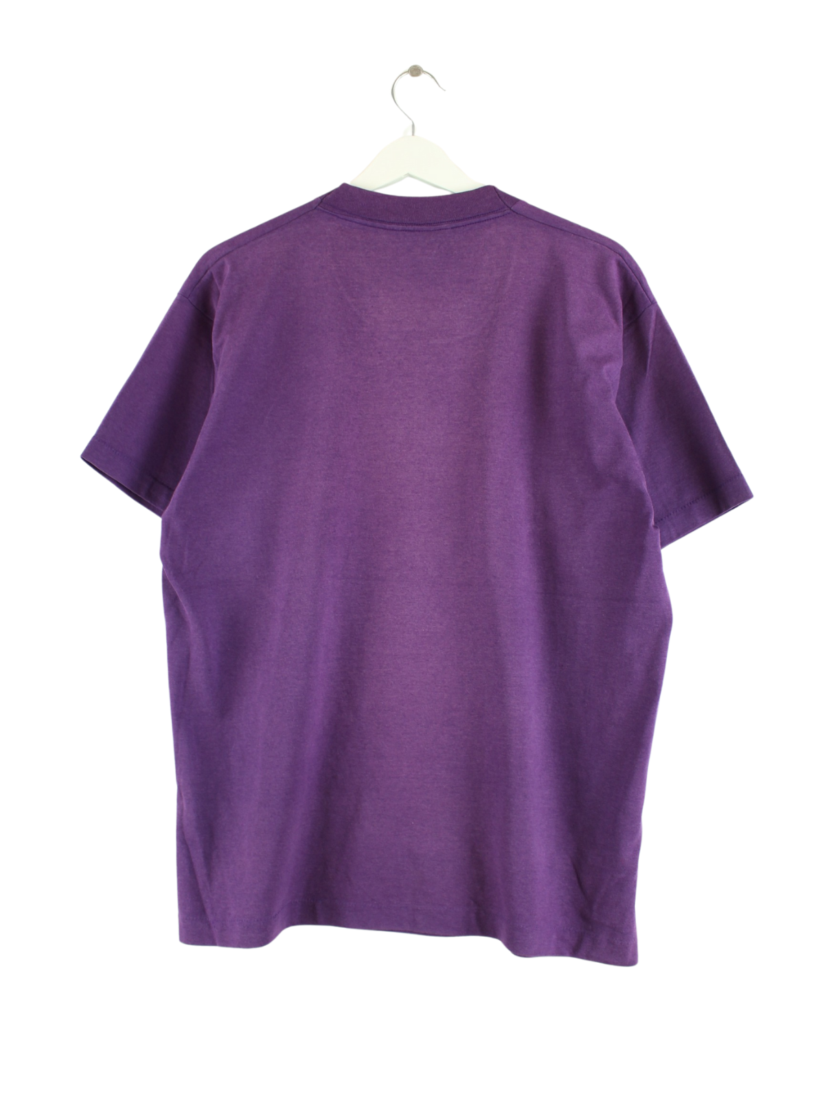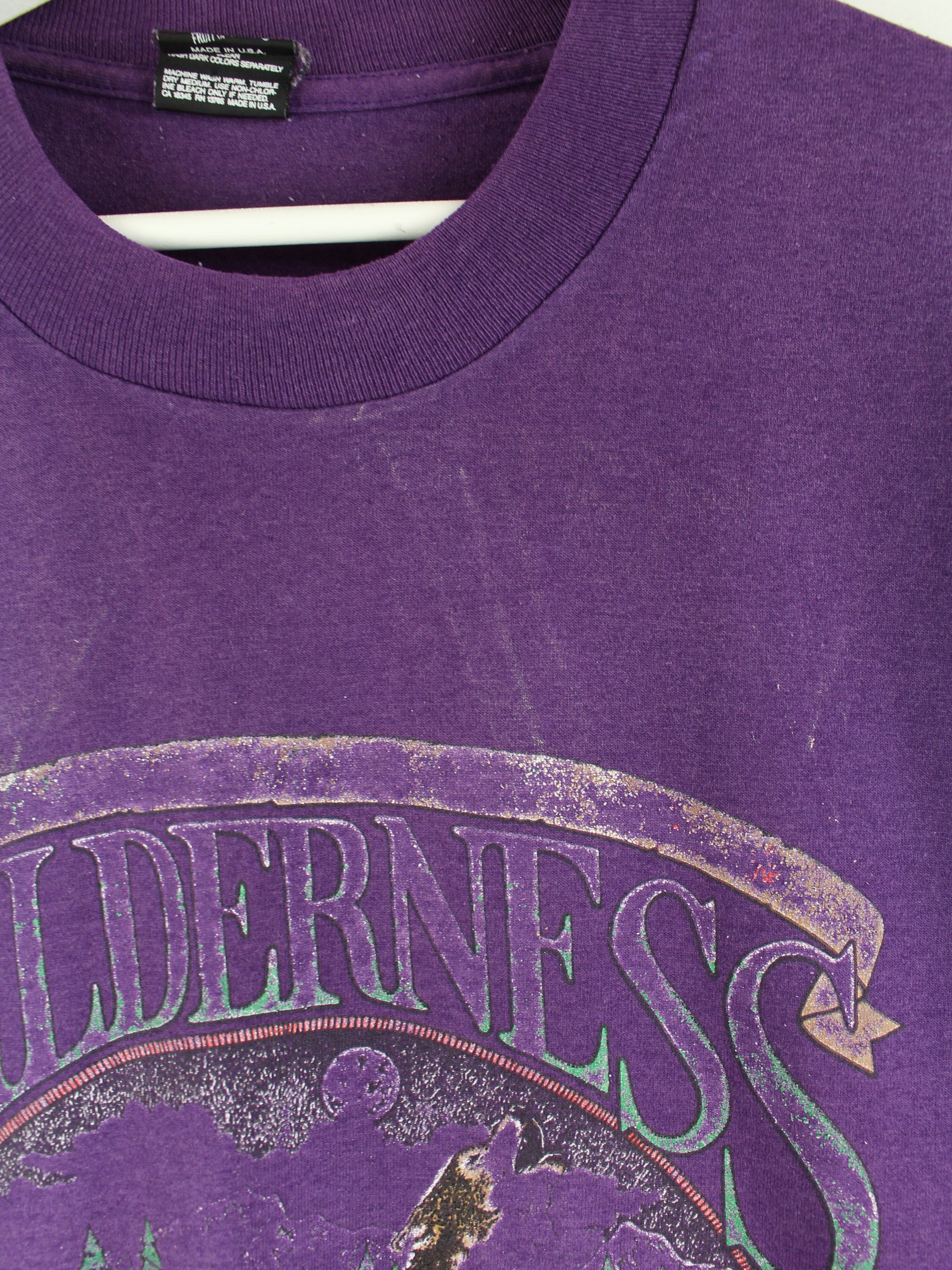 T-Shirt von Fruit of the Loom in Größe L aus den 90'ern. Es ist aus einer Baumwollmischung produziert und in Lila im Angebot. Mit schickem Wilderness Print.