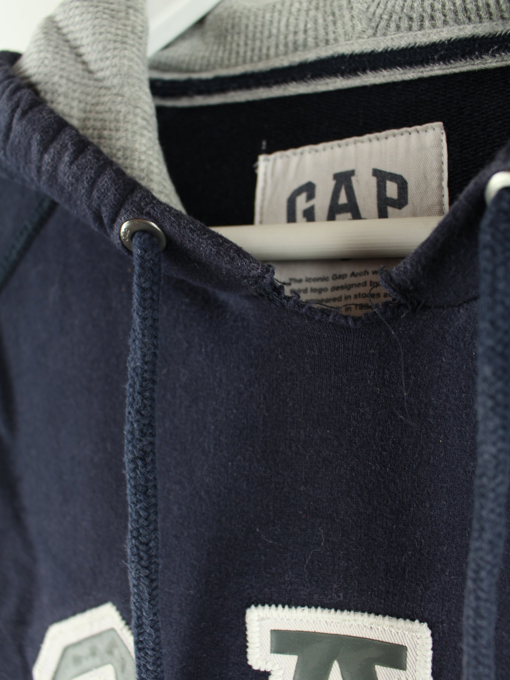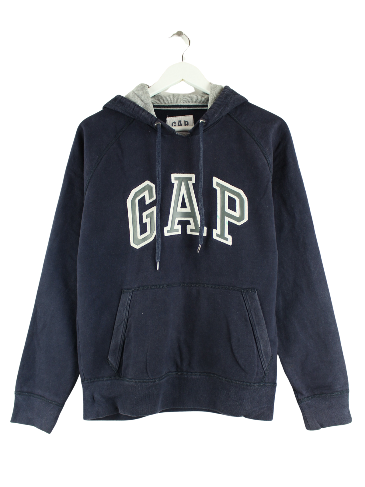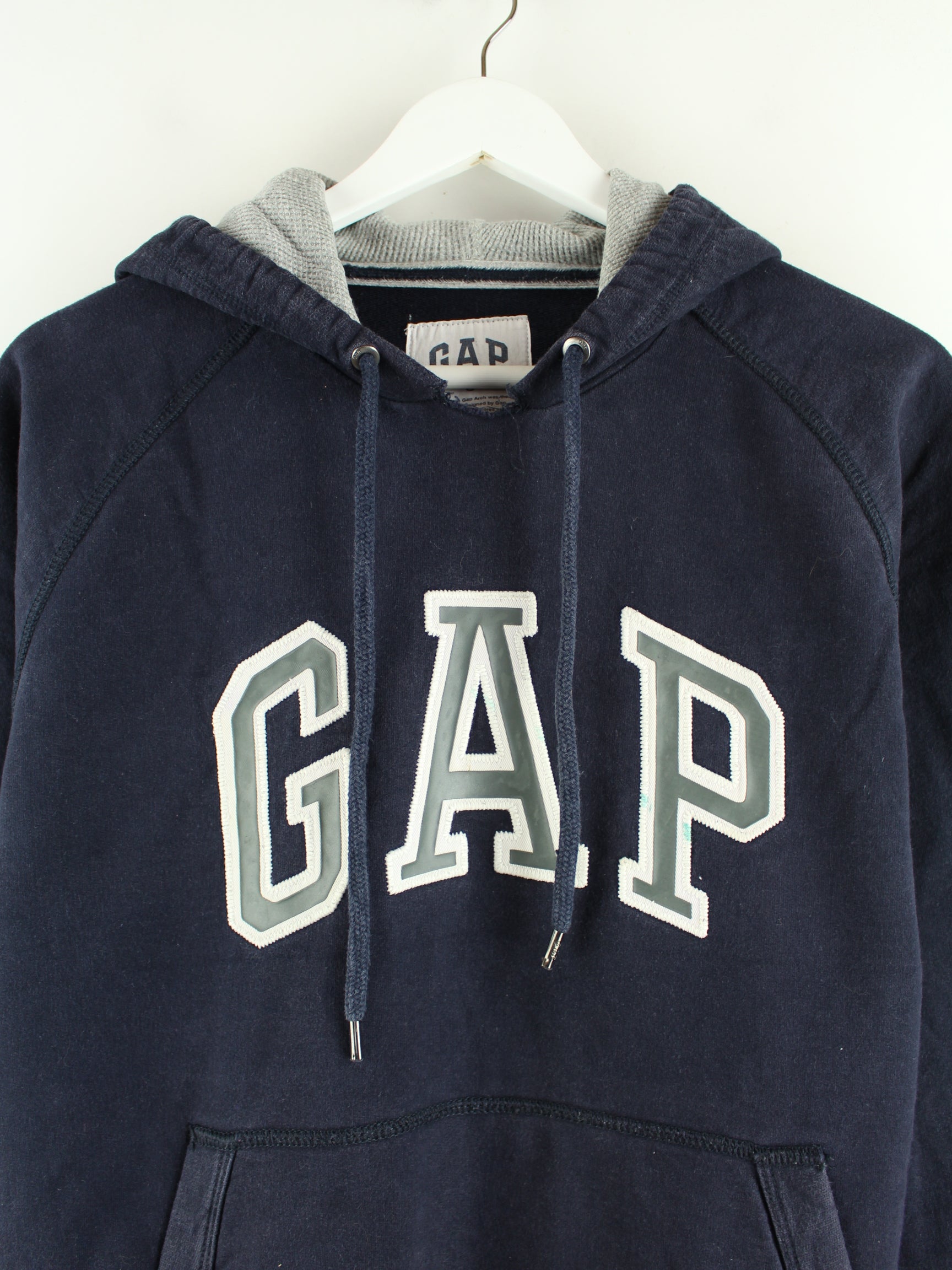Blauer Hoodie mit gesticktem Logo vom Brand GAP aus Anfang der 2000'er in Größe S. Er ist aus einer Baumwollmischung hergestellt und in gutem Zustand vorrätig.