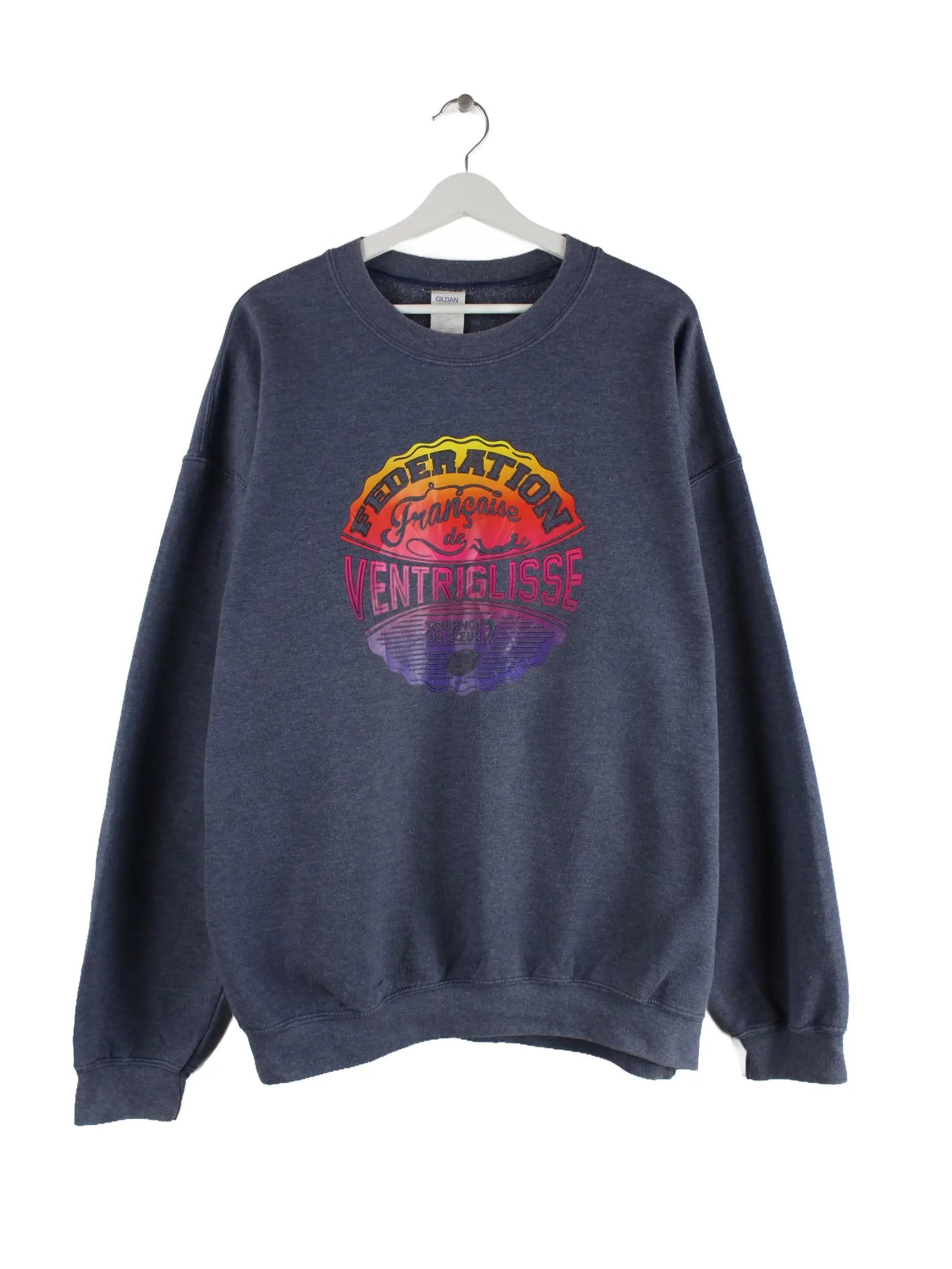 Sweater der Marke Gildan in Größe XL. Er ist aus einer Baumwollmischung hergestellt und in Grau in Stock. Mit schickem Ventriglisse Print.