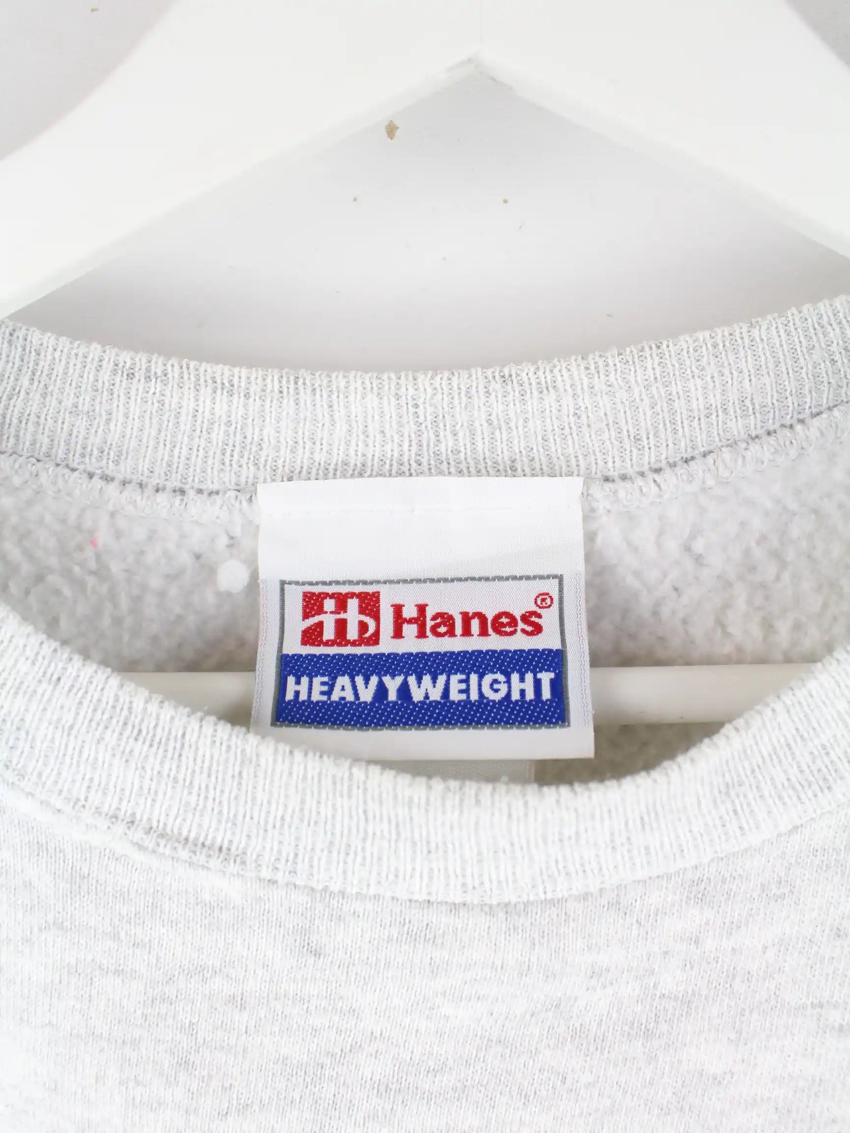 Grauer Sweater mit Stick von Hanes aus den 80'ern in Größe S. Er ist aus einer Baumwollmischung angefertigt und in gutem Zustand lieferbar.