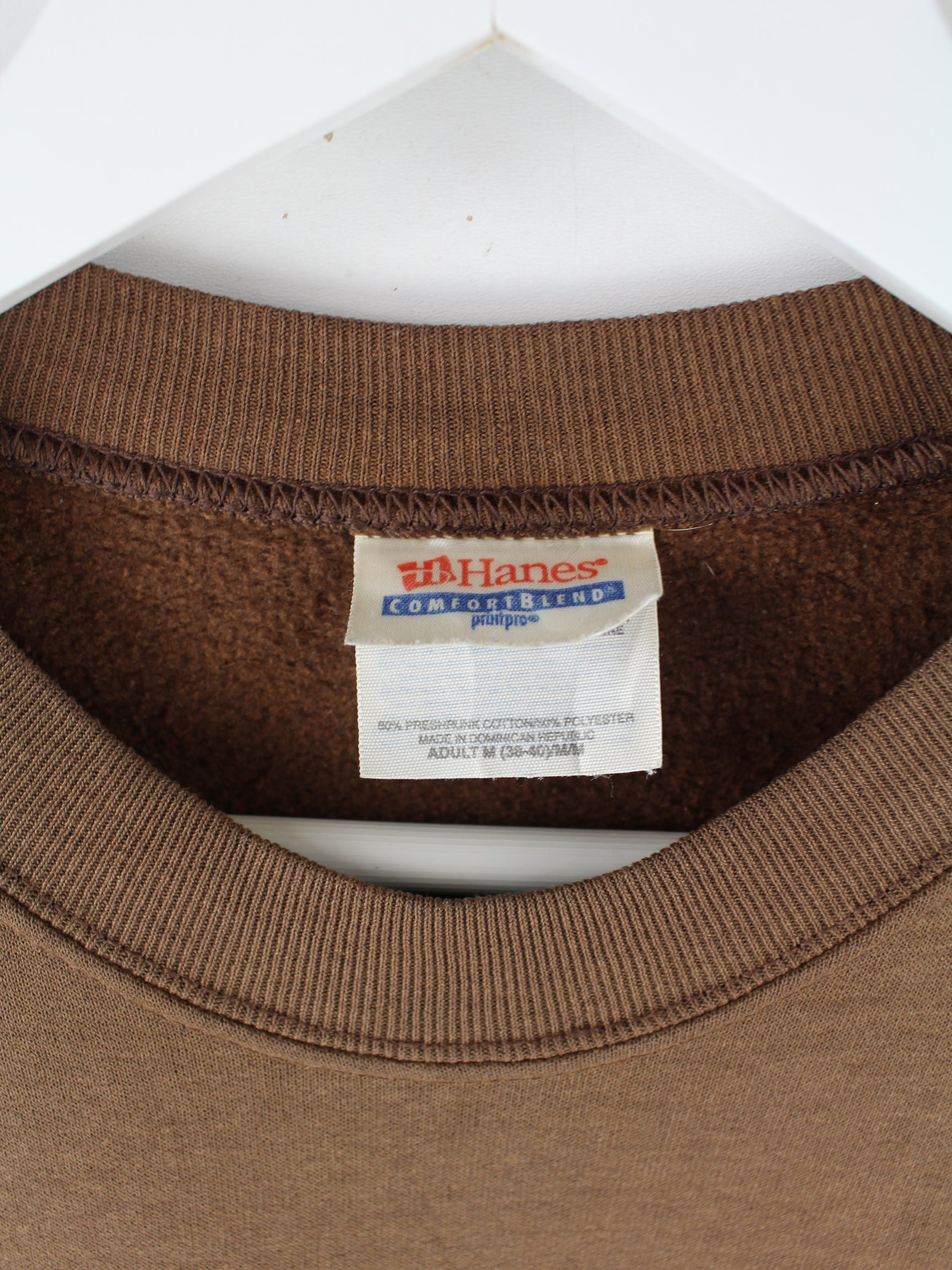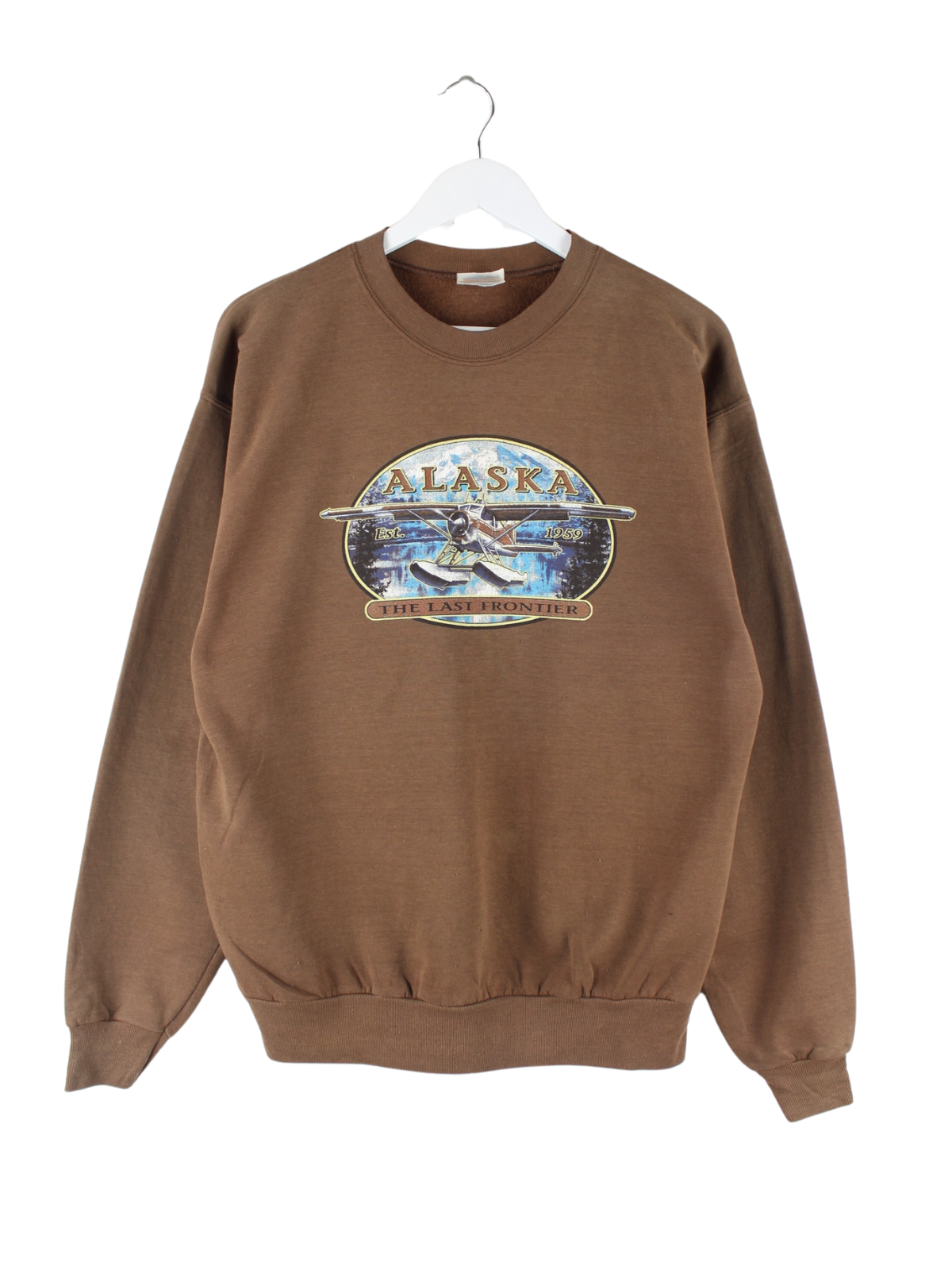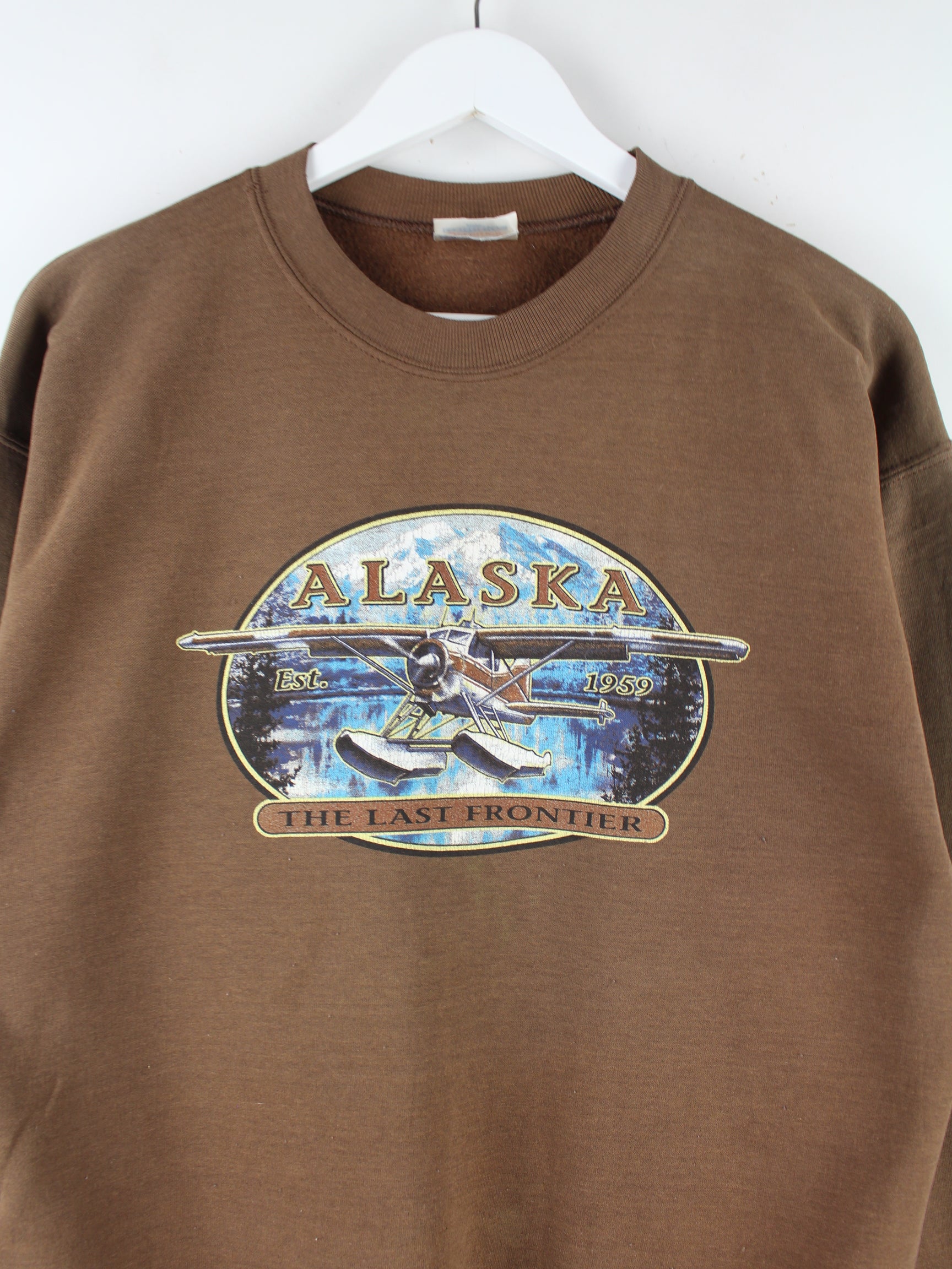 Sweater vom Brand Hanes in Größe M aus den 90'ern. Er ist aus einer Baumwollmischung gemacht und in Braun vorrätig. Mit tollem Alaska Print.