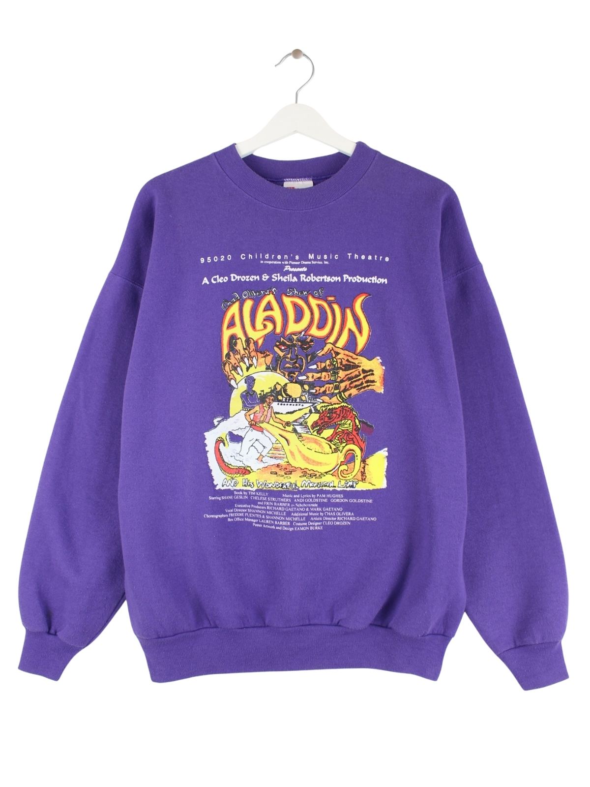 Lilafarbener Sweater aus dem Hause Hanes aus den 90'ern in Größe L. Er ist aus einer Baumwollmischung gemacht und in sehr gutem Zustand bei uns vorrätig. Mit schickem Alladin Print.