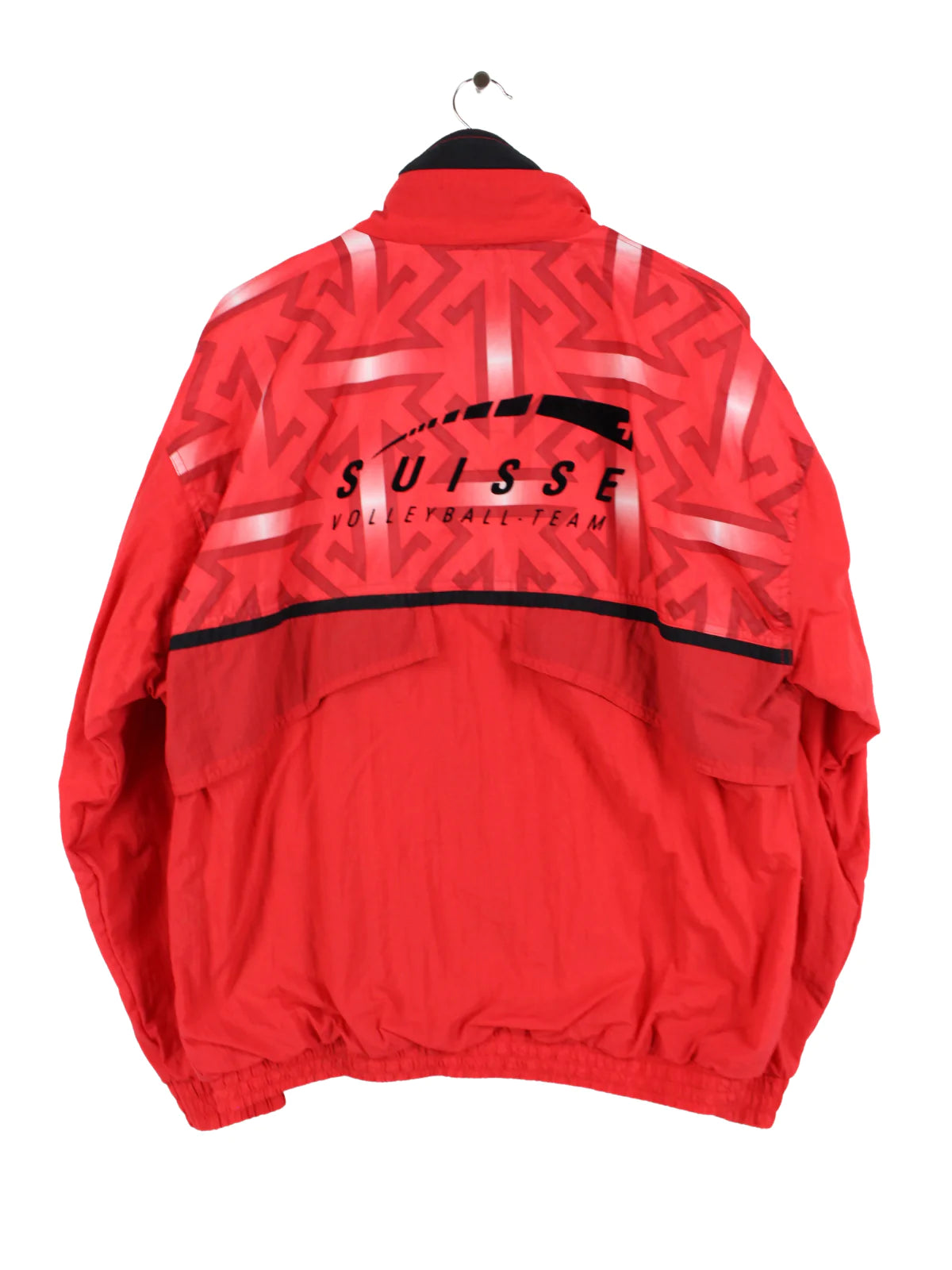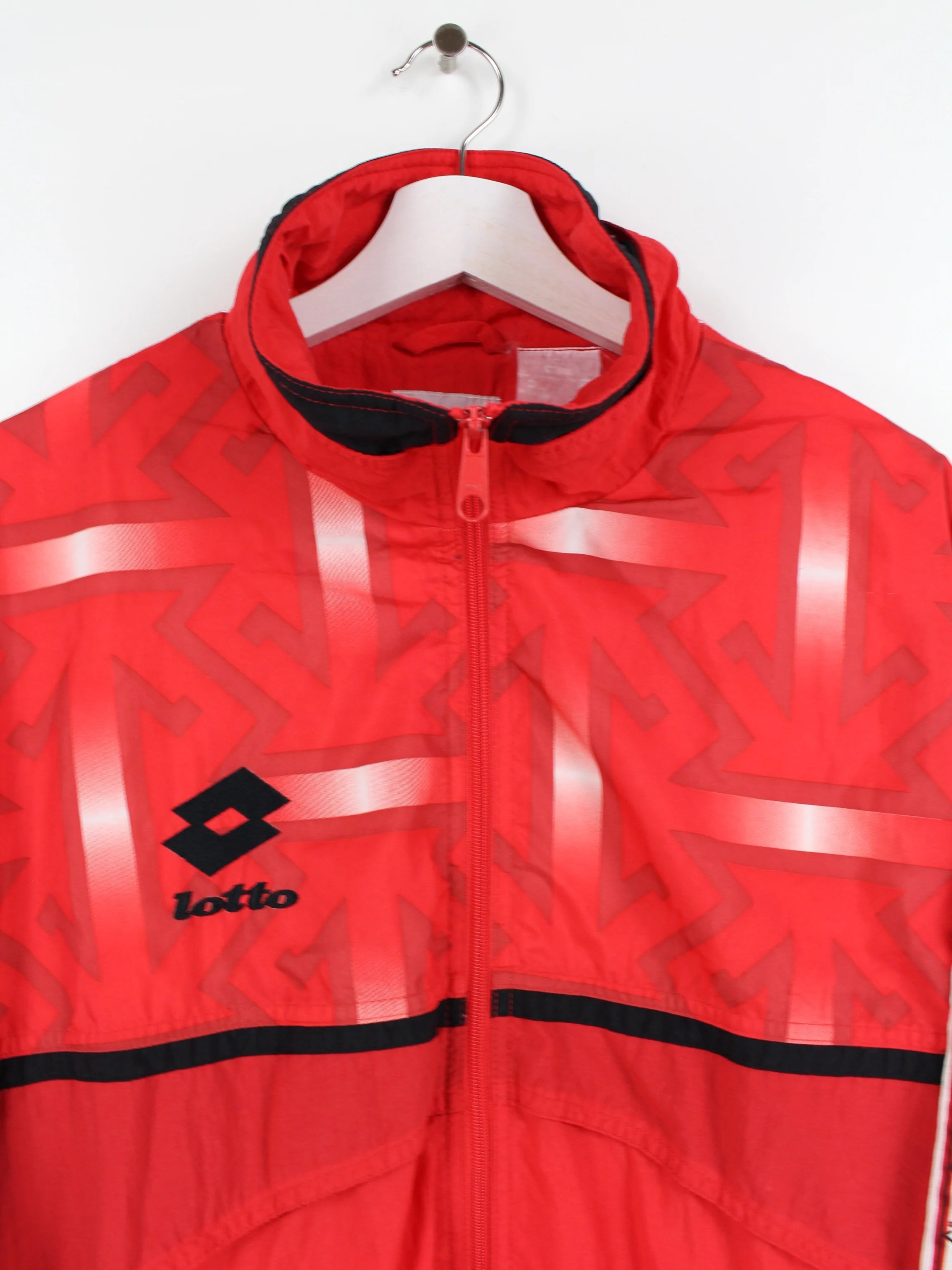 Veste de survêtement Lotto rouge avec bandes sur les manches.