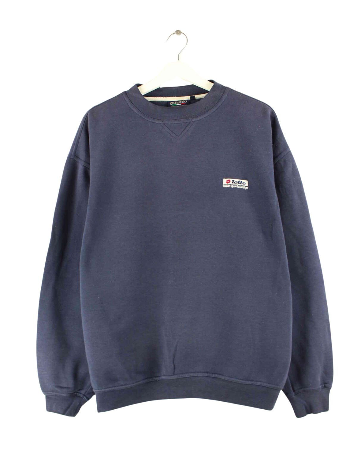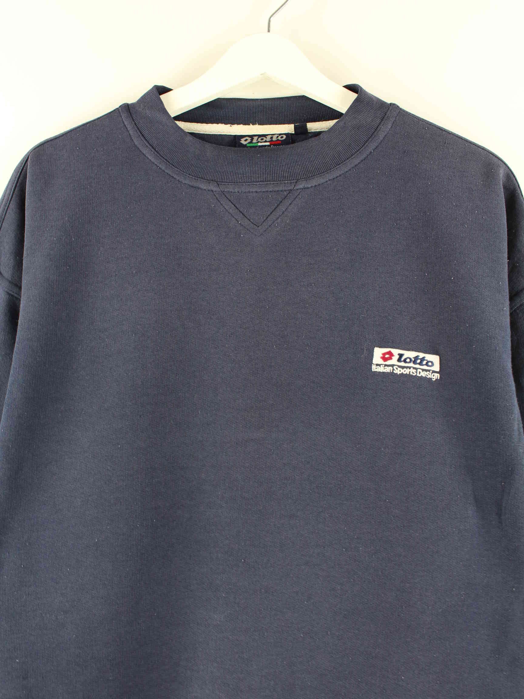 Blauer Sweater mit gesticktem Logo der Marke Lotto aus Anfang der 2000'er in Größe M. Er ist aus einer Baumwollmischung und in sehr gutem Zustand vorrätig.