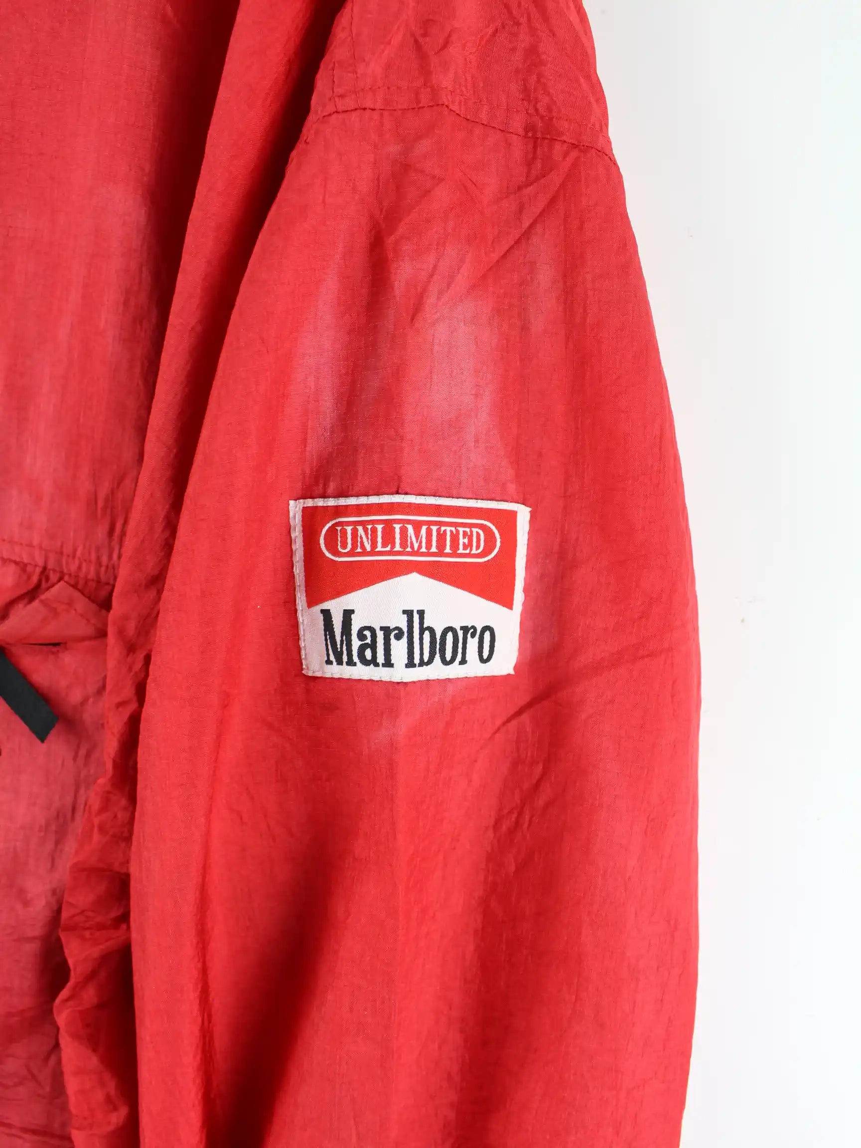 Windbreaker vom Label Marlboro in Größe 3XL aus den 80'ern. Er ist aus Synthetik gefertigt und in Rot zu bekommen.