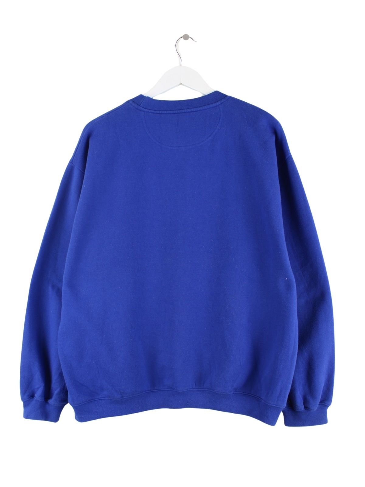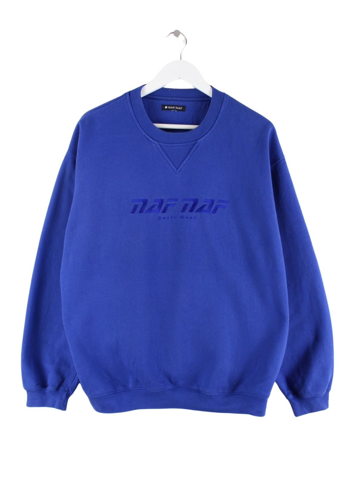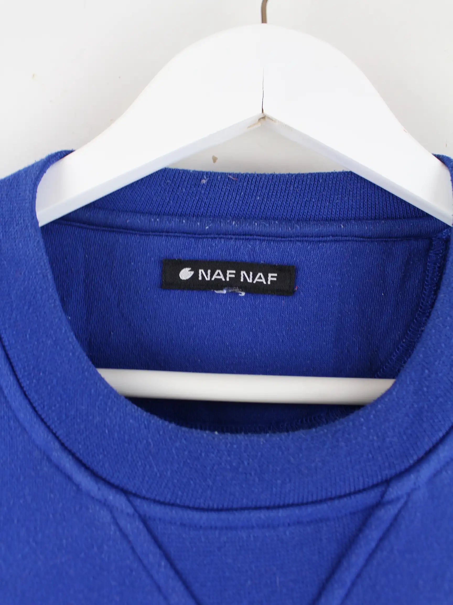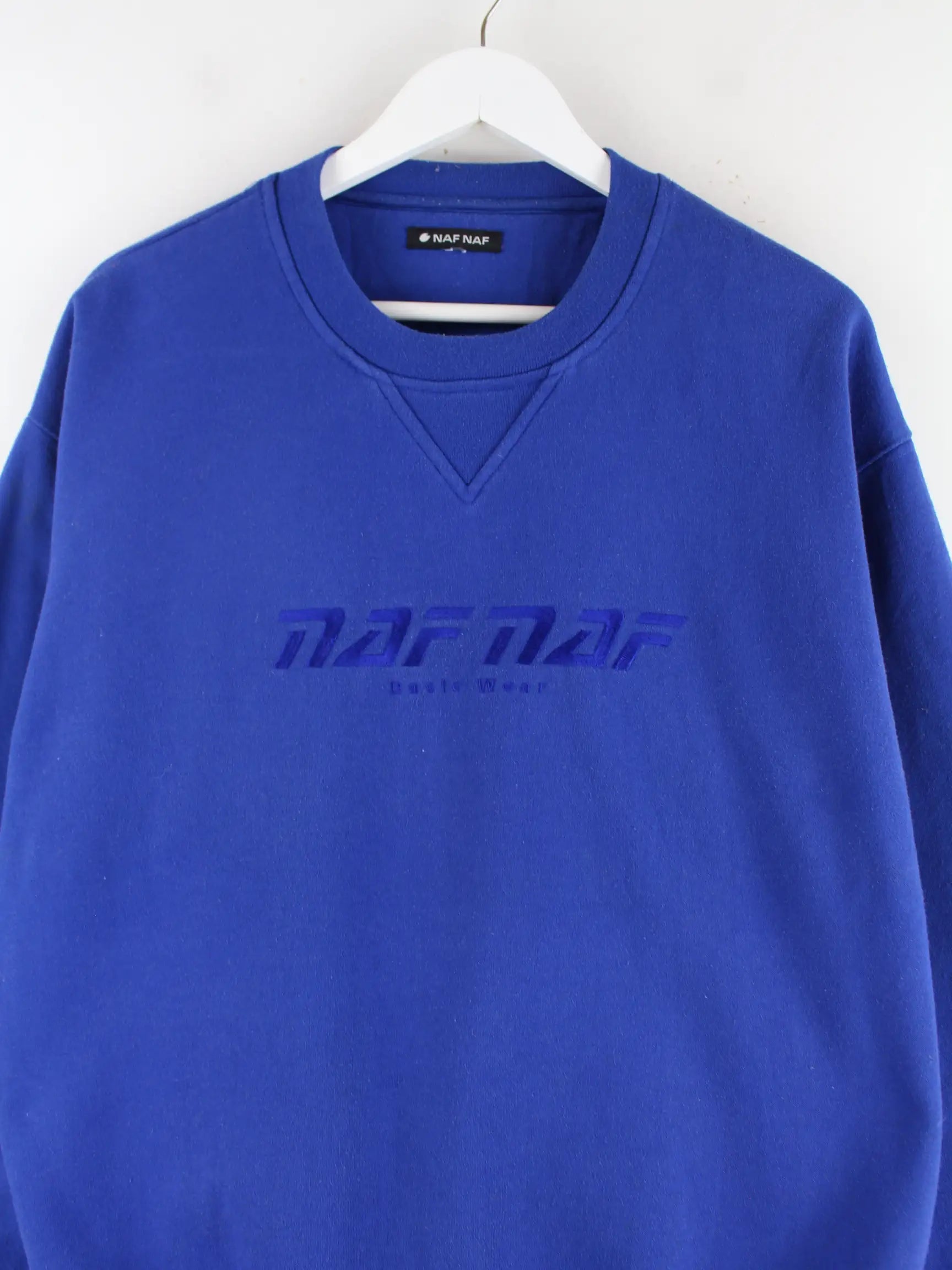 Sweater der Marke Naf Naf mit Stickereien in Größe XL. Er ist aus einer Baumwollmischung produziert und in Blau zu haben.