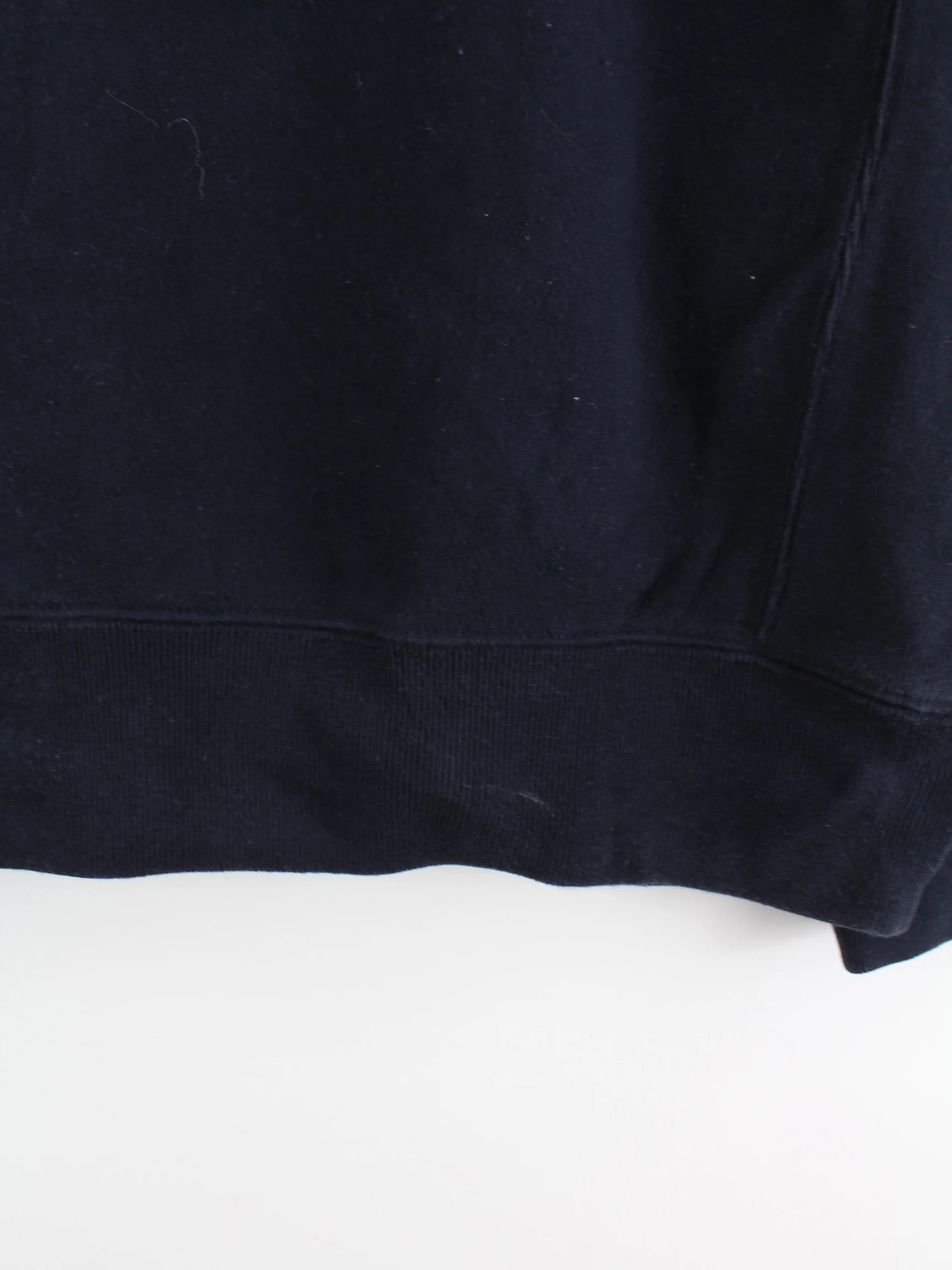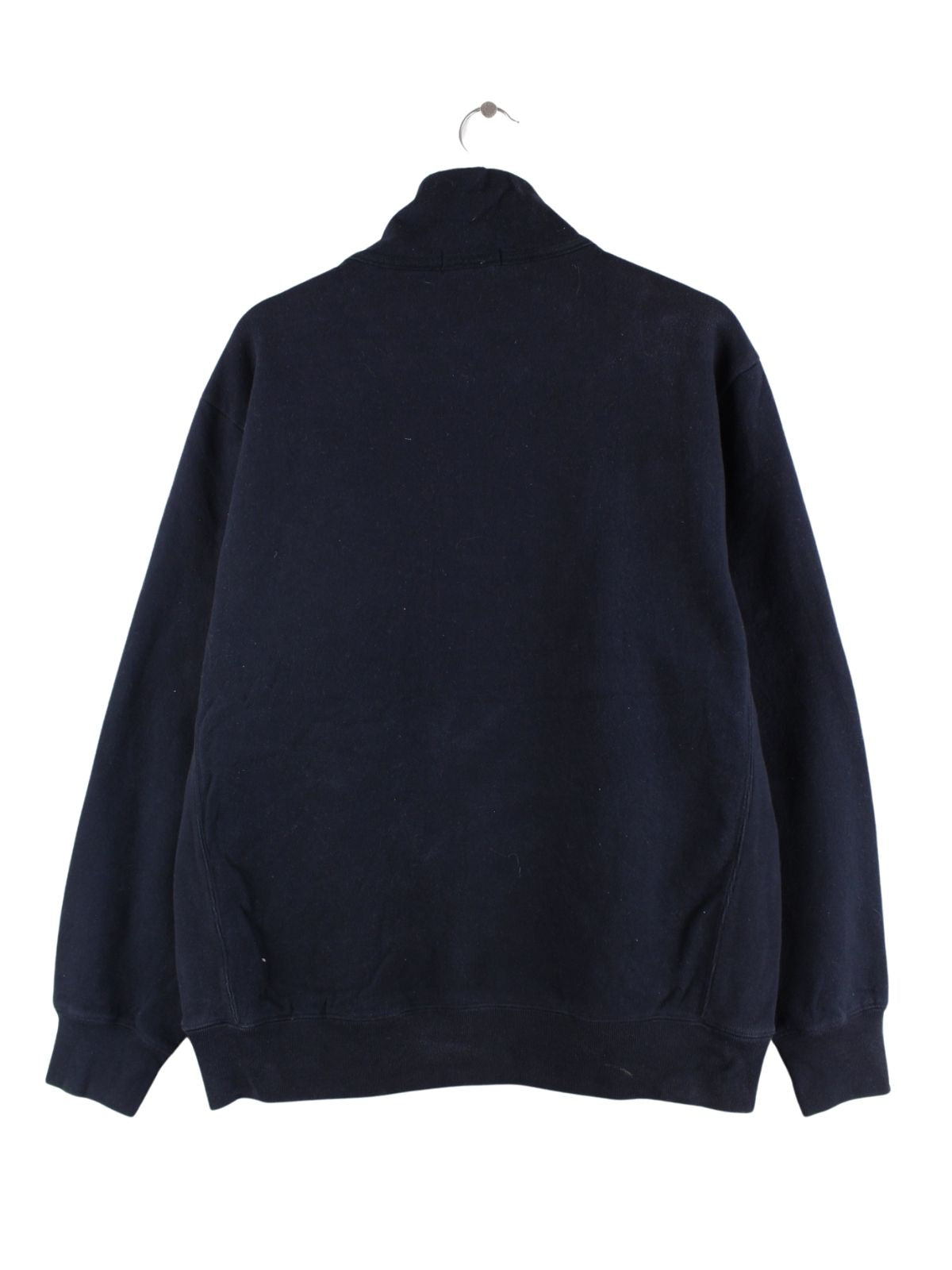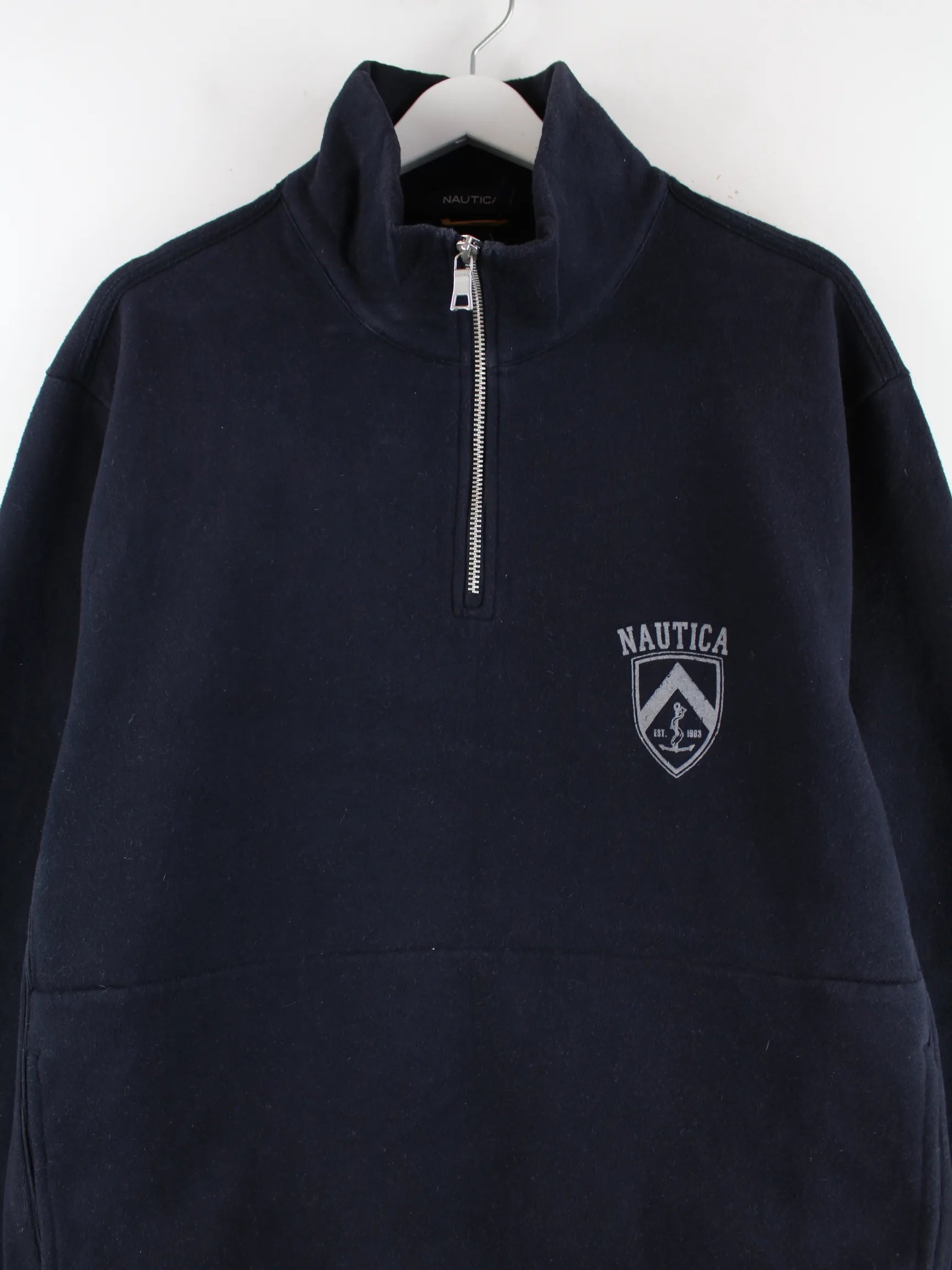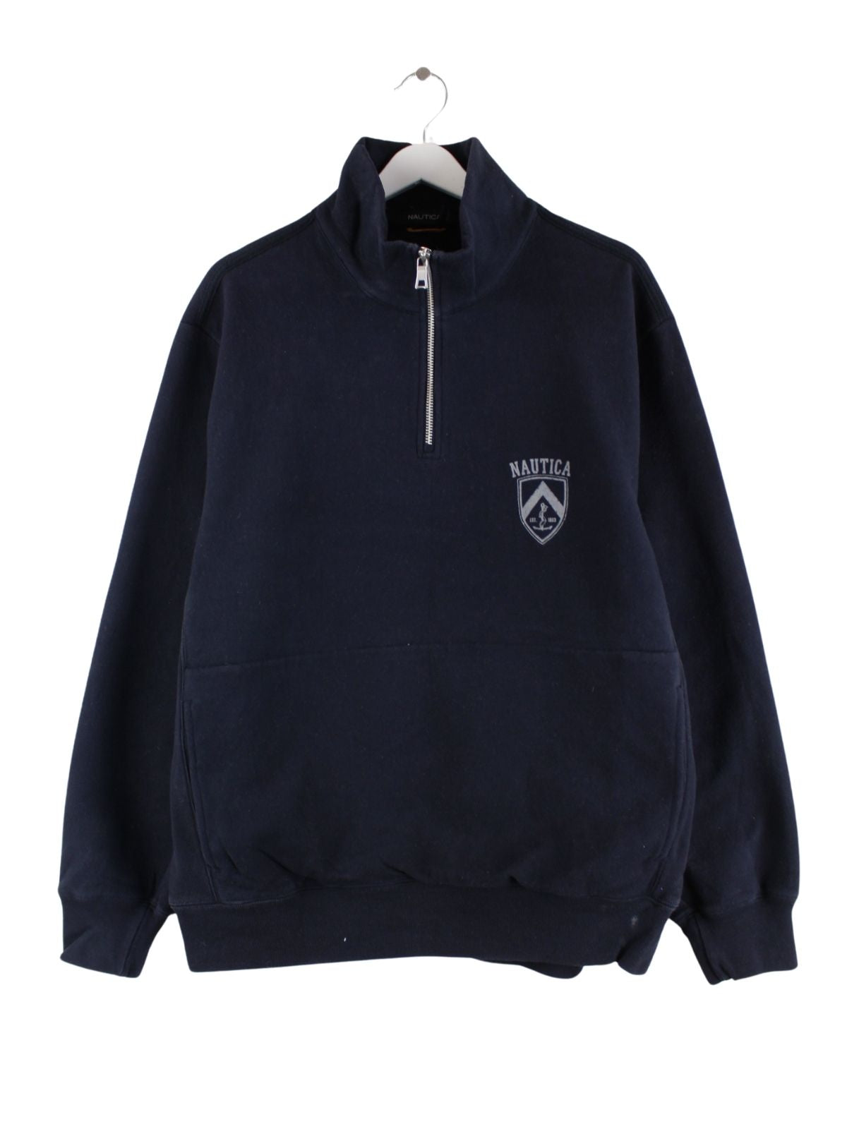 Schwarzer Sweater mit halbem Reißverschluß des Labels Nautica in Größe L. Er ist aus einer Baumwollmischung produziert und in gutem Zustand bei uns zu bekommen. Mit seltenem undefined Print.
