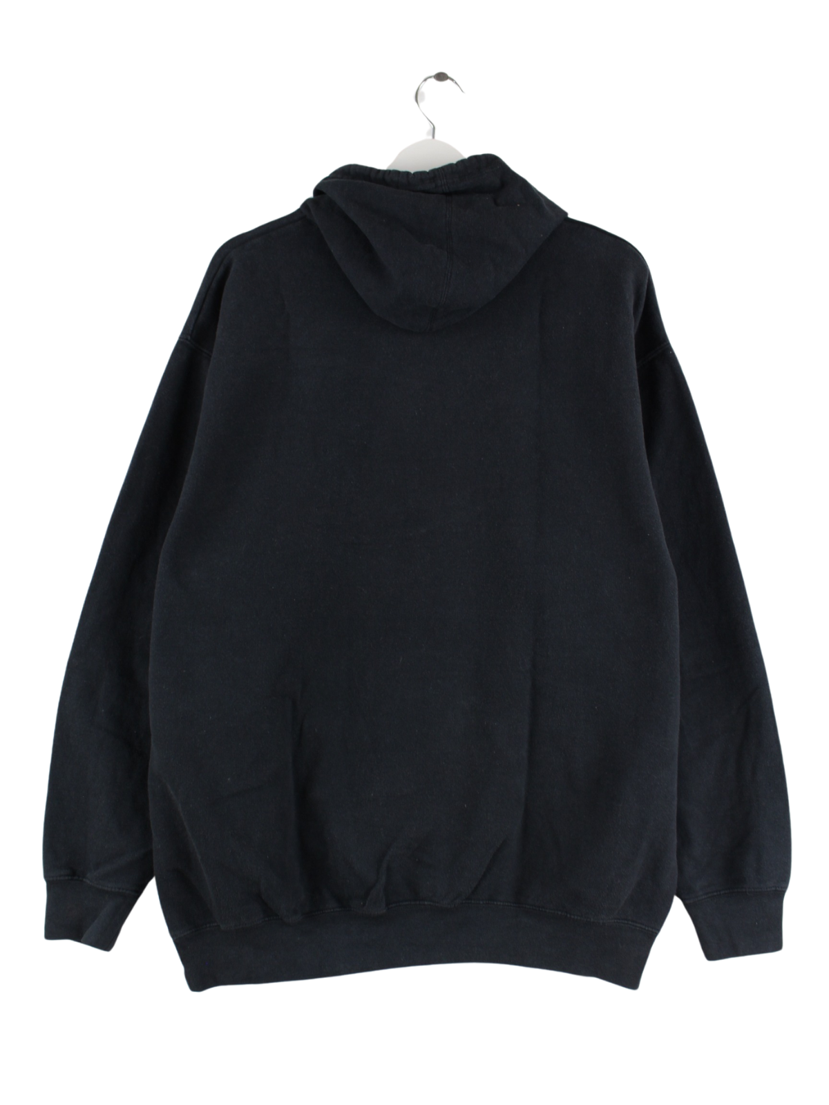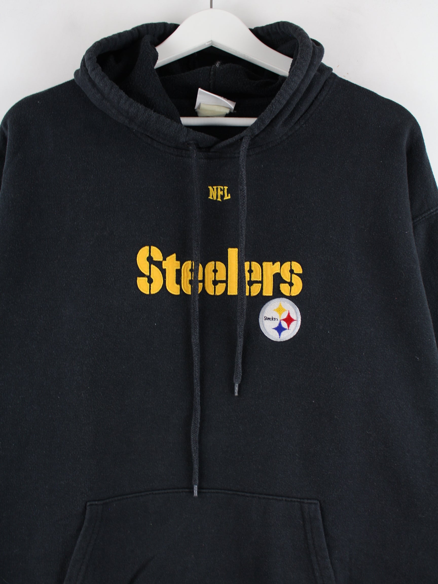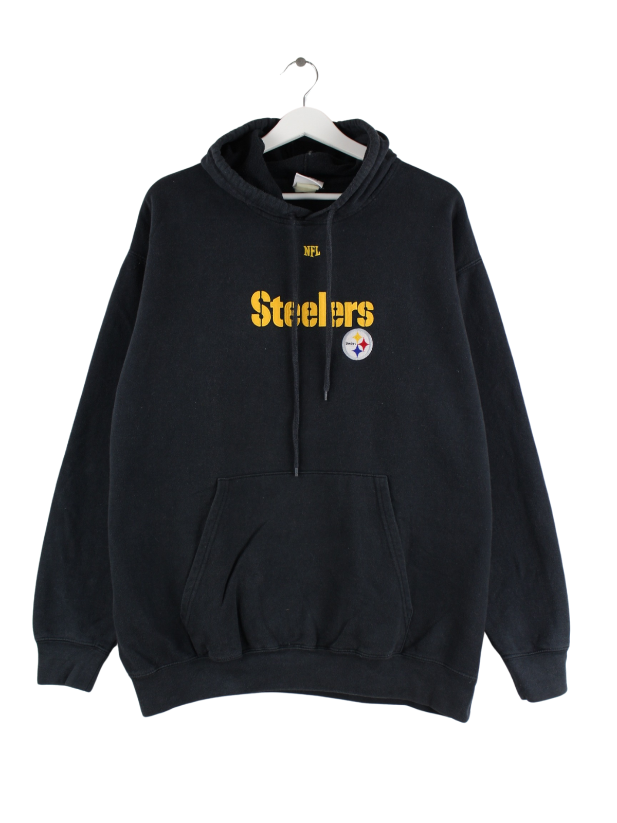 Schwarzer Hoodie mit gesticktem Logo der Marke NFL in Größe L. Er ist aus einer Baumwollmischung und in gutem Zustand vorrätig.