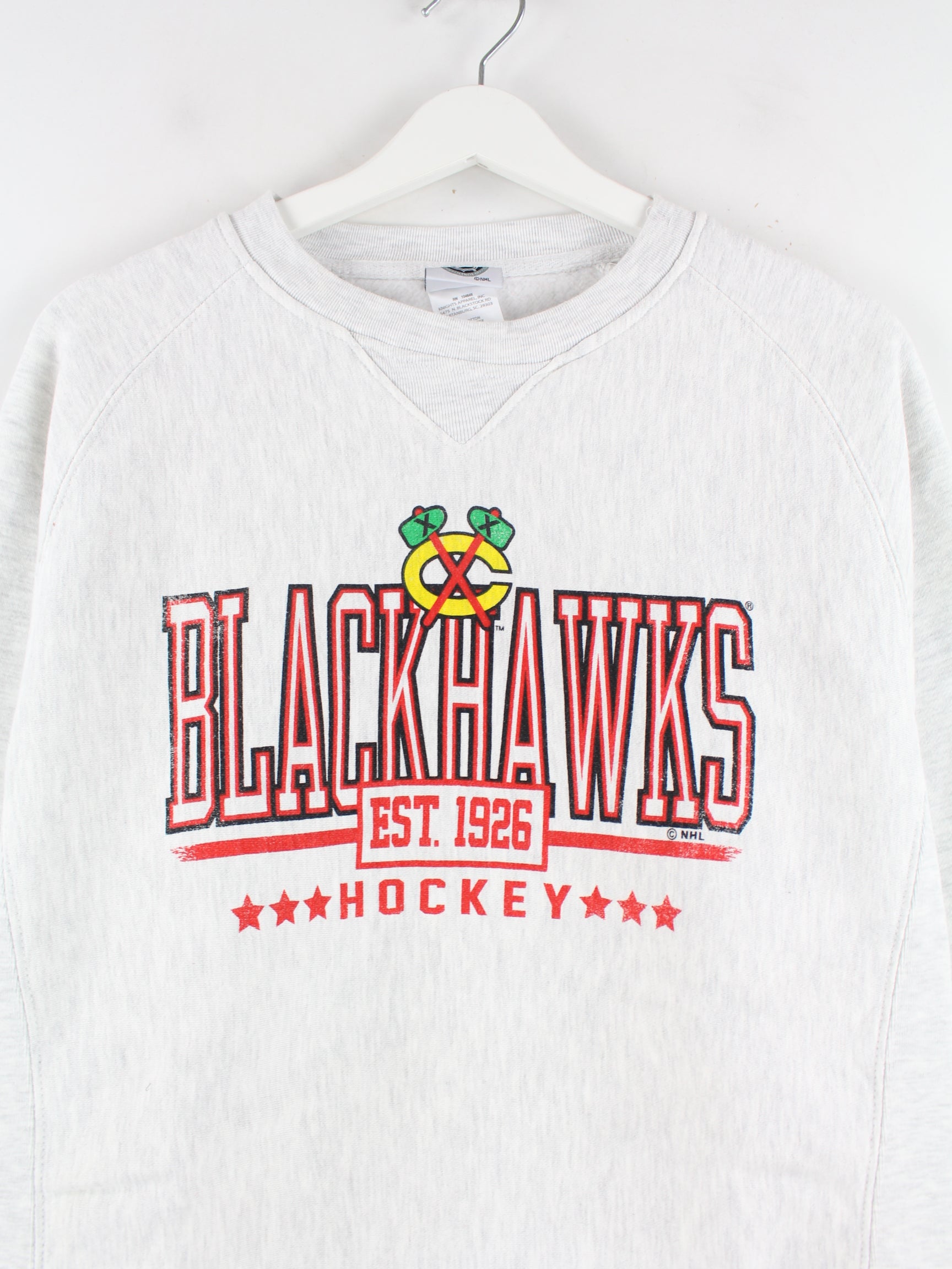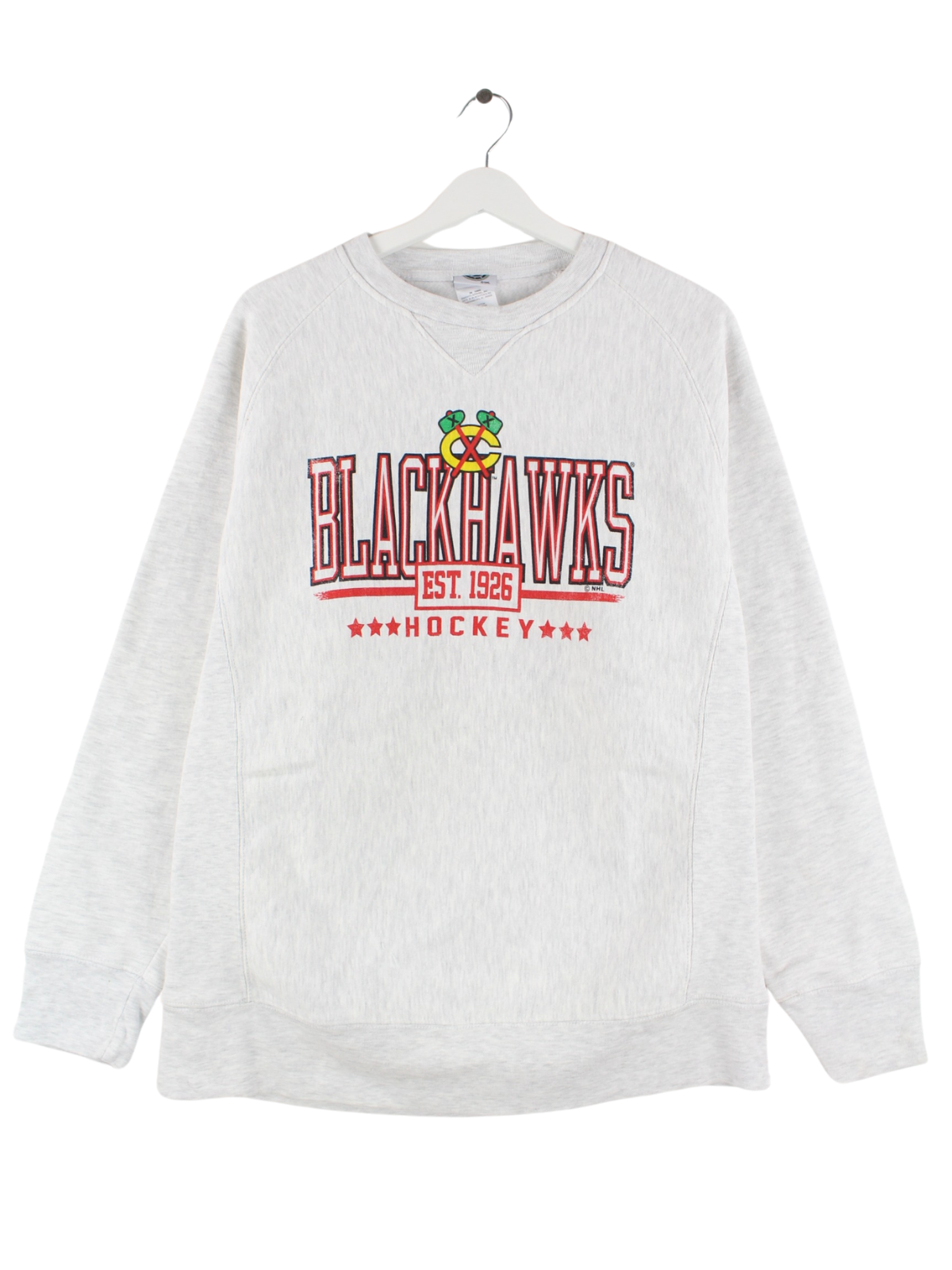 Grauer Sweater der Marke NHL in Größe L. Er ist aus einer Baumwollmischung hergestellt und in sehr gutem Zustand im Bestand.