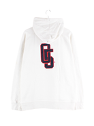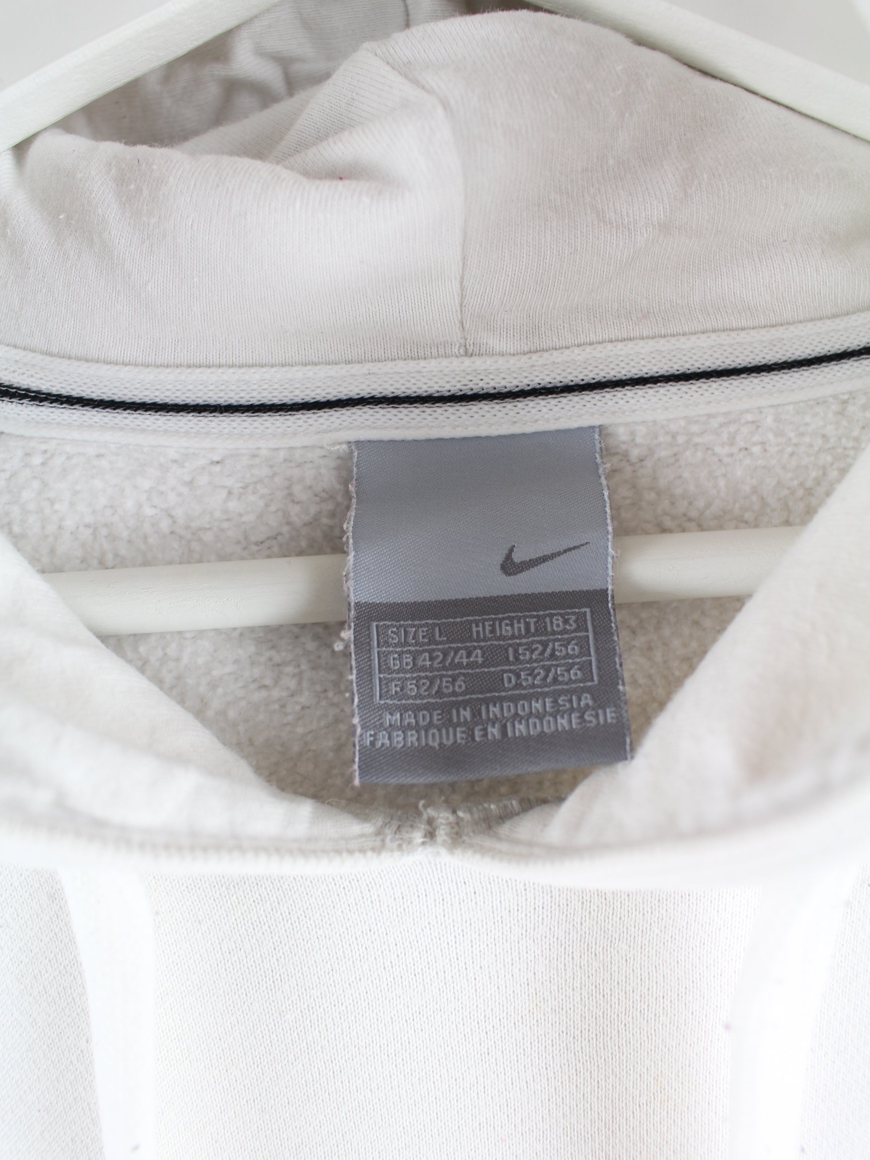Hoodie der Marke Nike mit gestickten Motiven in Größe L. Er ist aus einer Baumwollmischung gemacht und in Weiß lieferbar.