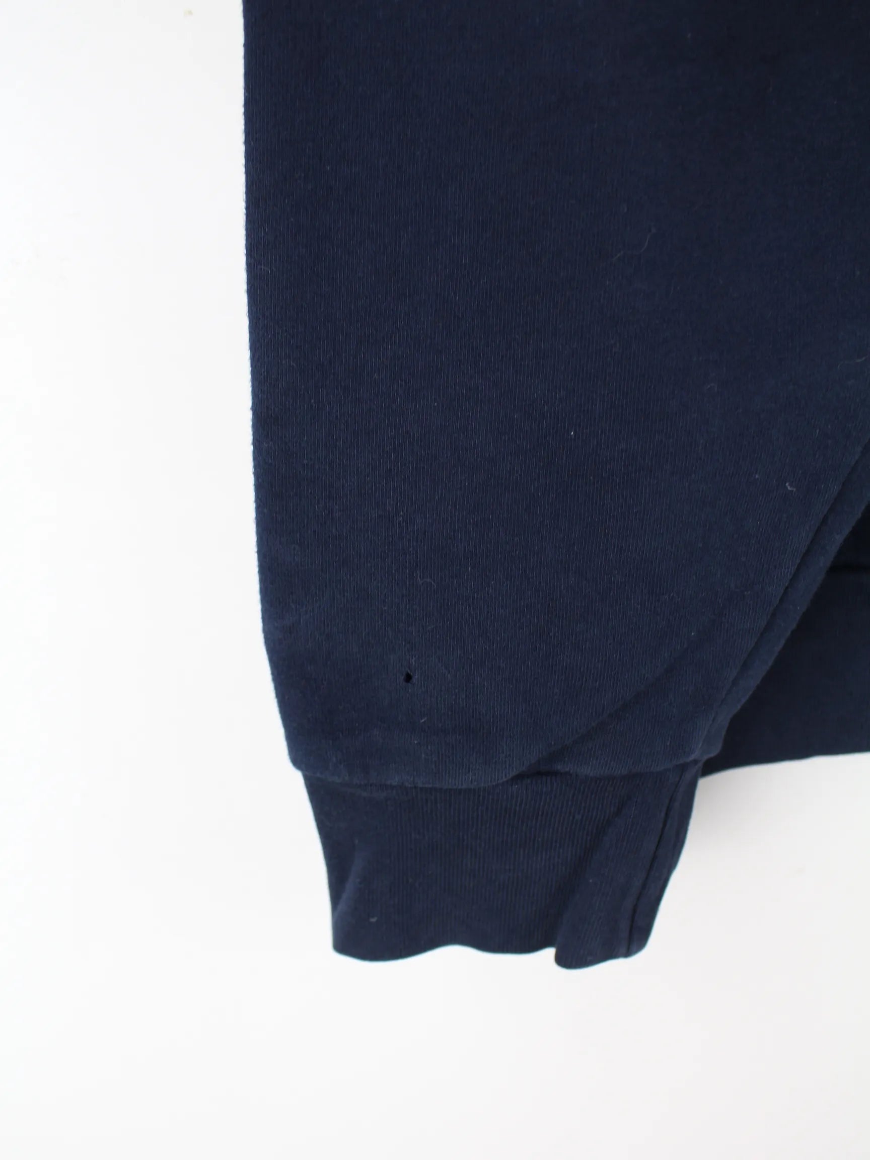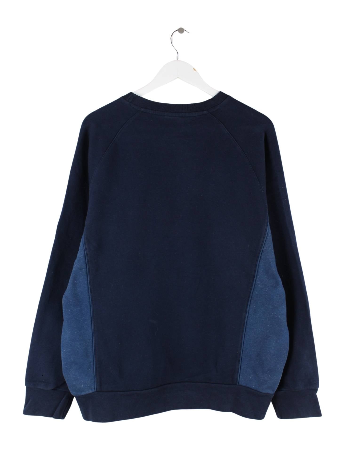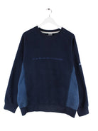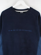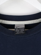 Blauer Sweater mit gestickten Motiven vom Label Nike in Größe L. Er ist aus einer Baumwollmischung hergestellt und in gutem Zustand in Stock.