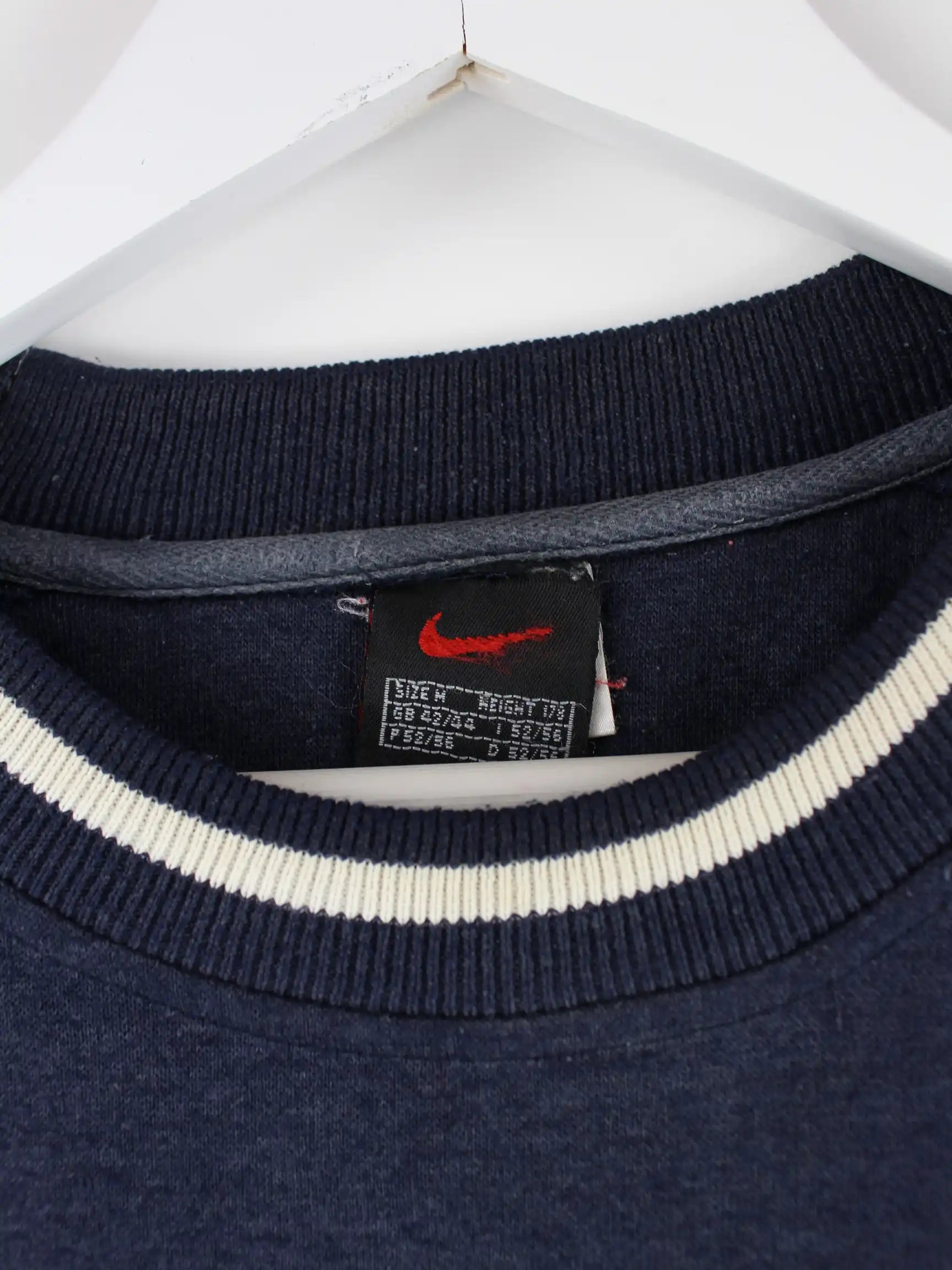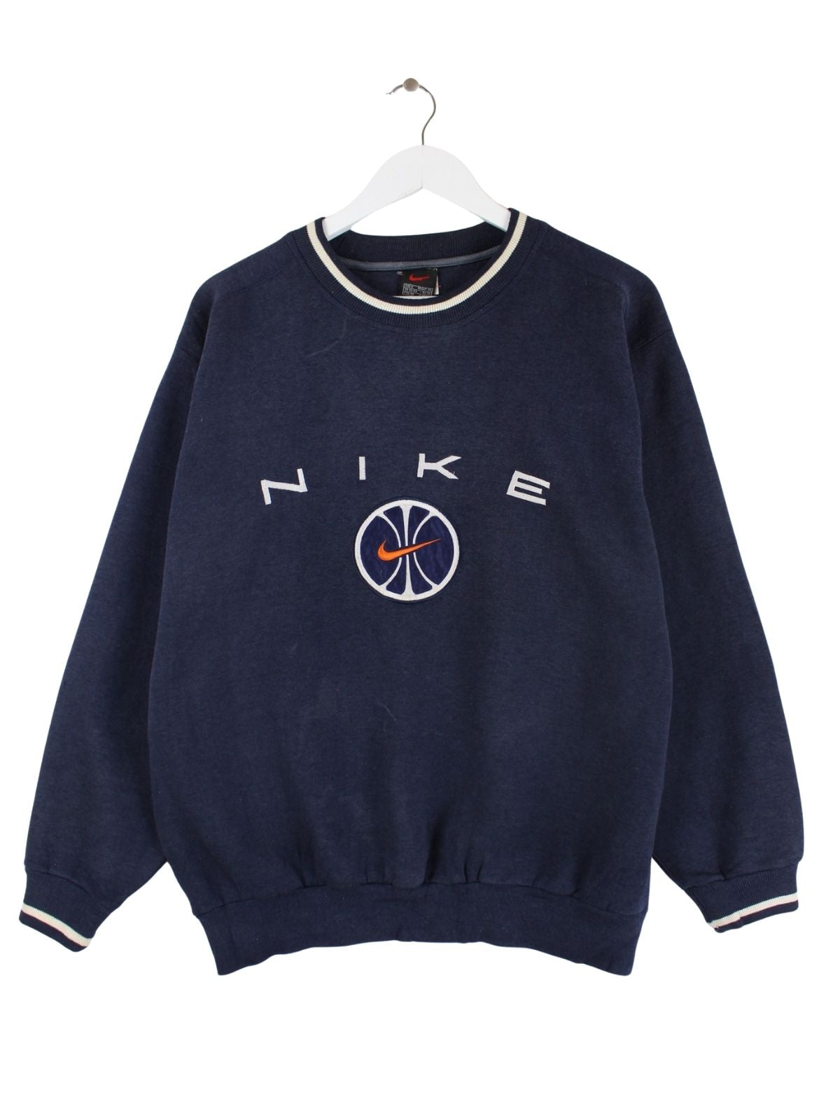 Blauer Sweater vom Brand Nike in Größe M. Er ist aus einer Baumwollmischung gefertigt. Den Zustand würden wir als 'In Ordnung' bezeichnen (vergl. Bilder).