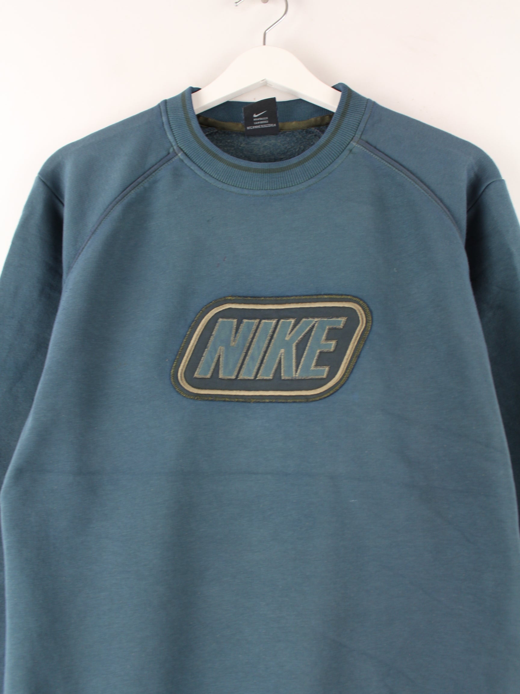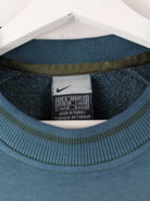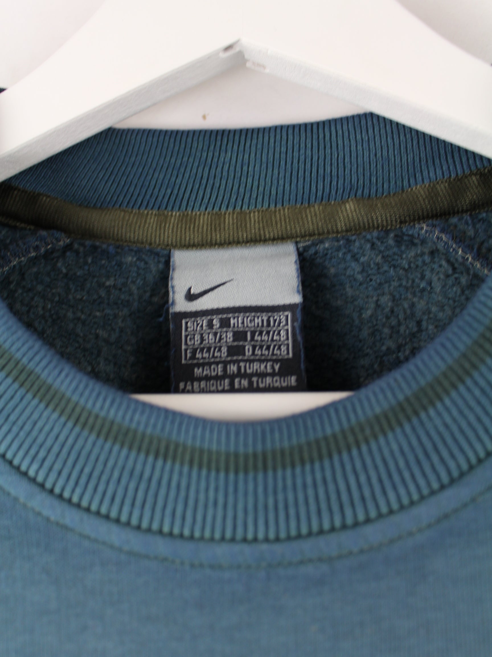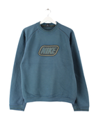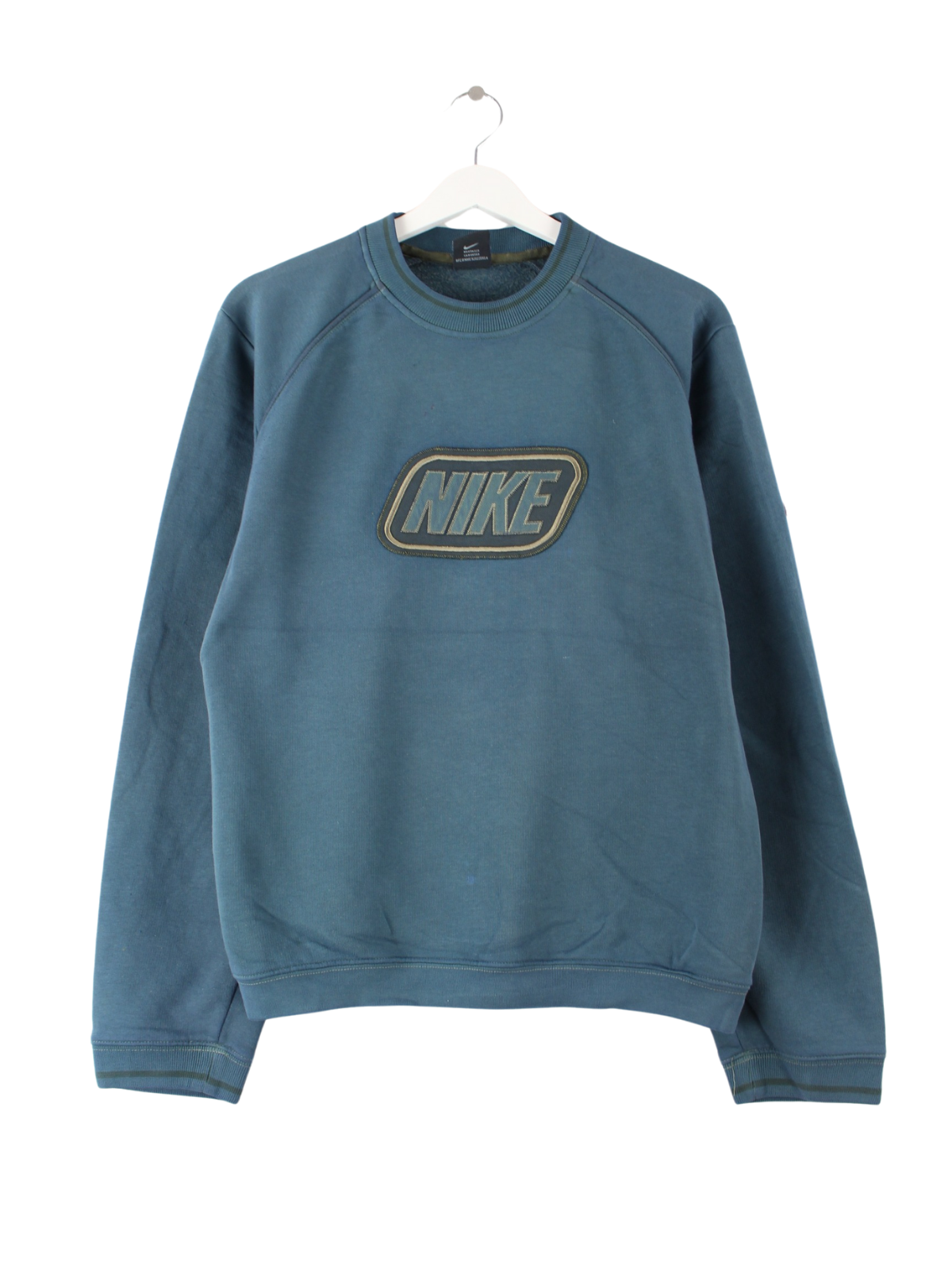 Blauer Sweater mit Stickereien vom Label Nike in Größe S. Er ist aus einer Baumwollmischung gefertigt und in gutem Zustand bei uns vorrätig.