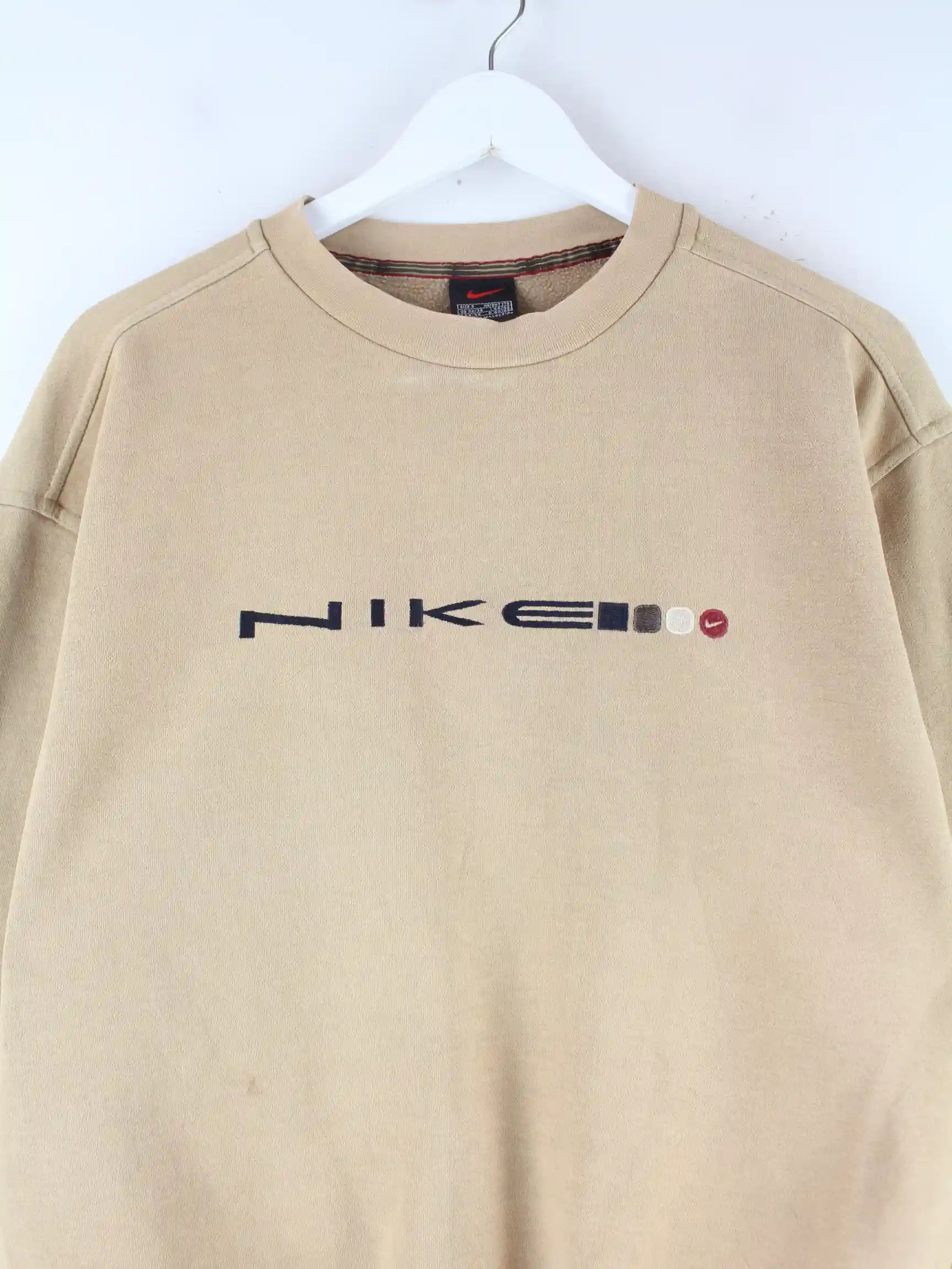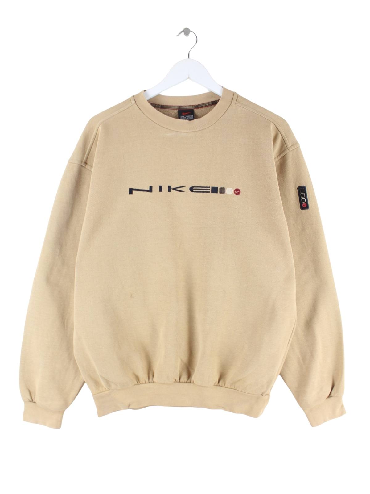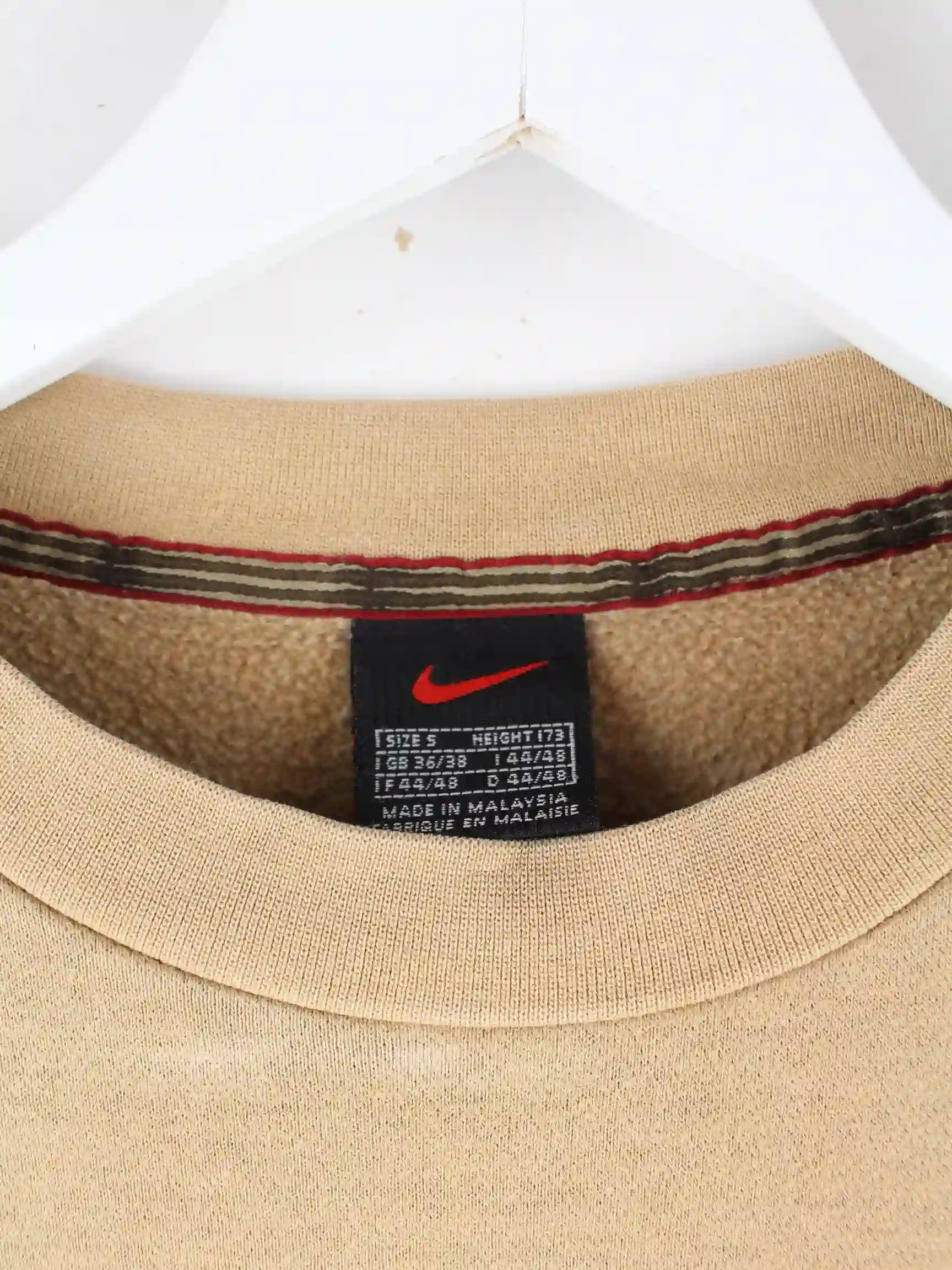 Brauner Sweater mit Stickereien des Labels Nike in Größe S. Er ist aus einer Baumwollmischung und in gutem Zustand bei uns vorrätig.