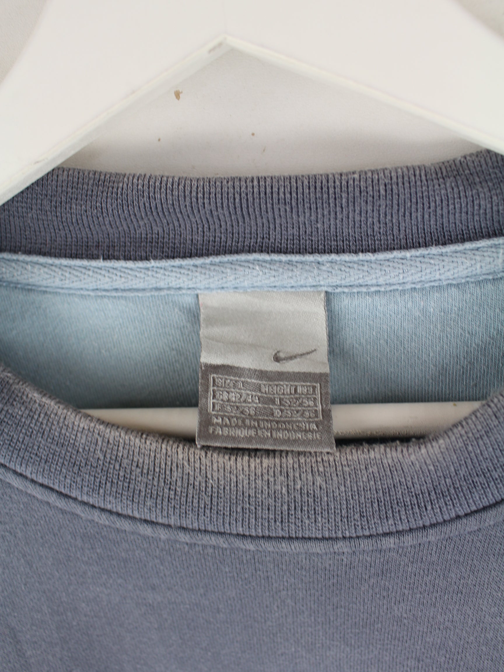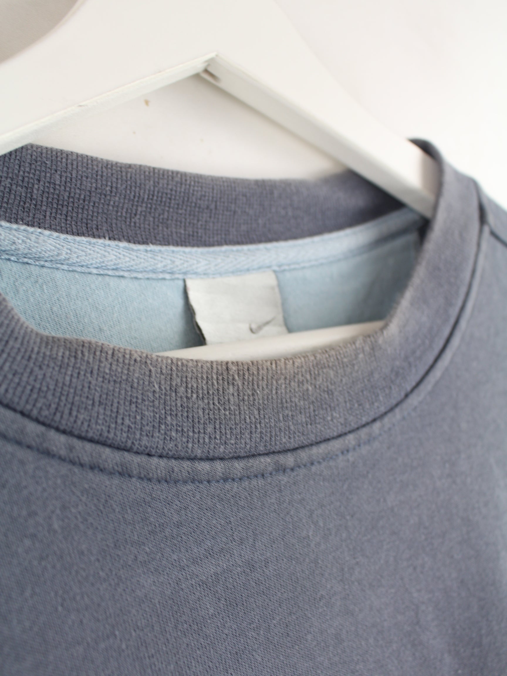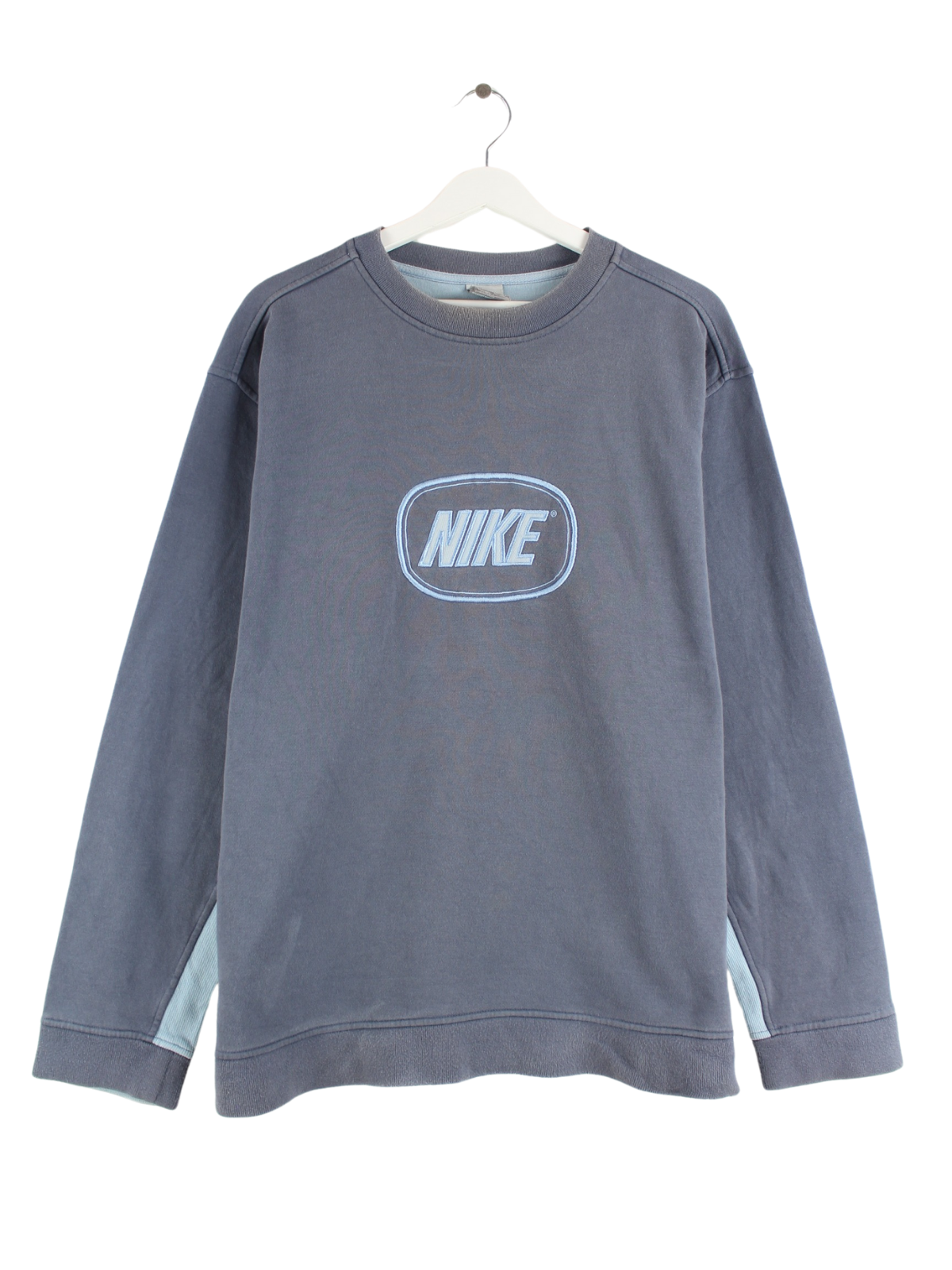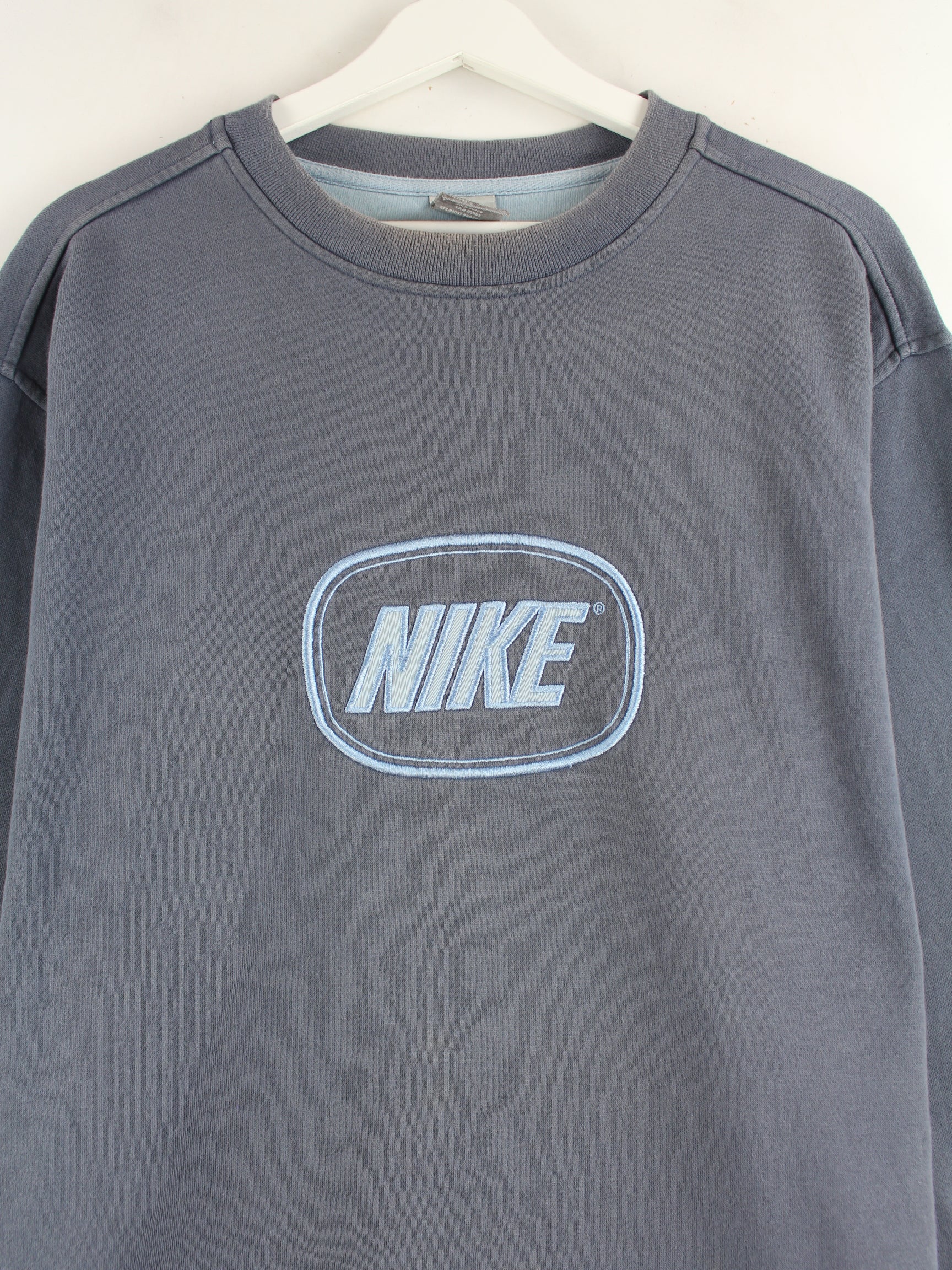 Sweater aus dem Hause Nike mit Stickereien in Größe L. Er ist aus einer Baumwollmischung angefertigt und in Grau im Angebot.