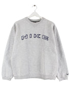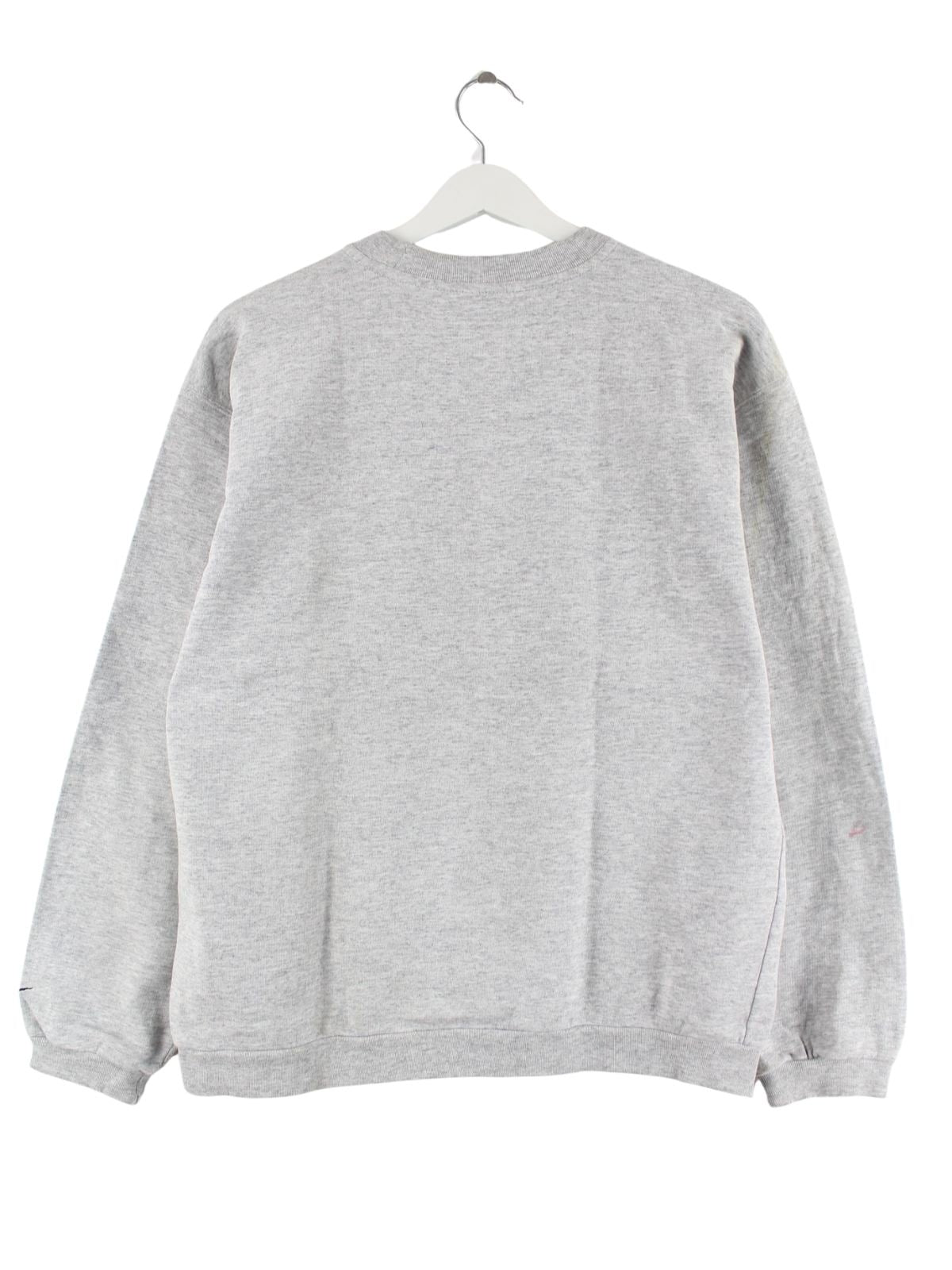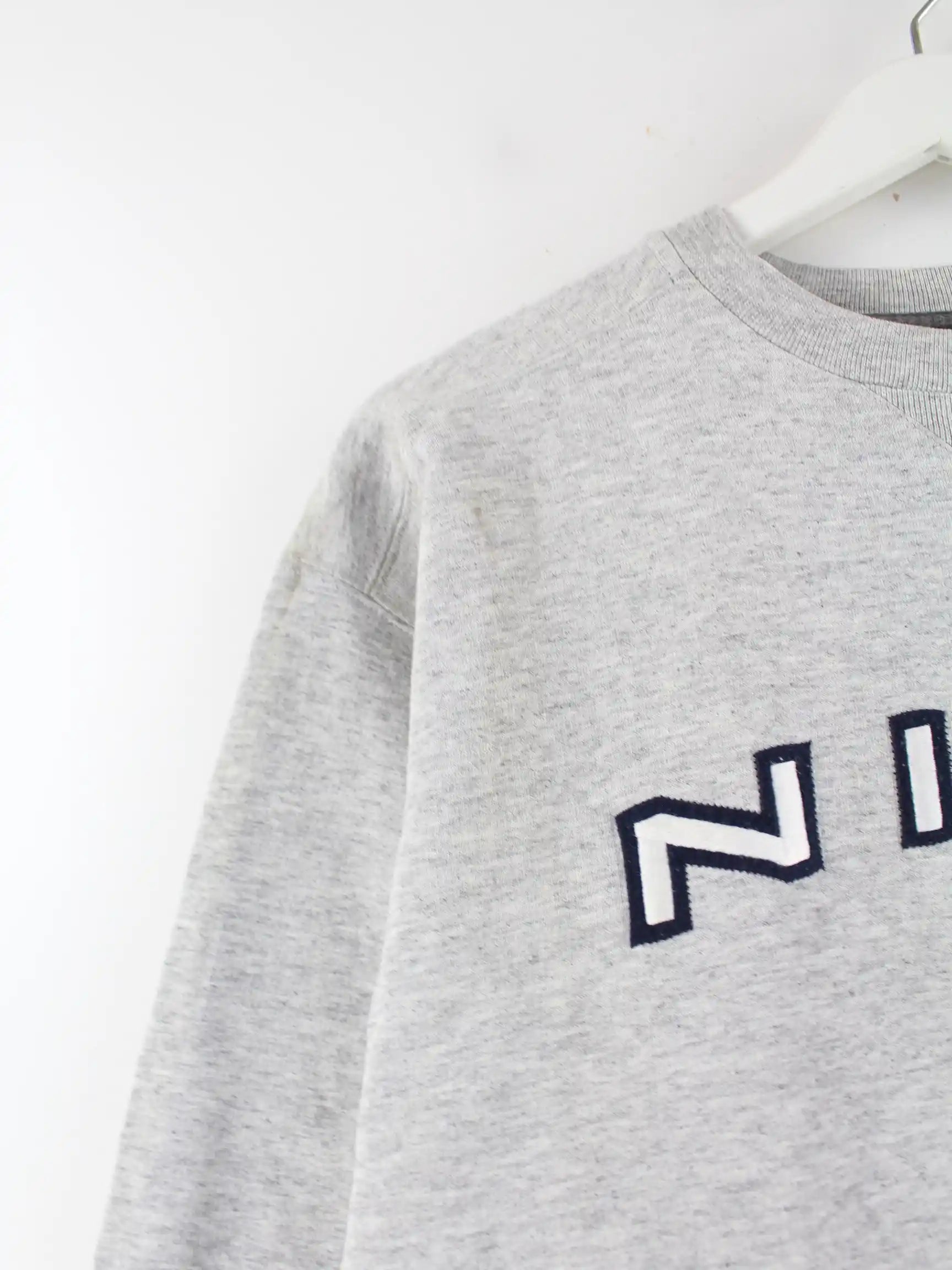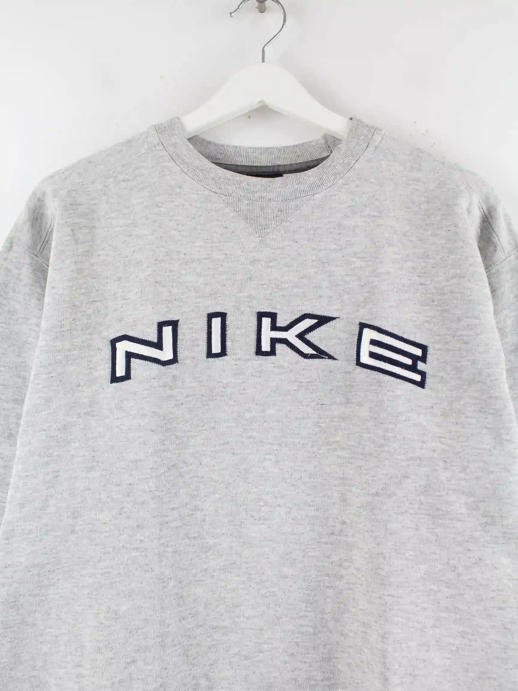 Grauer Sweater mit gestickten Motiven der Marke Nike in Größe S. Er ist aus einer Baumwollmischung produziert. Den Zustand würden wir als 'In Ordnung' bezeichnen (vergl. Bilder).