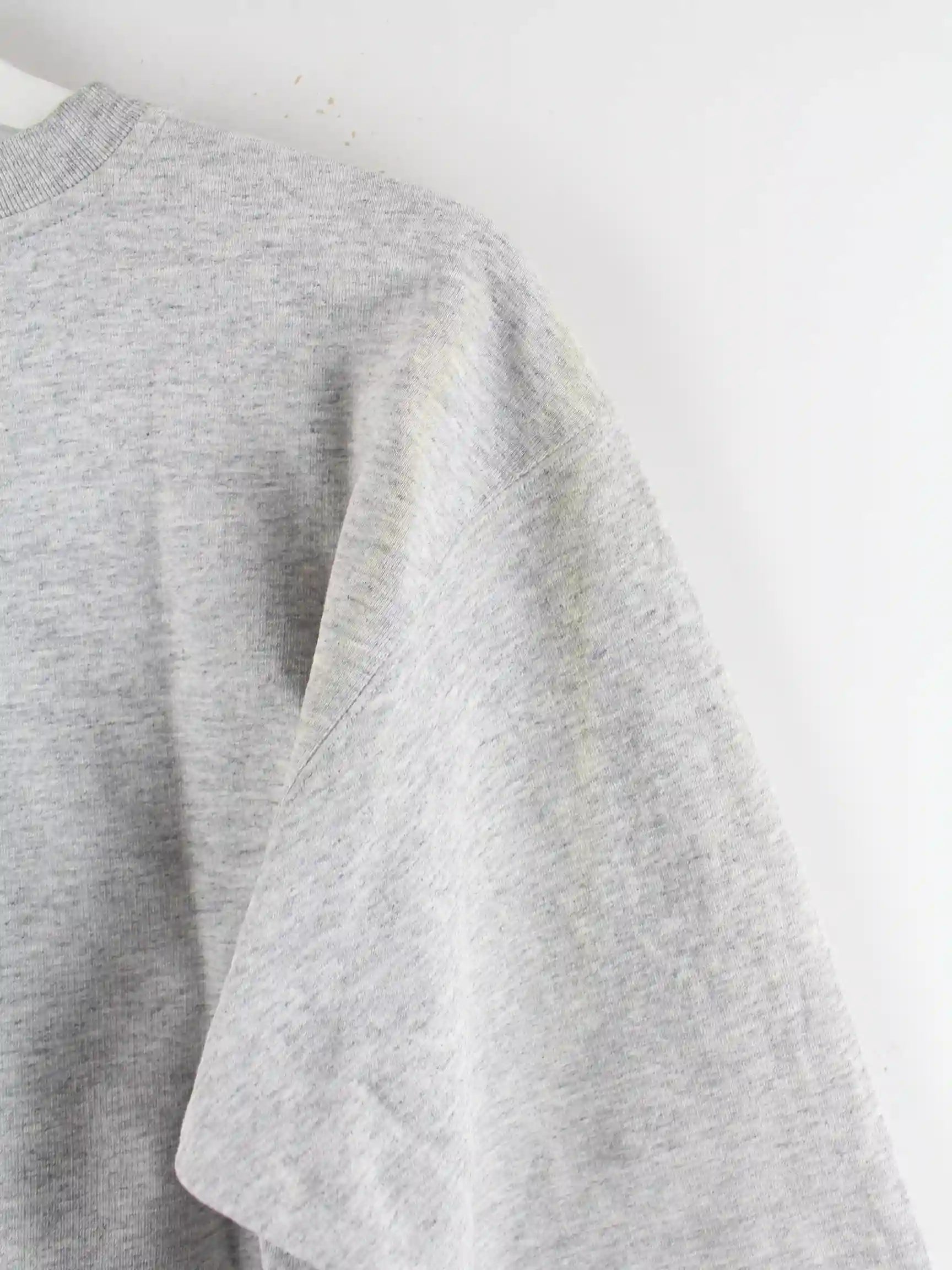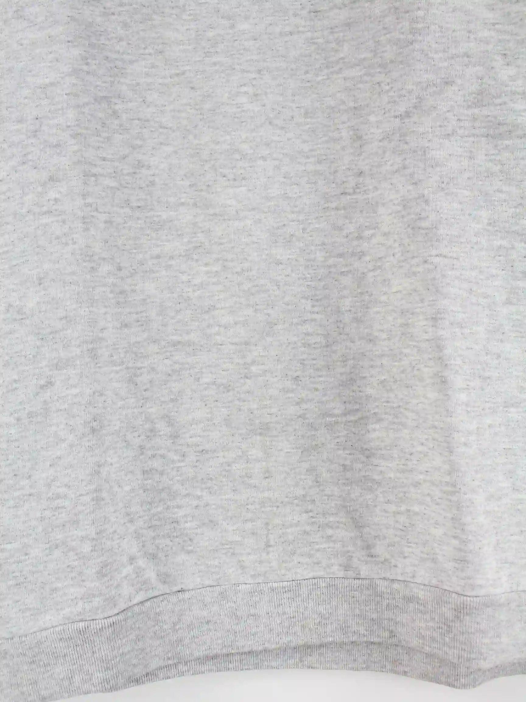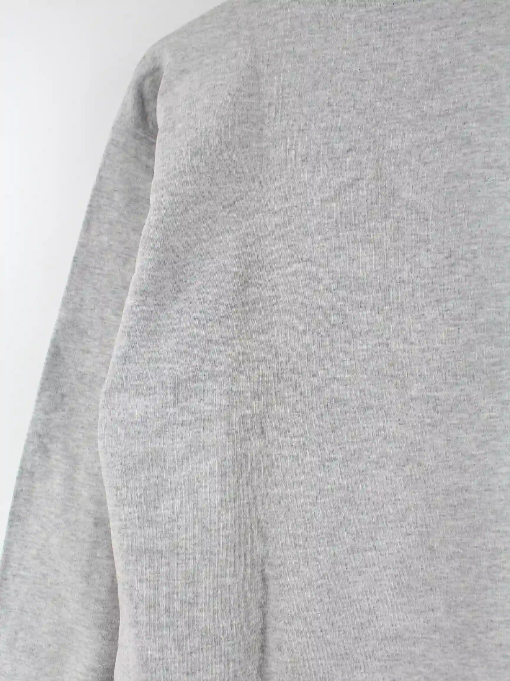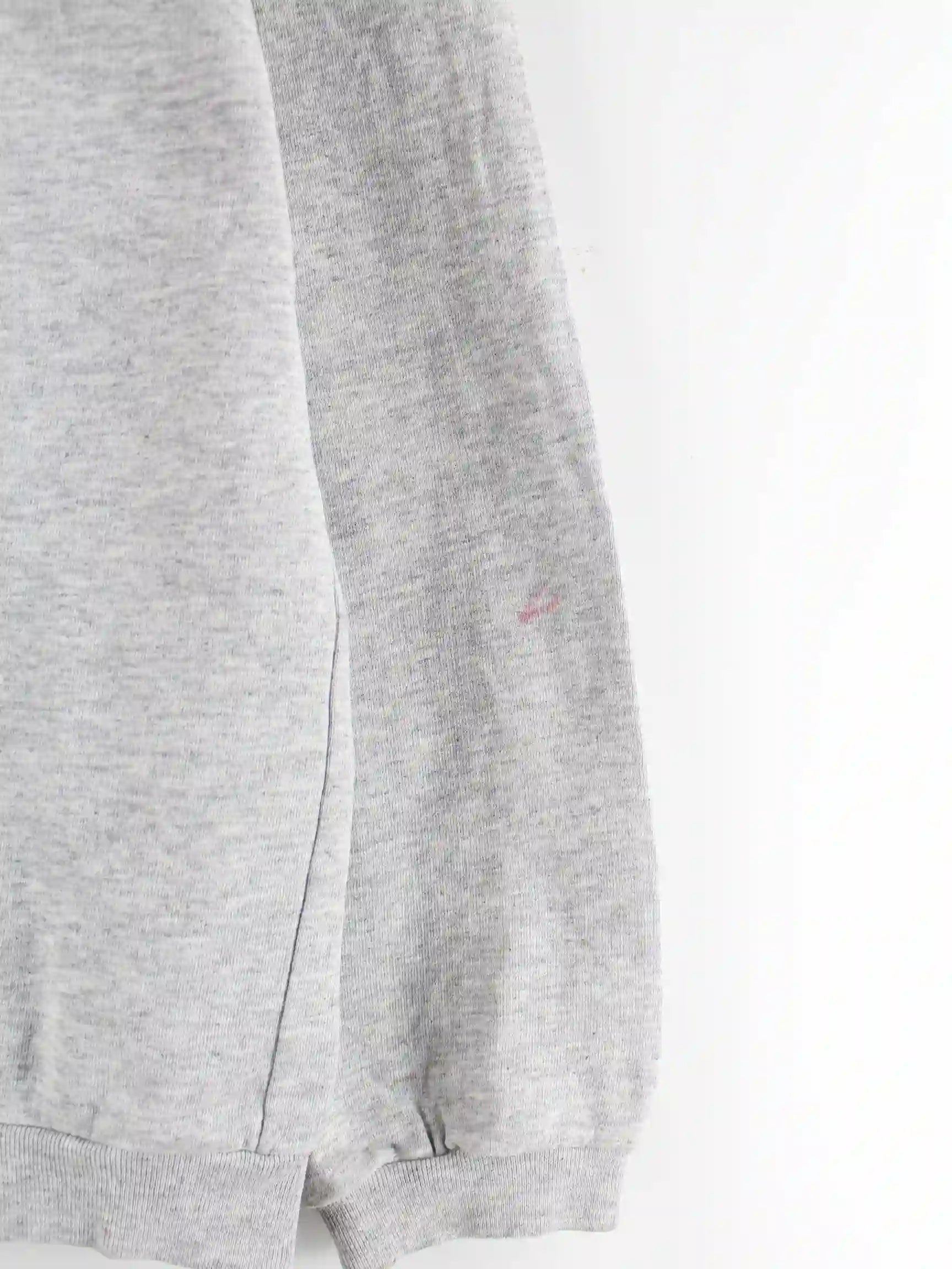 Grauer Sweater mit gestickten Motiven der Marke Nike in Größe S. Er ist aus einer Baumwollmischung produziert. Den Zustand würden wir als 'In Ordnung' bezeichnen (vergl. Bilder).
