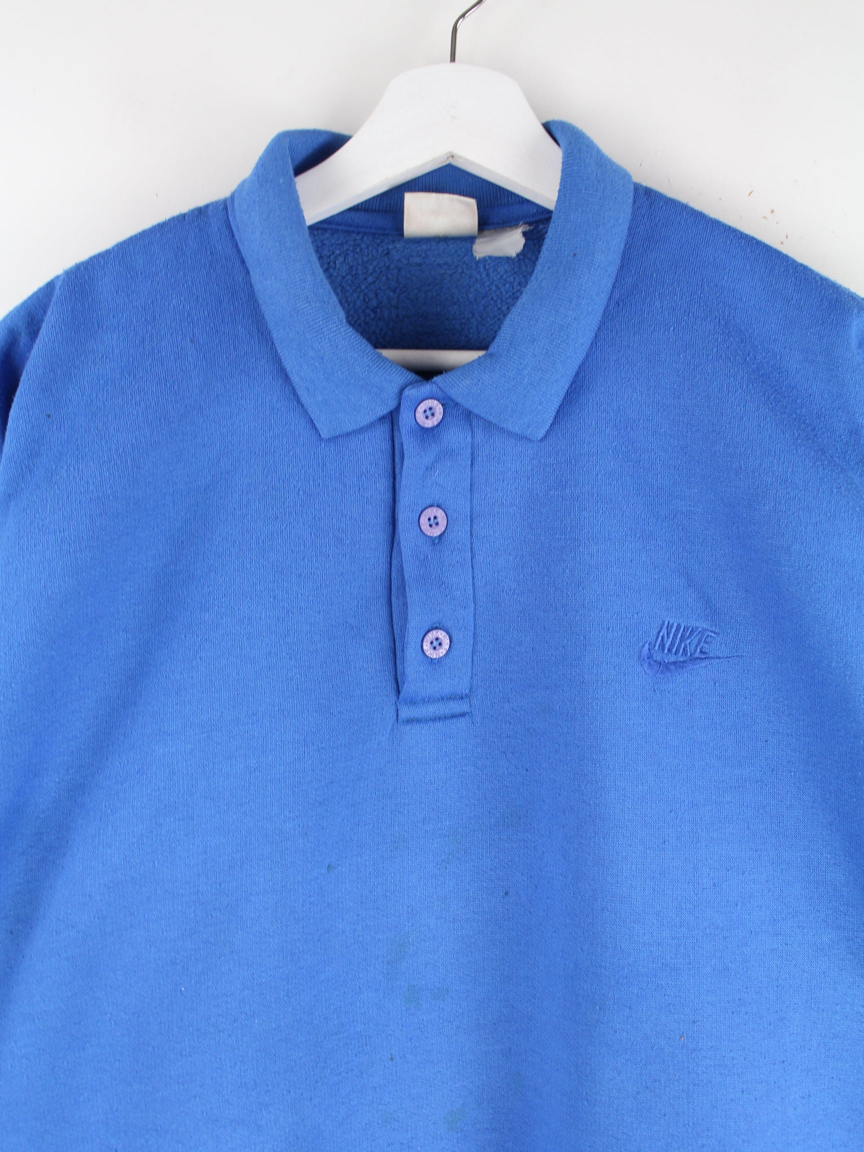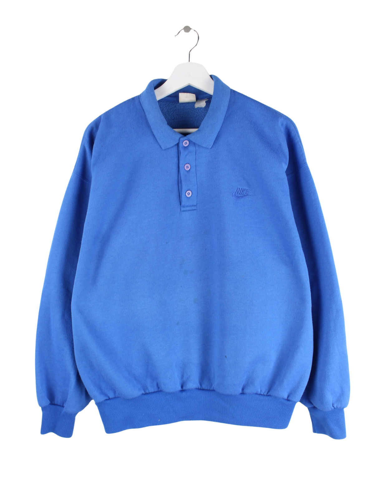 Sweater vom Brand Nike in Größe L aus den 80'ern. Er ist aus einer Baumwollmischung angefertigt und in Blau lieferbar.