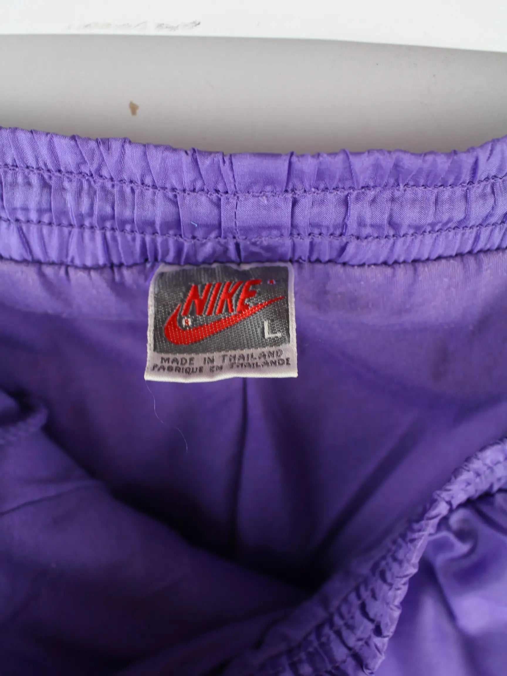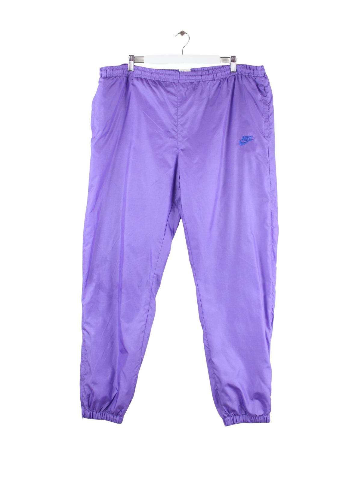 Lilafarbene Track Pants aus dem Hause Nike aus den 80'ern in Größe L. Sie sind aus Synthetik gefertigt und in gutem Zustand zu haben.