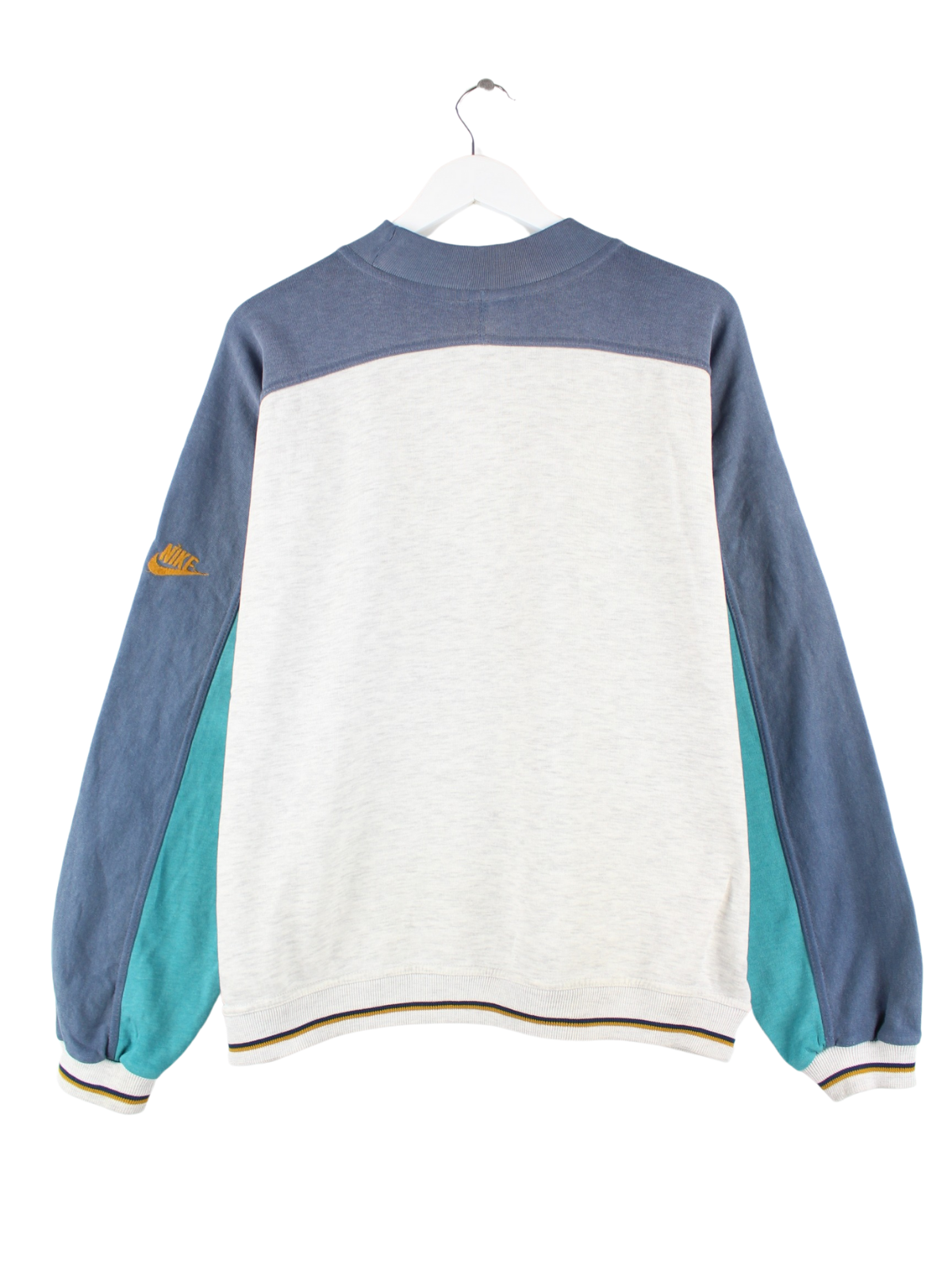 Grauer Sweater mit Stick des Labels Nike aus den 80'ern in Größe M. Er ist aus einer Baumwollmischung gefertigt und in sehr gutem Zustand vorrätig.