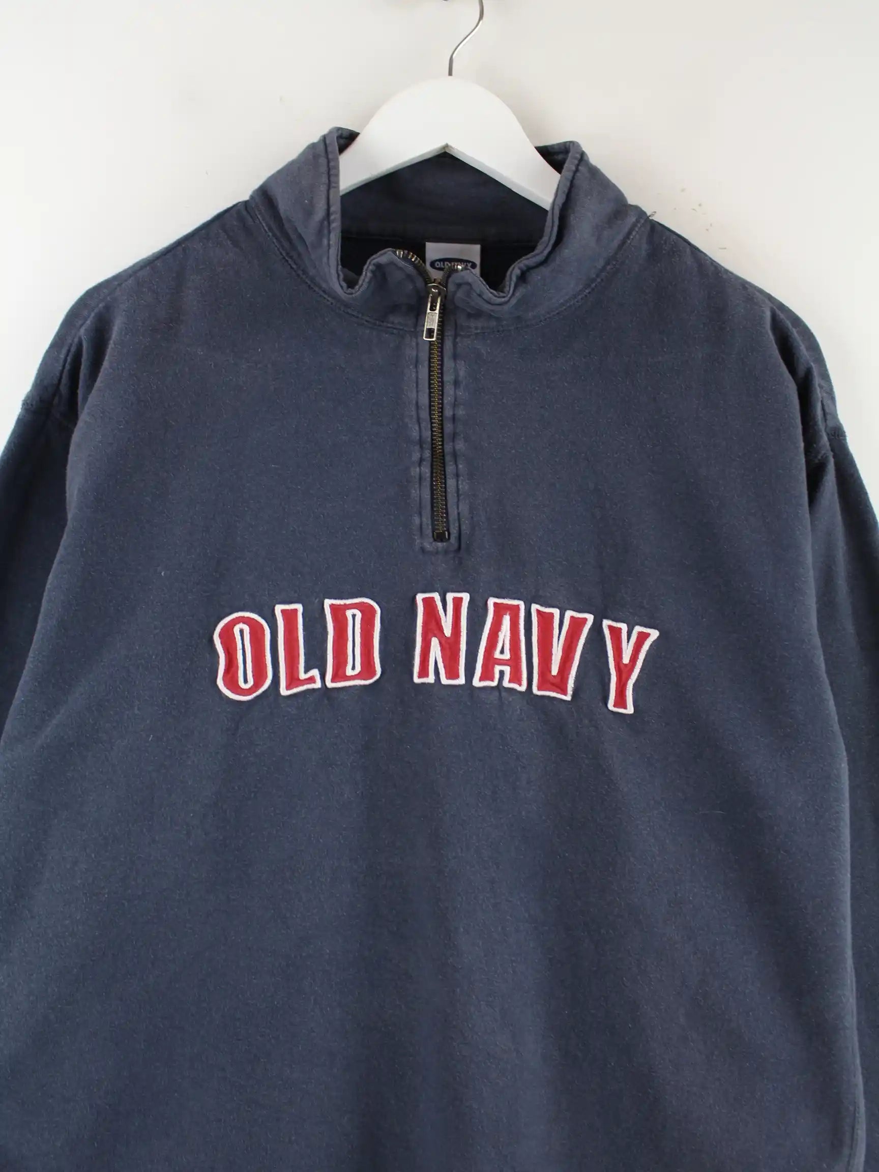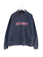 Blauer Sweater mit gesticktem Logo und half Zip der Brand Old Navy in Größe L. Er ist aus einer Baumwollmischung angefertigt und in gutem Zustand lieferbar.