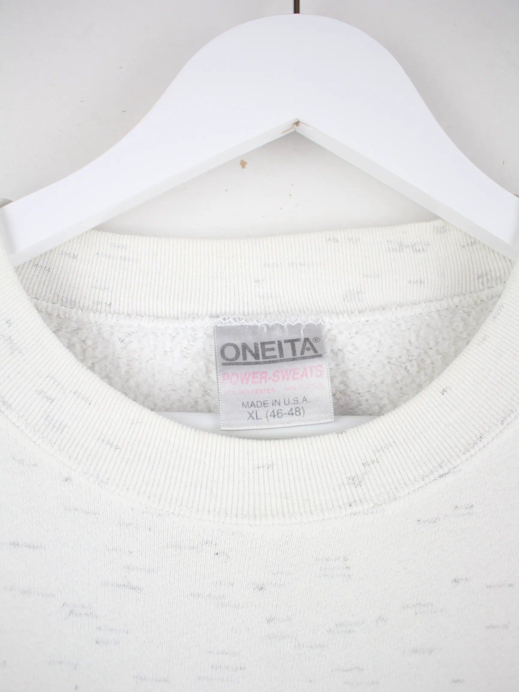 Grauer Sweater der Brand Oneita aus den 90'ern in Größe XL. Er ist aus einer Baumwollmischung hergestellt. Den Zustand würden wir als 'In Ordnung' bezeichnen (vergl. Bilder).Mit seltenem Highway Print.