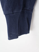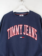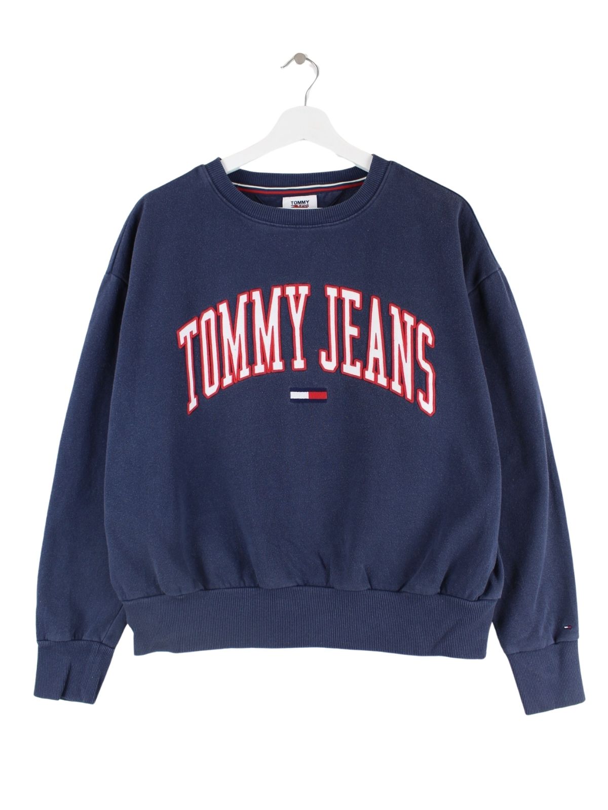 Blauer Sweater mit Stickereien der Marke Tommy Hilfiger in Größe M. Er ist aus einer Baumwollmischung hergestellt und in gutem Zustand vorrätig.