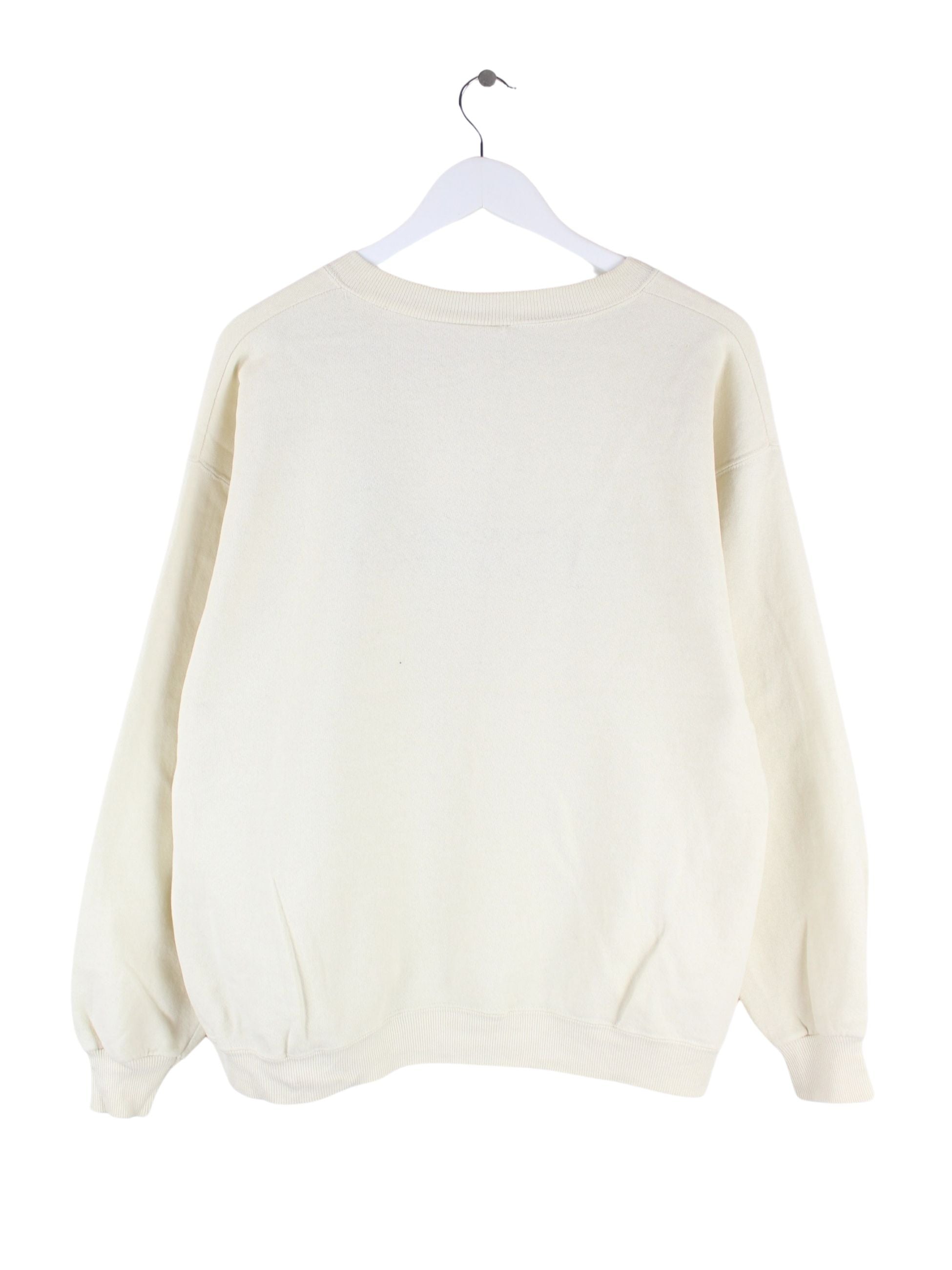 Beigefarbener Vintage Sweater mit gestickten Motiven in Größe M. Er ist aus einer Baumwollmischung angefertigt und in sehr gutem Zustand im Bestand.