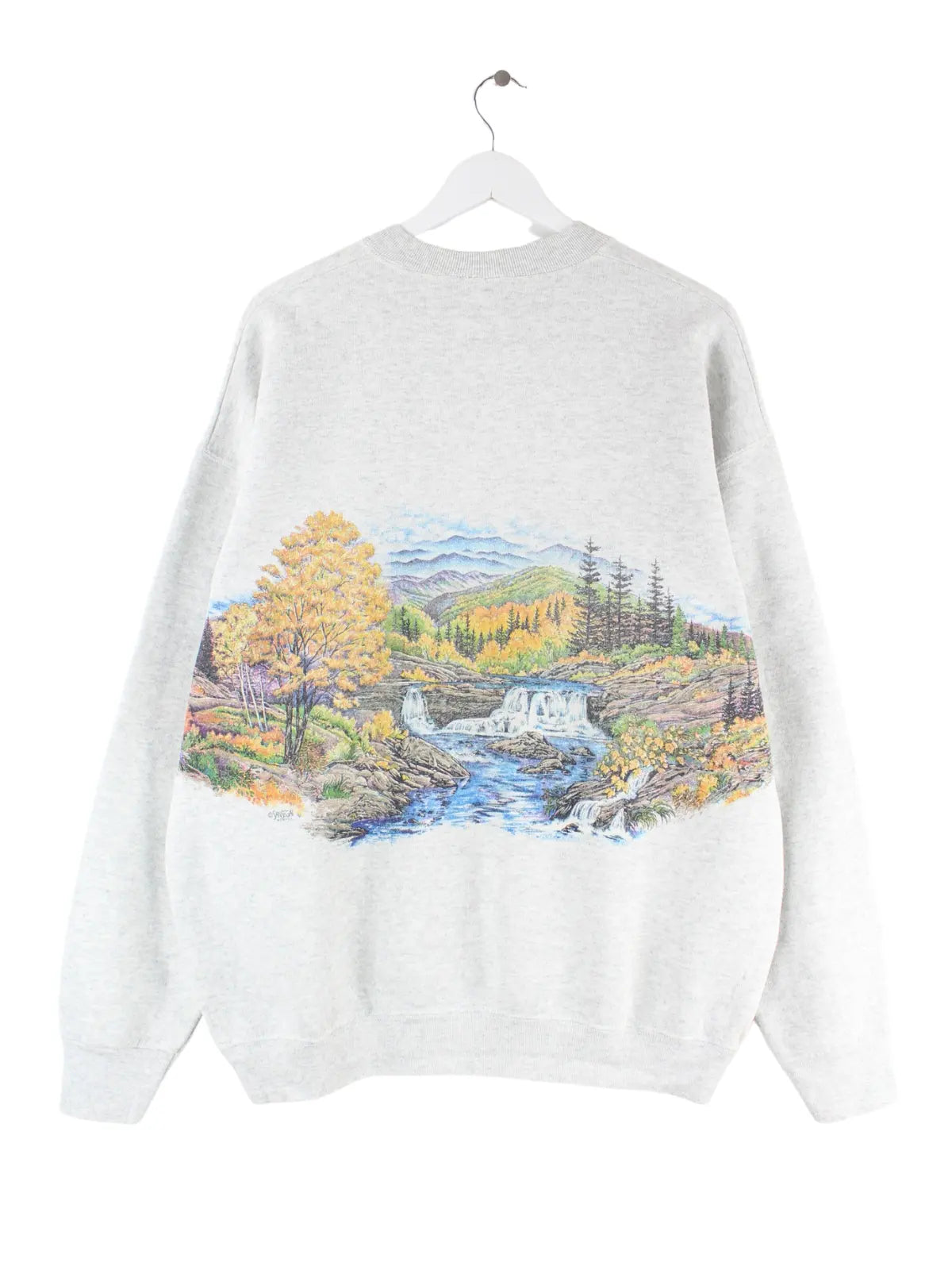 Grauer Vintage Sweater in Größe XXL. Er ist aus einer Baumwollmischung hergestellt und in sehr gutem Zustand in Stock. Mit schickem Mountains Print.