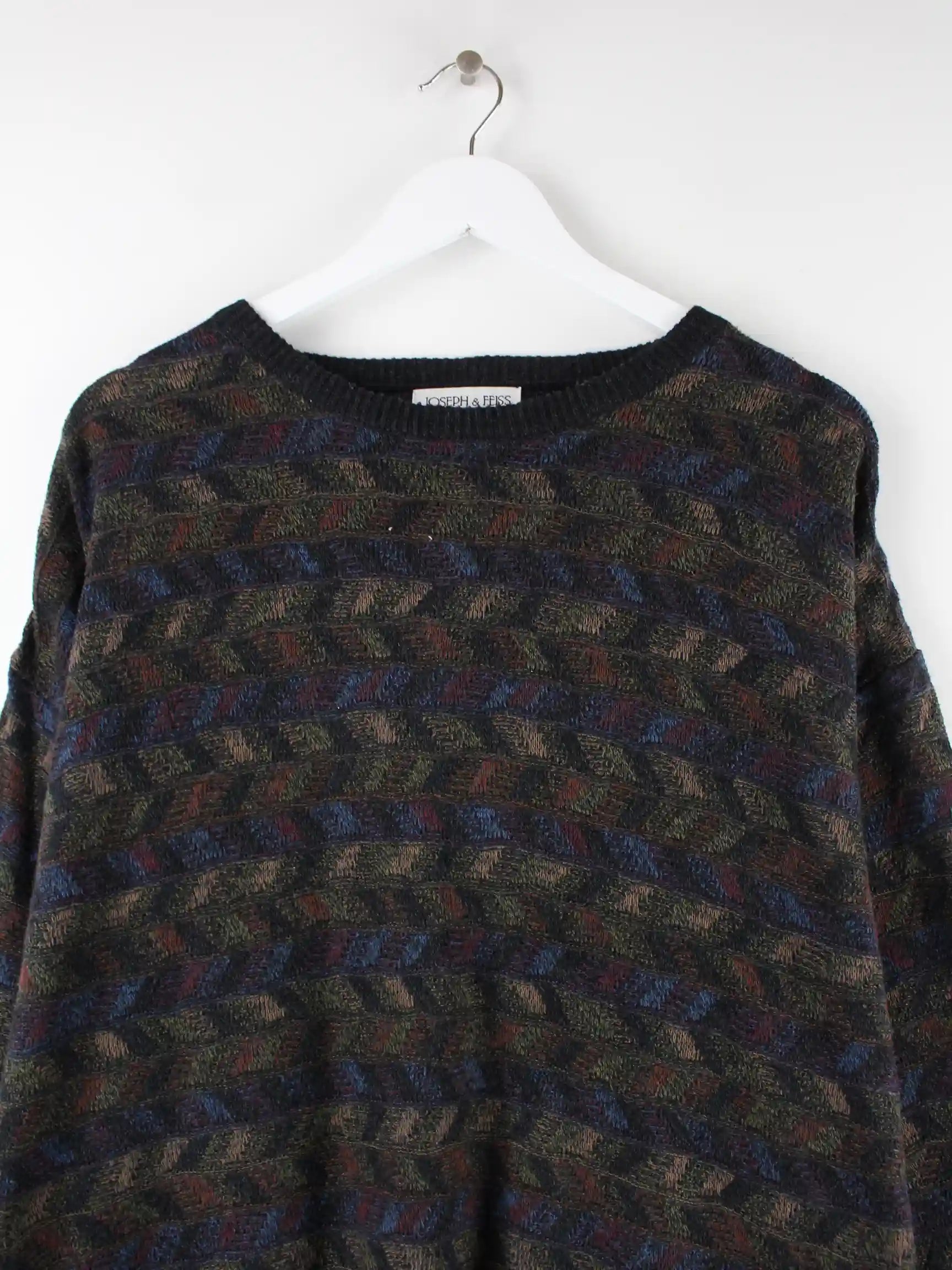 Mehrfarbiger Vintage Pullover in Größe L. Er ist aus einer Baumwollmischung gemacht und in sehr gutem Zustand bei uns zu bekommen.