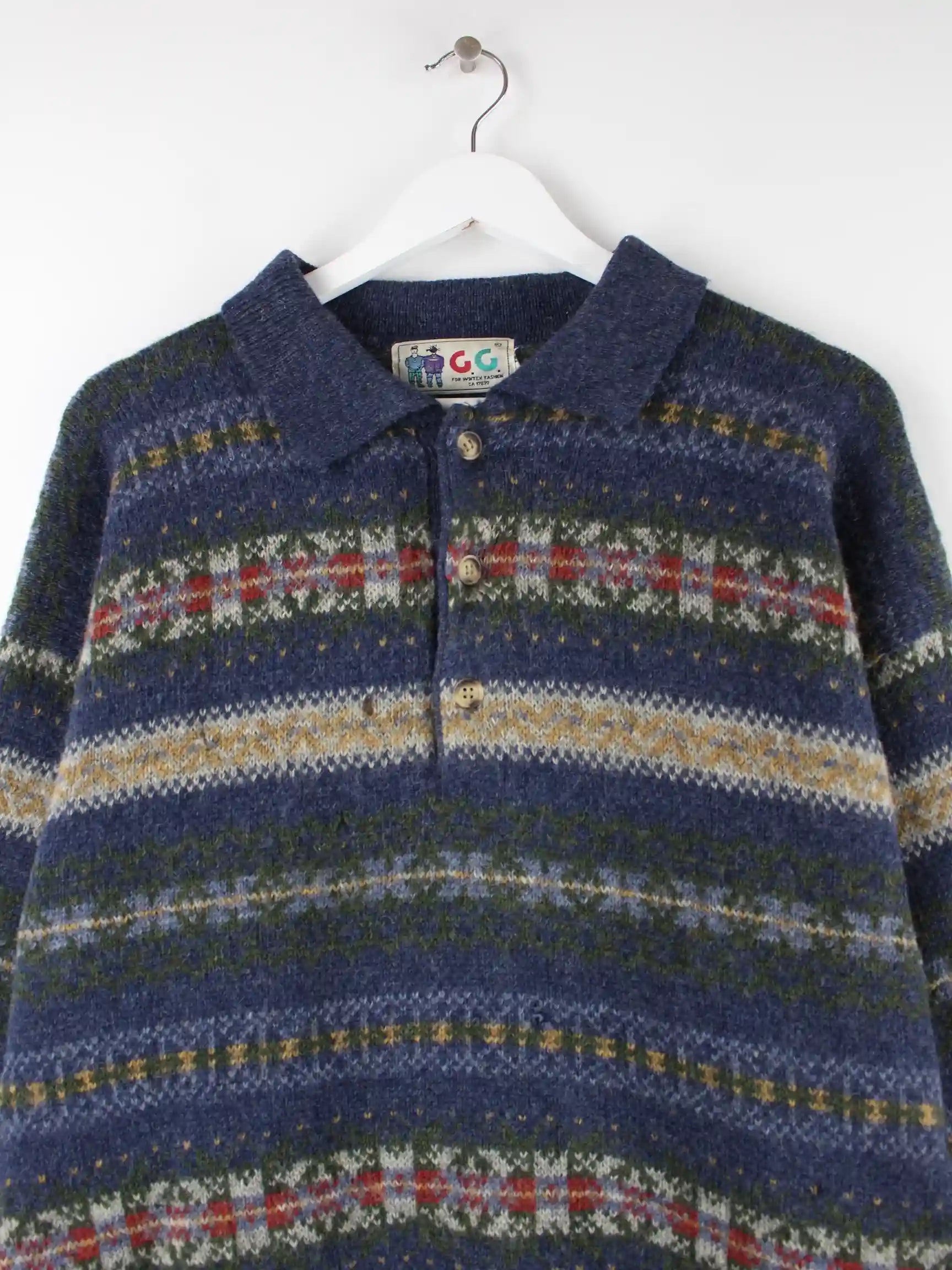 Vintage Pullover in Größe L aus den 80'ern. Er ist aus Baumwolle produziert und in bunten Farben auf Lager.