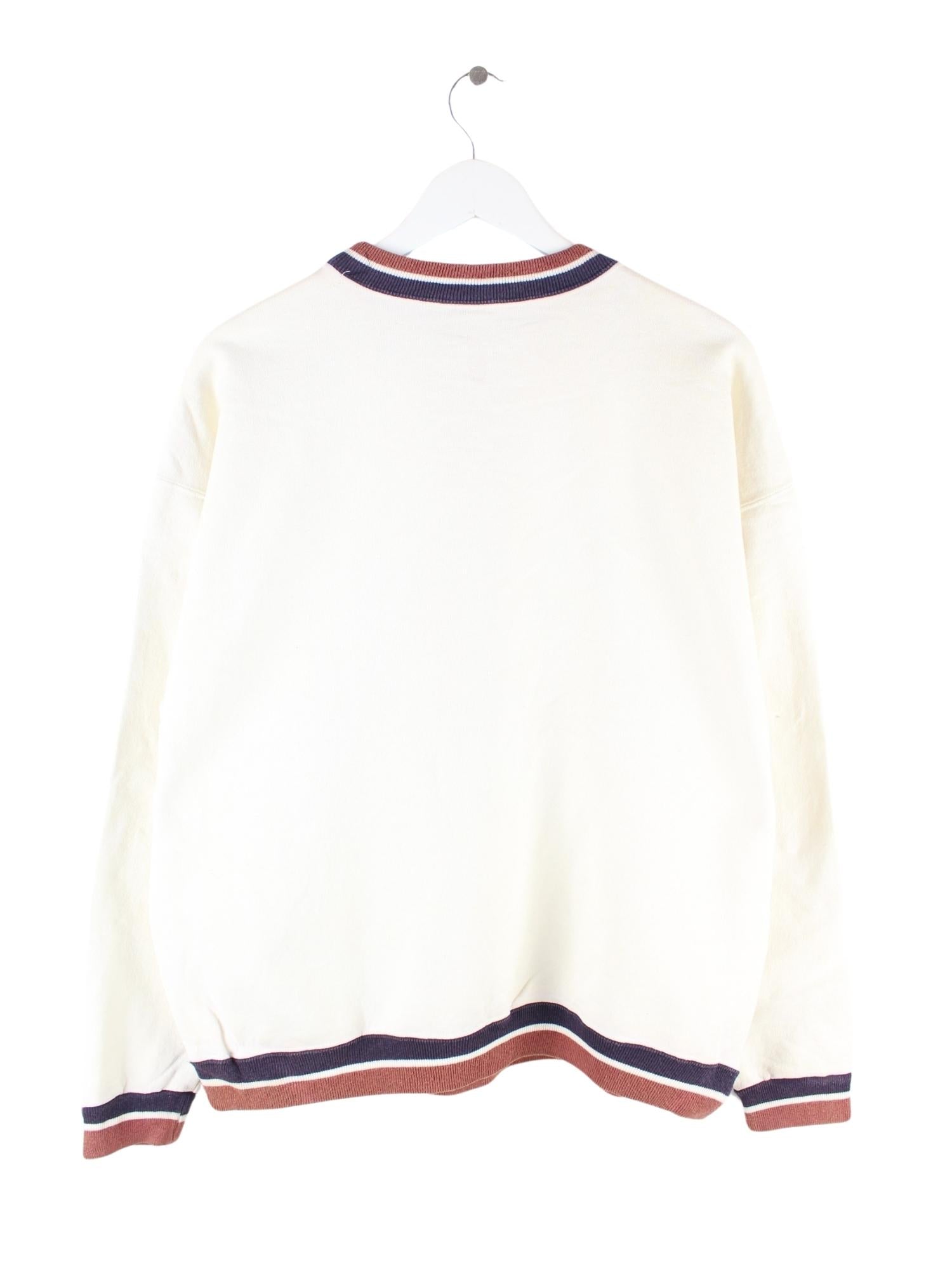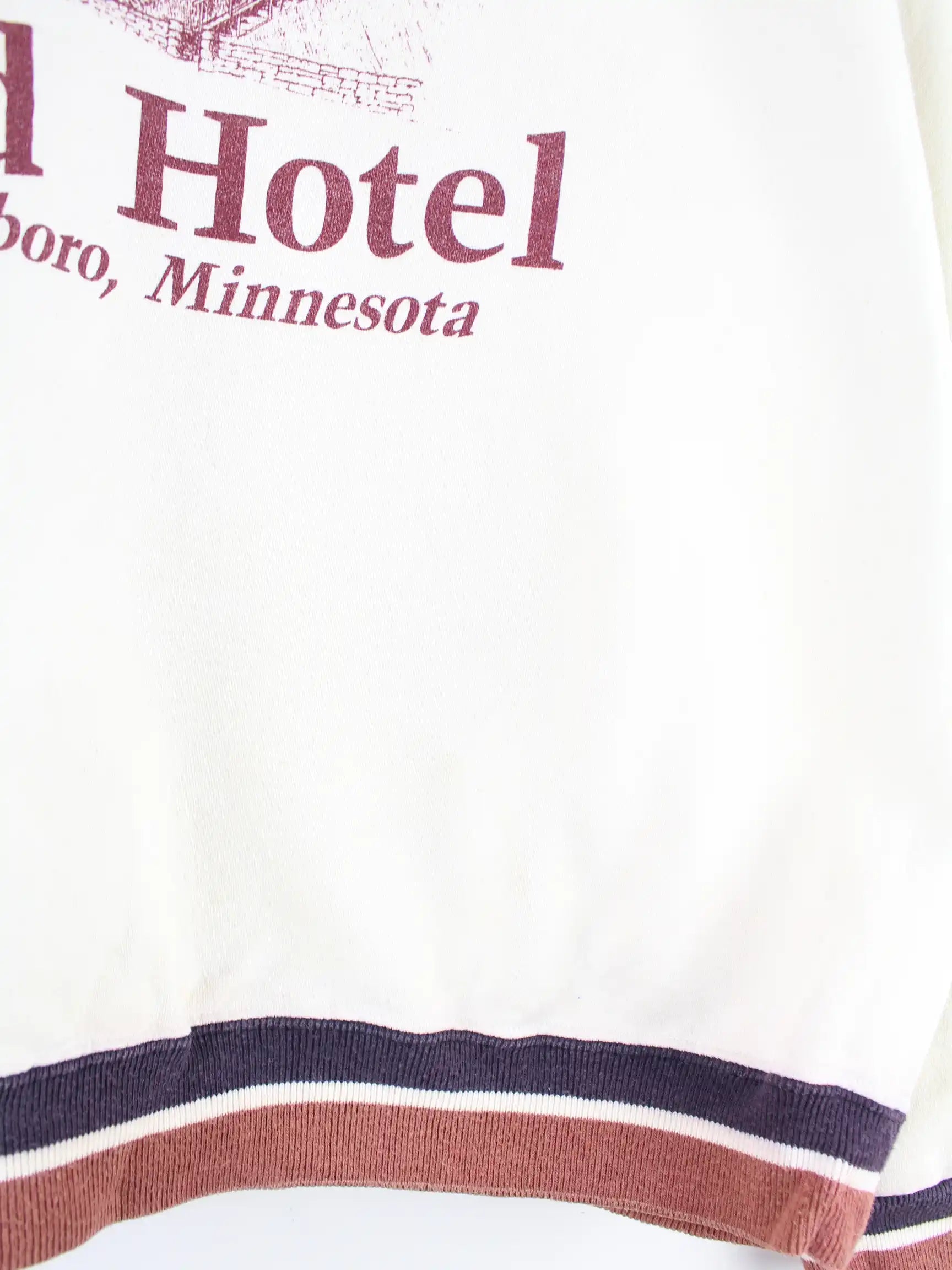 Beigefarbener Vintage Sweater aus den 90'ern in Größe L. Er ist aus einer Baumwollmischung produziert und in gutem Zustand zu haben. Mit chiquem Minnesota Print.