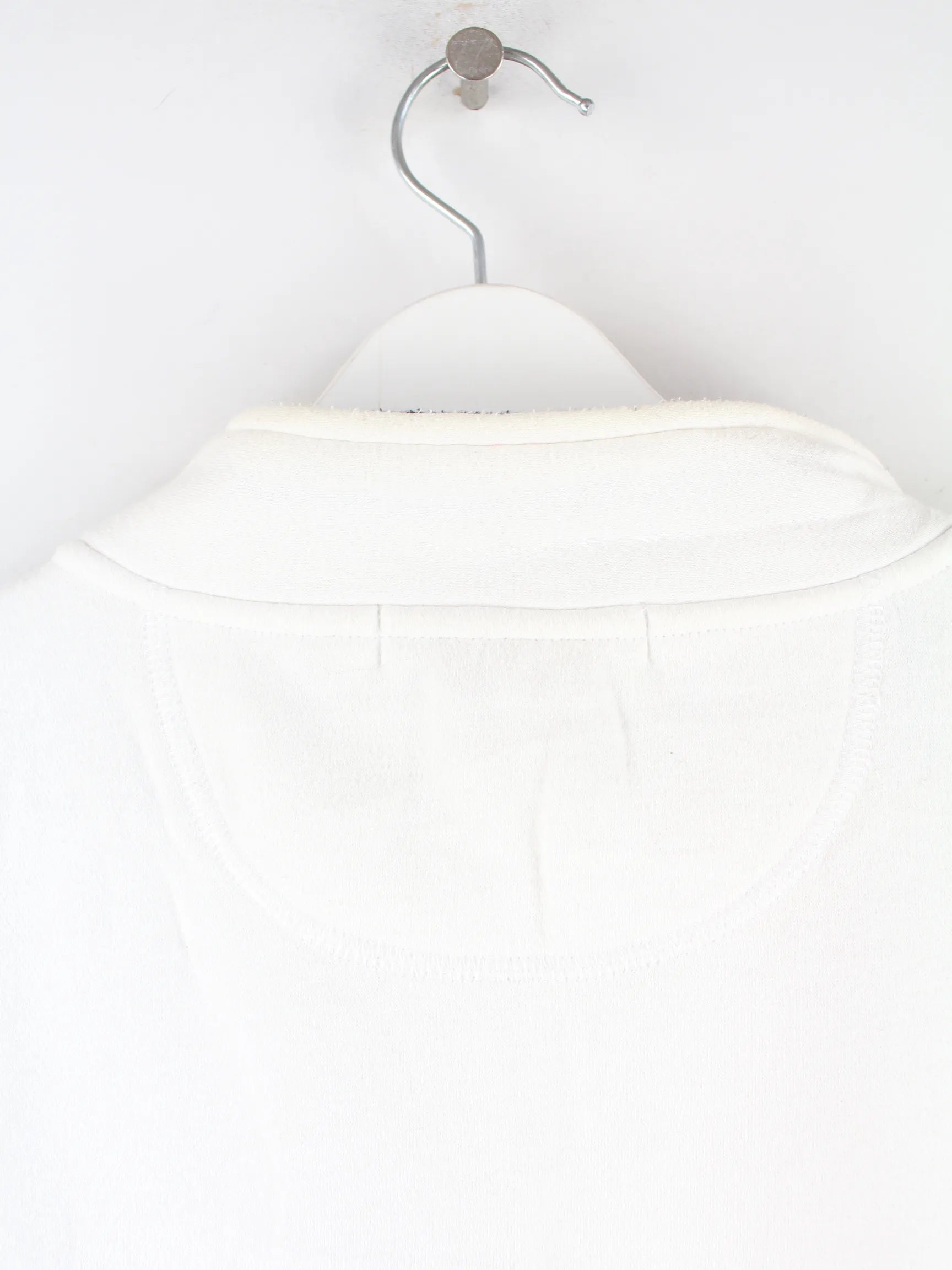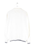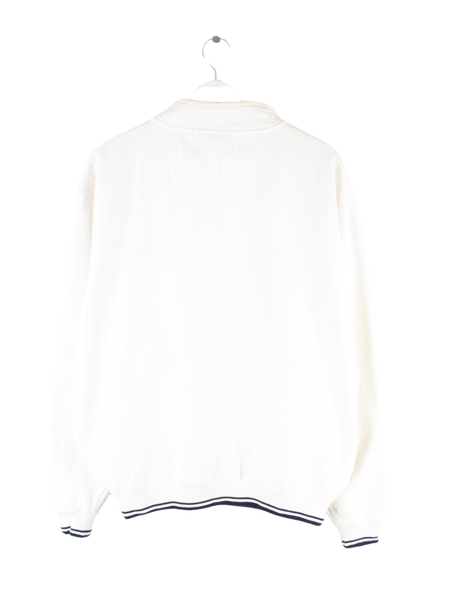 Weißer Vintage Sweater mit Stickereien und halbem Reißverschluß aus den 90'ern in Größe L. Er ist aus einer Baumwollmischung gefertigt und in gutem Zustand im Bestand.