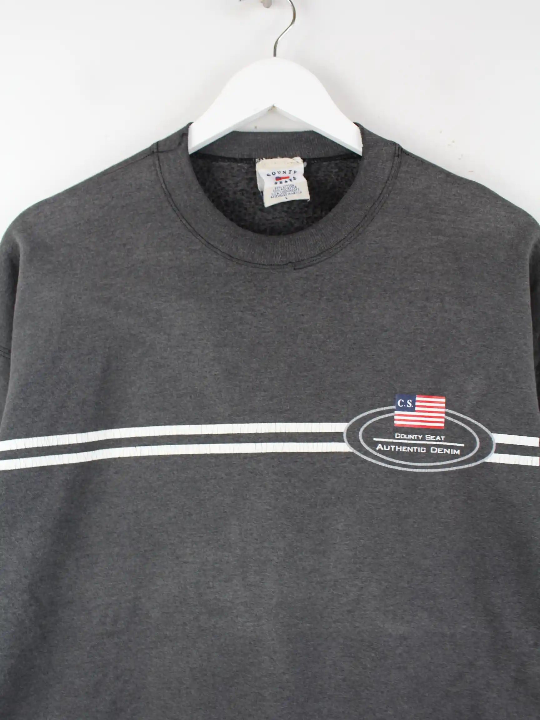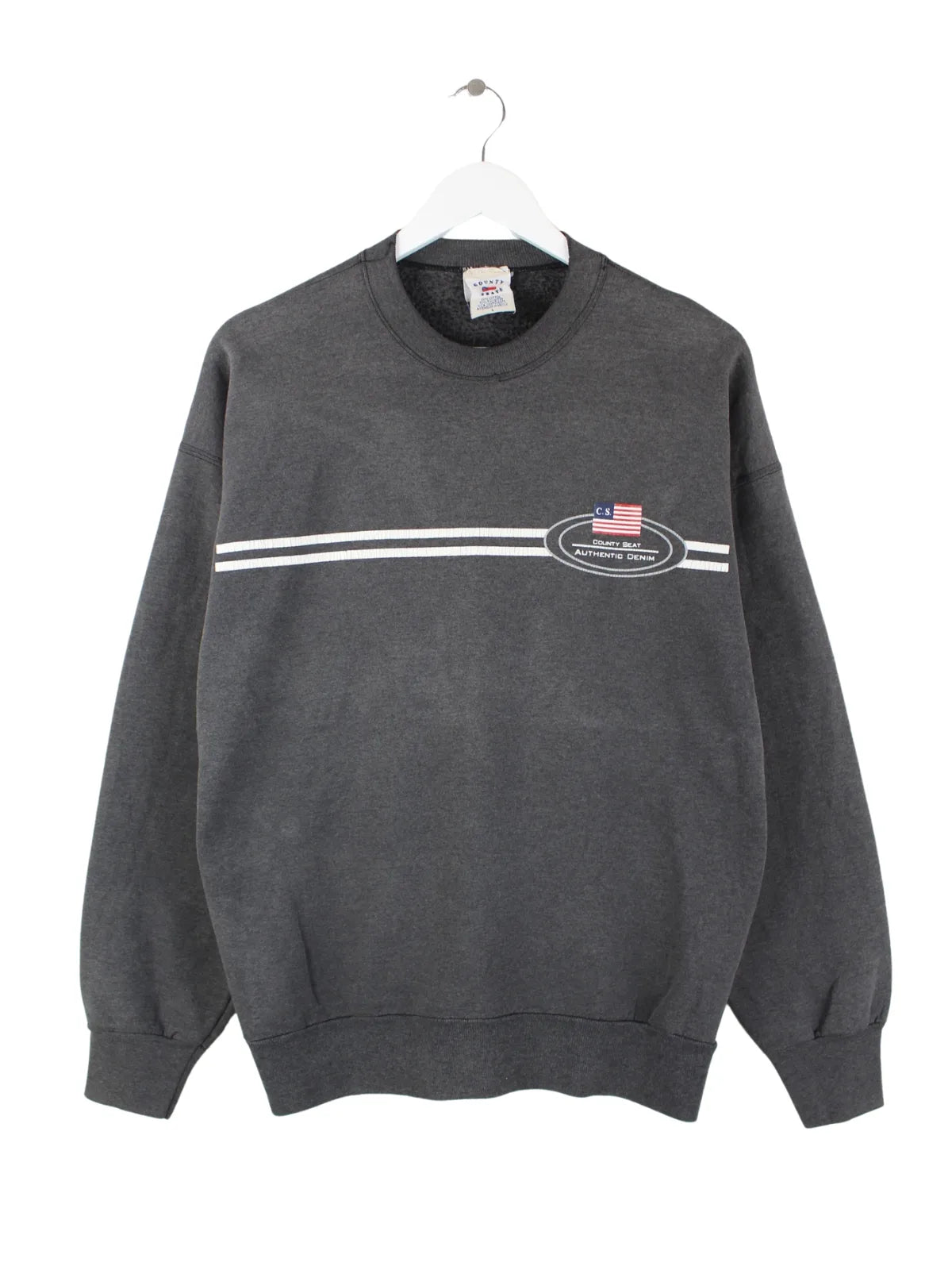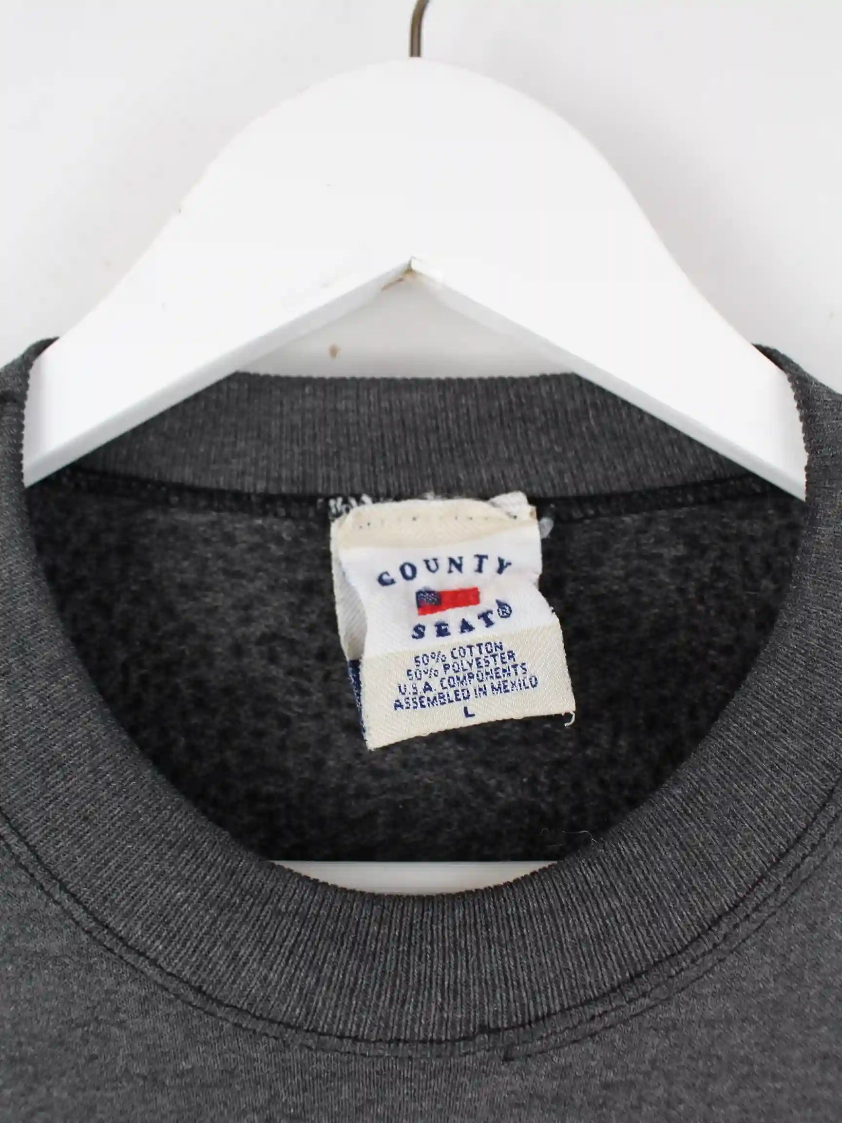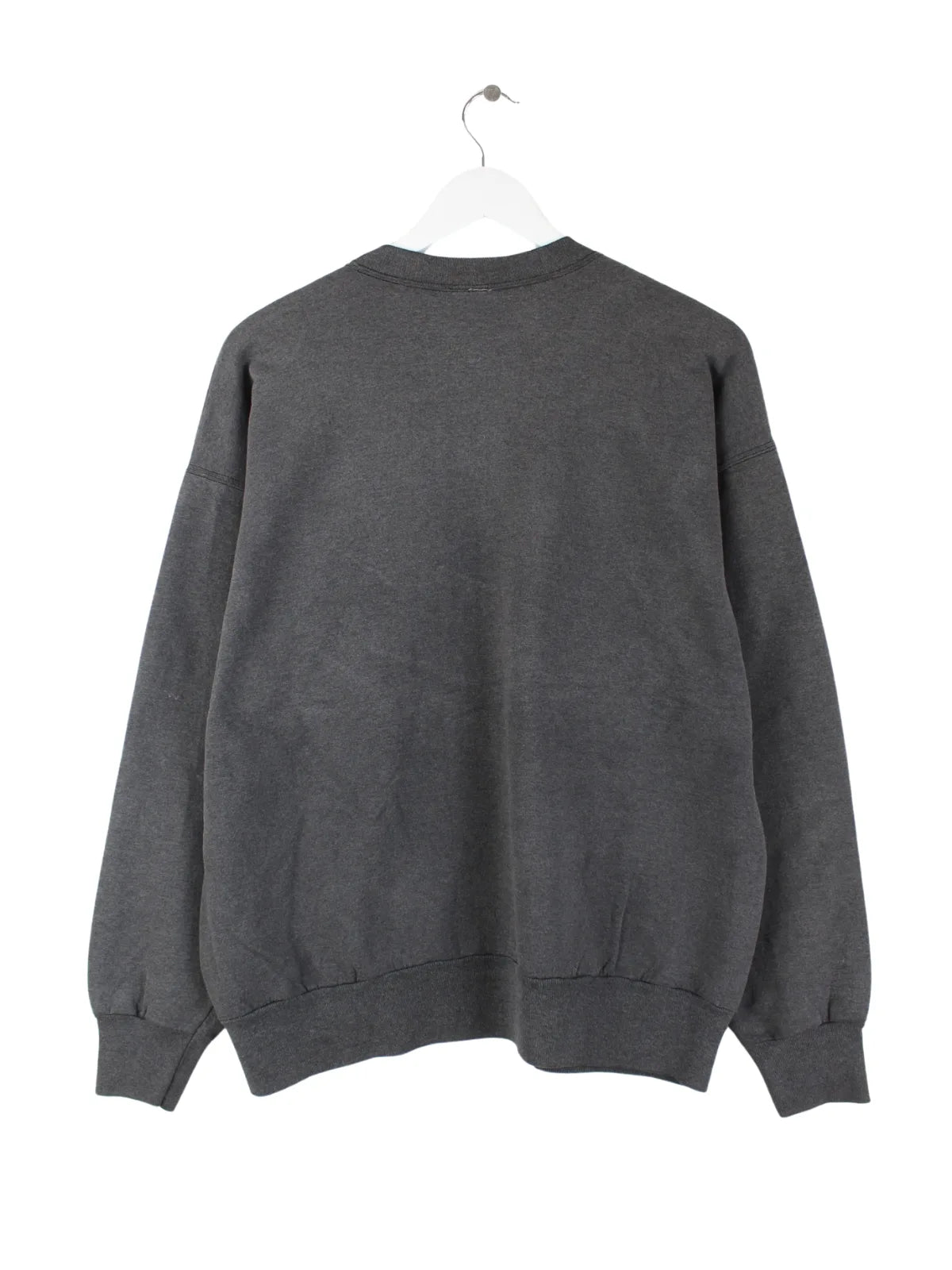 Vintage Sweater in Größe L aus den 90'ern. Er ist aus einer Baumwollmischung und in Grau bei uns vorrätig. Mit schickem Seat Print.