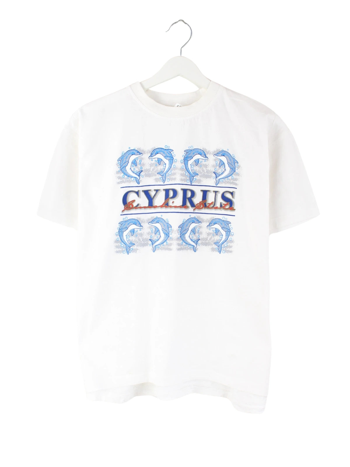 Vintage T-Shirt in Größe M aus den 90'ern. Es ist aus einer Baumwollmischung gefertigt und in Weiß lieferbar. Mit schönem Dolphin Print.