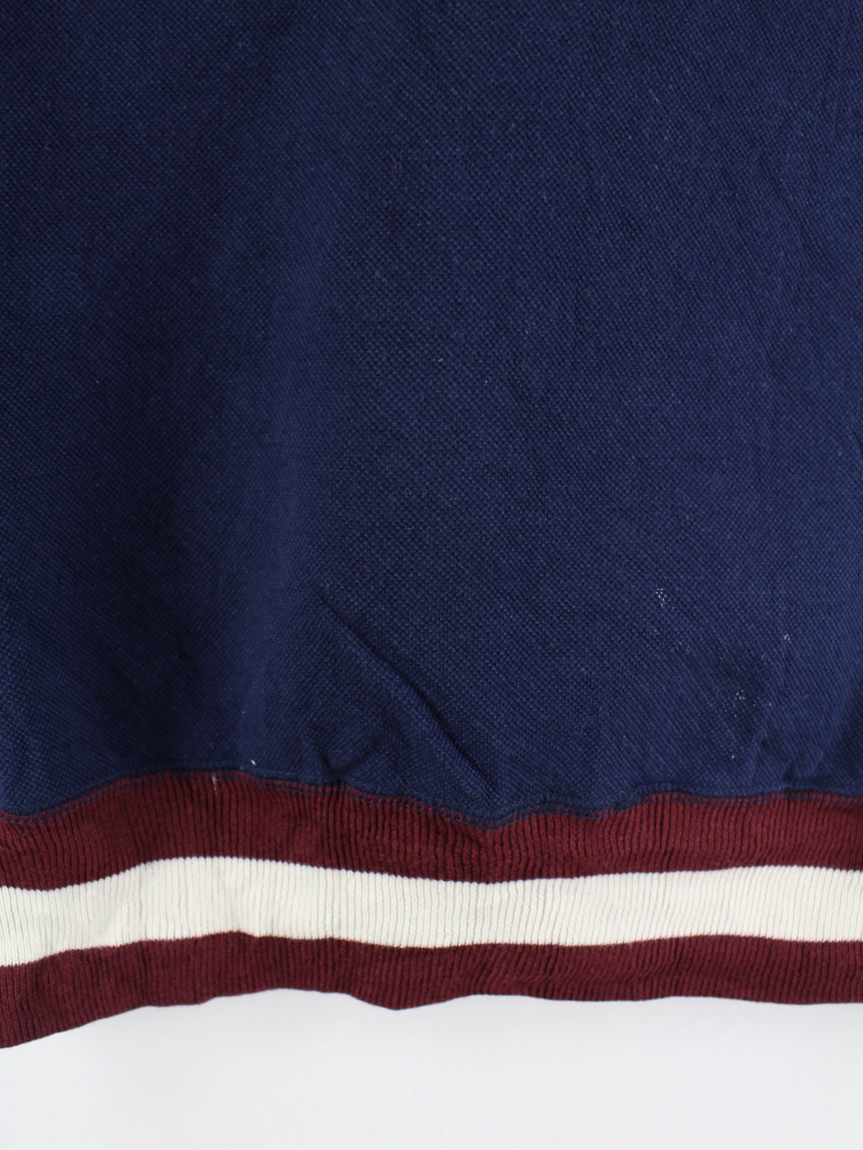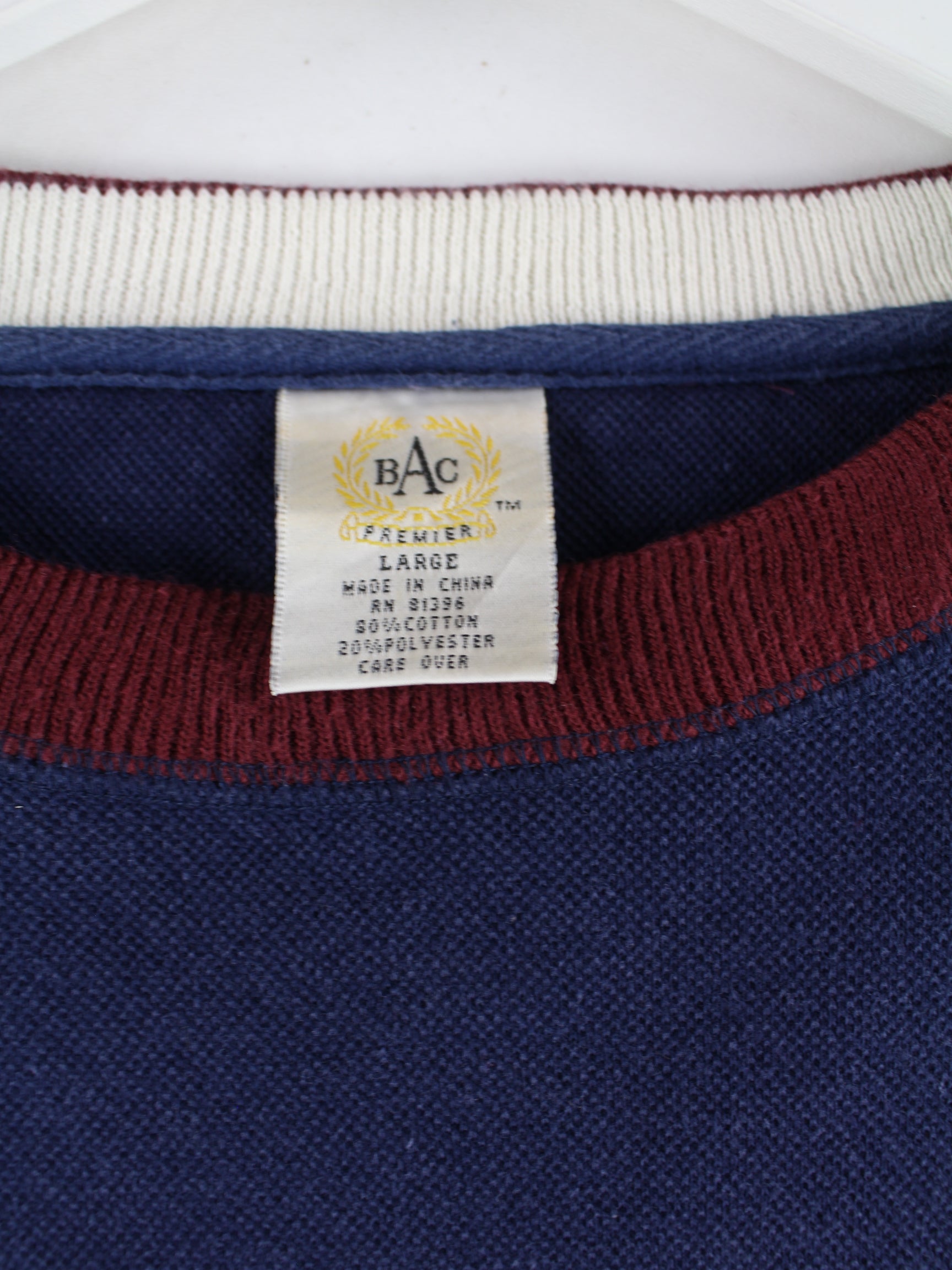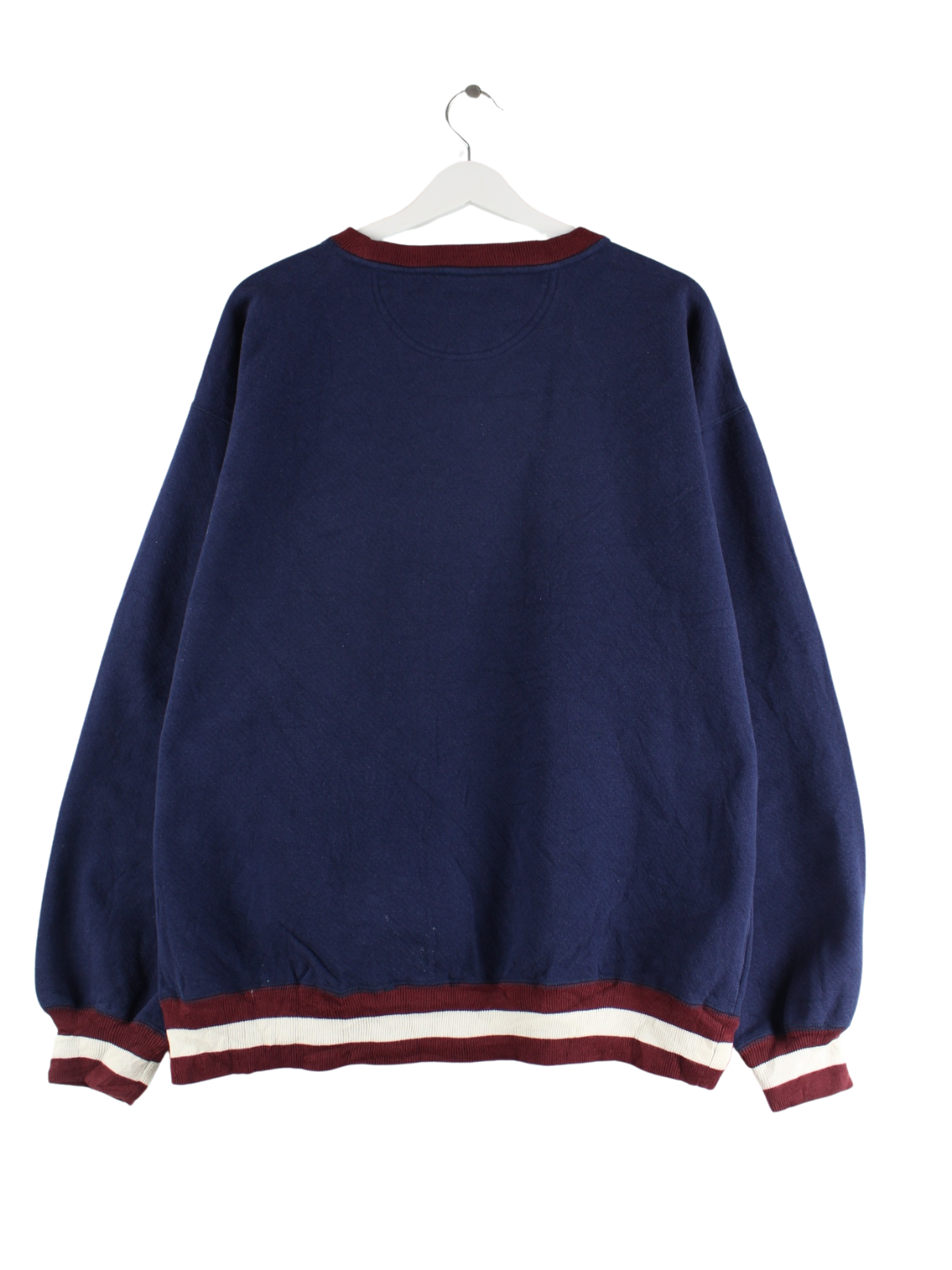 Vintage Sweater mit gesticktem Logo in Größe L aus den 90'ern. Er ist aus einer Baumwollmischung produziert und in Blau auf Lager.