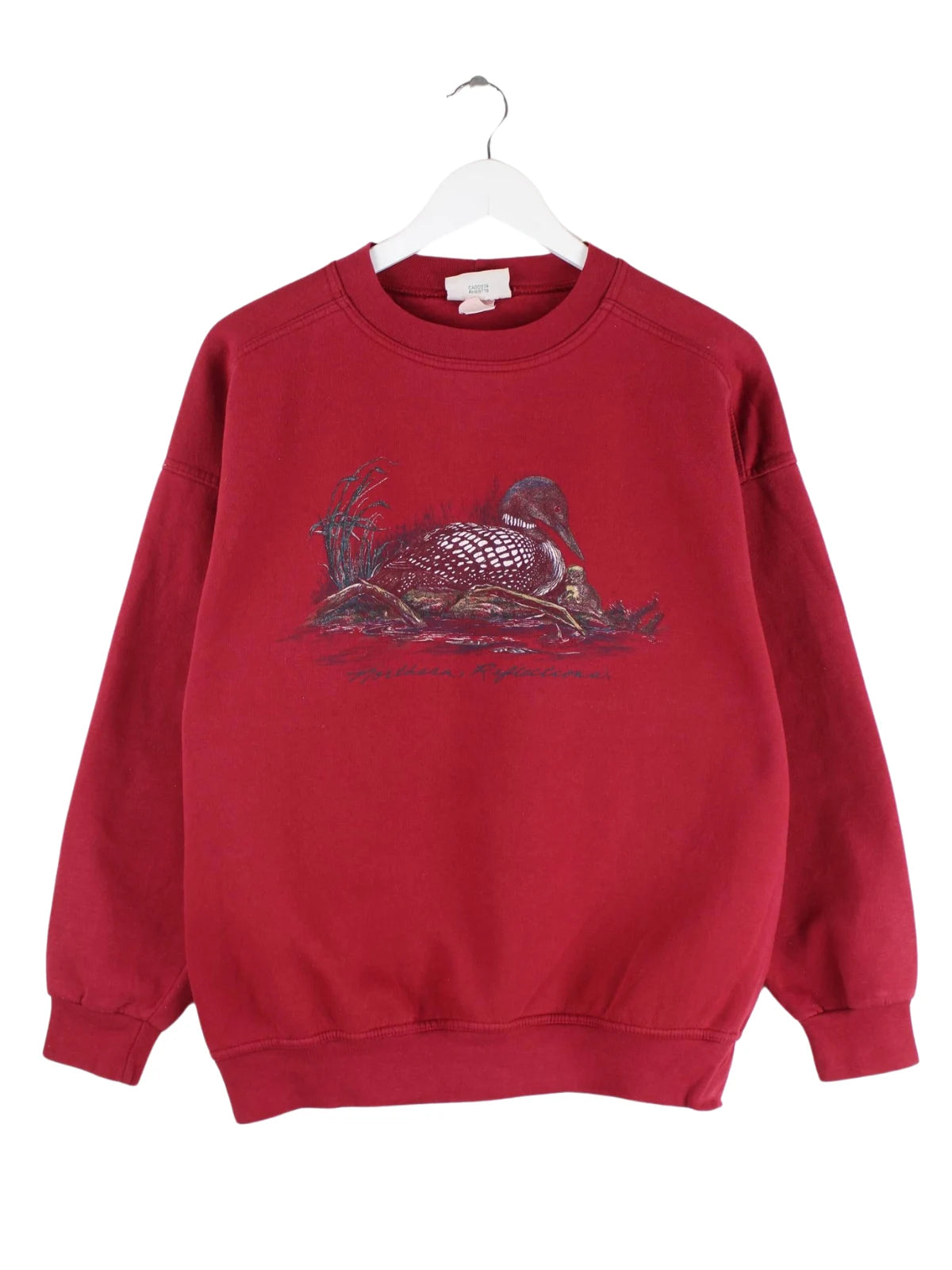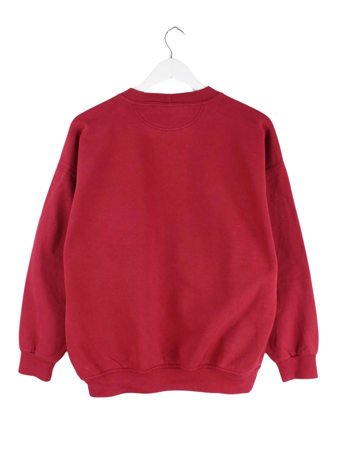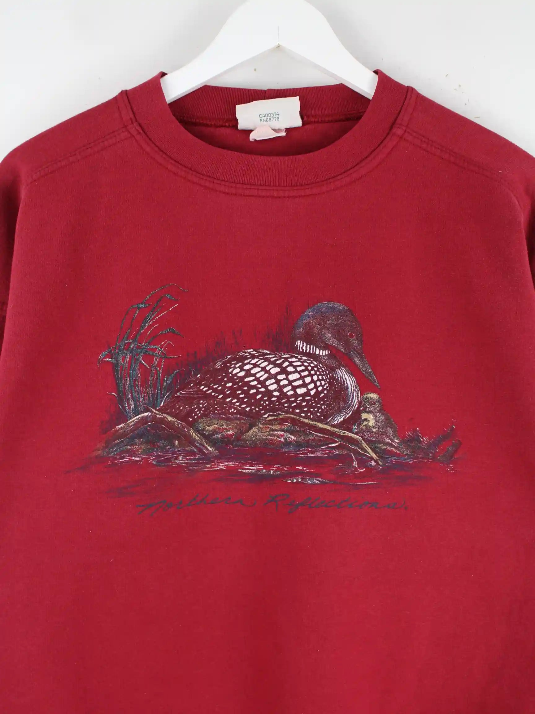 Vintage Sweater in Größe M aus den 90'ern. Er ist aus einer Baumwollmischung und in Rot zu haben. Mit seltenem Duck Print.