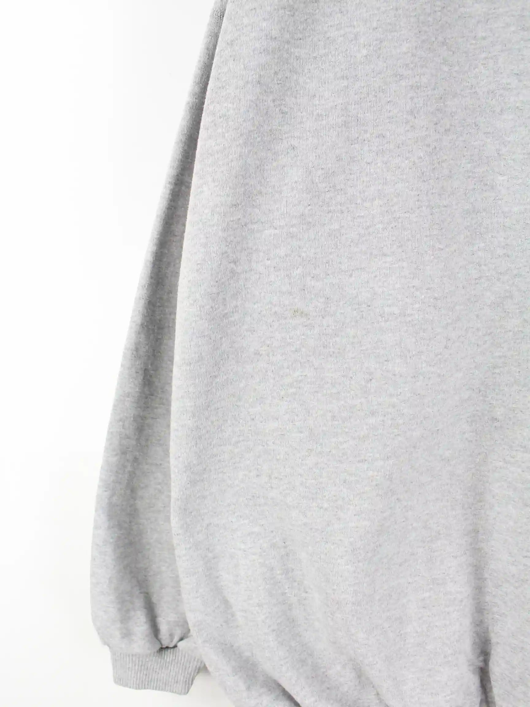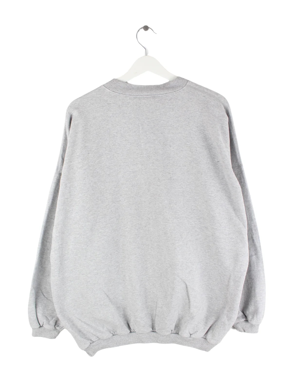 Grauer Vintage Sweater mit gestickten Motiven aus den 90'ern in Größe XL. Er ist aus einer Baumwollmischung hergestellt und in gutem Zustand zu haben.