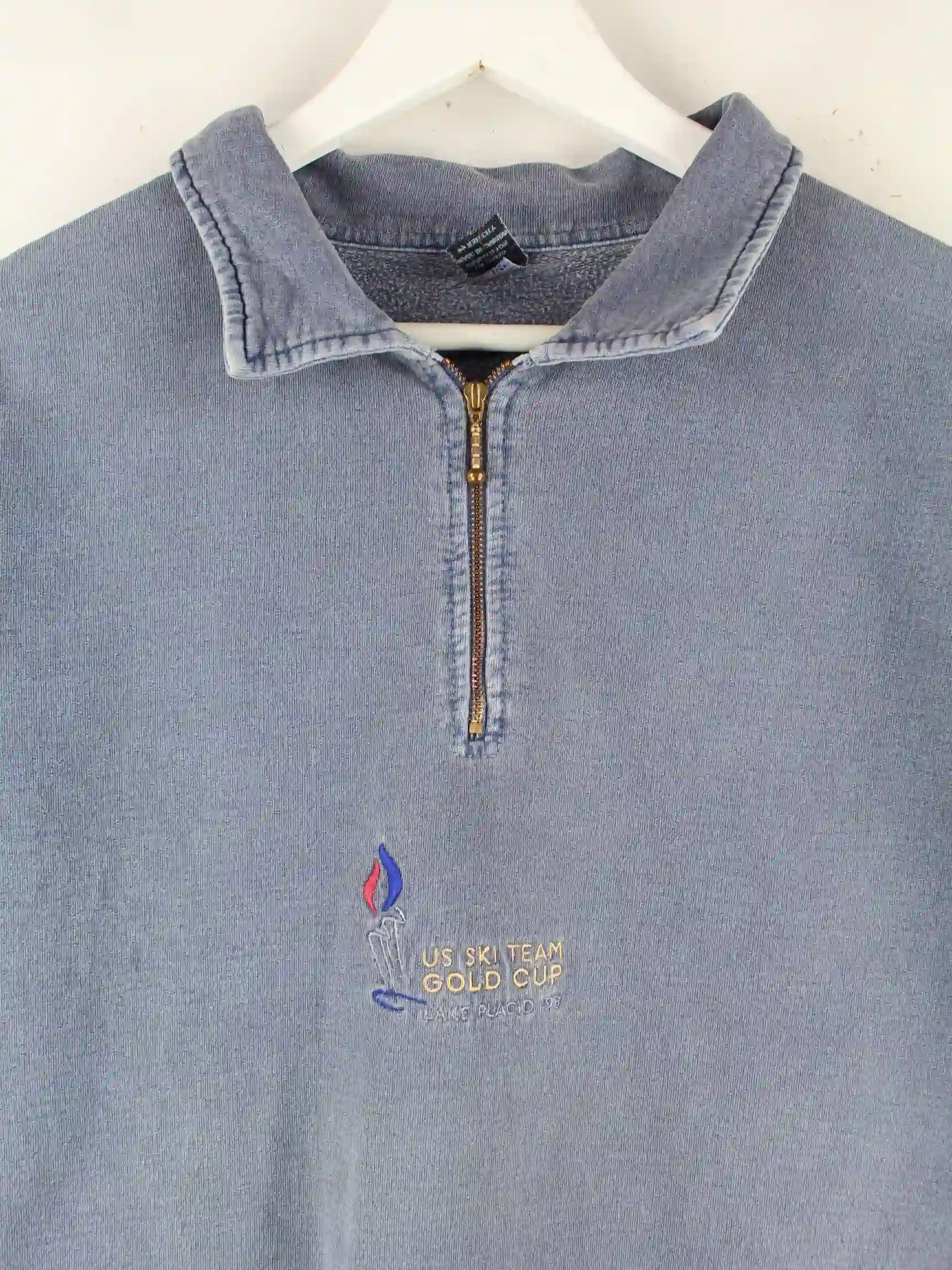 Blauer Vintage Sweater mit Stickereien und half Zip aus den 90'ern in Größe XL. Er ist aus einer Baumwollmischung und in sehr gutem Zustand in Stock.