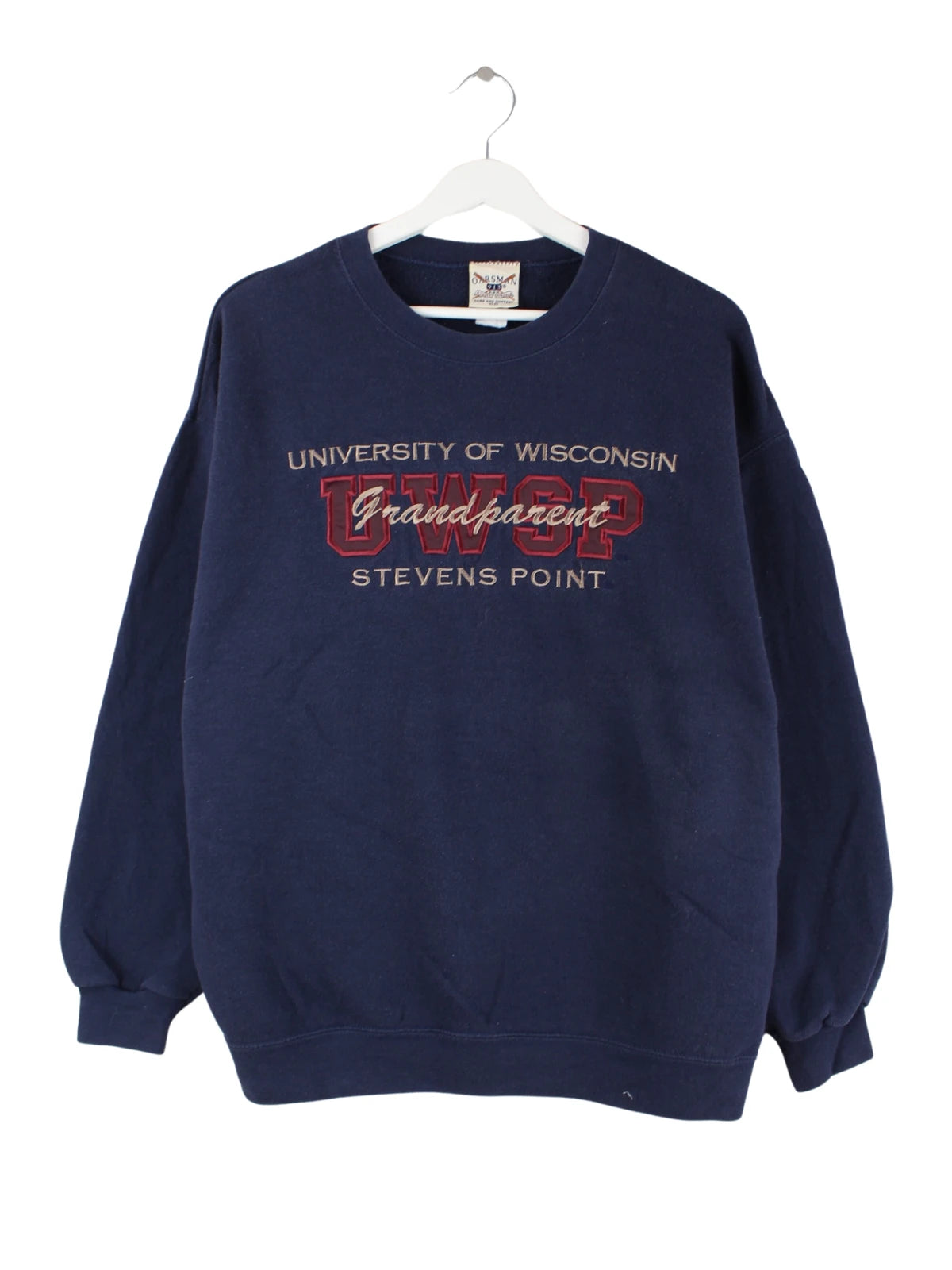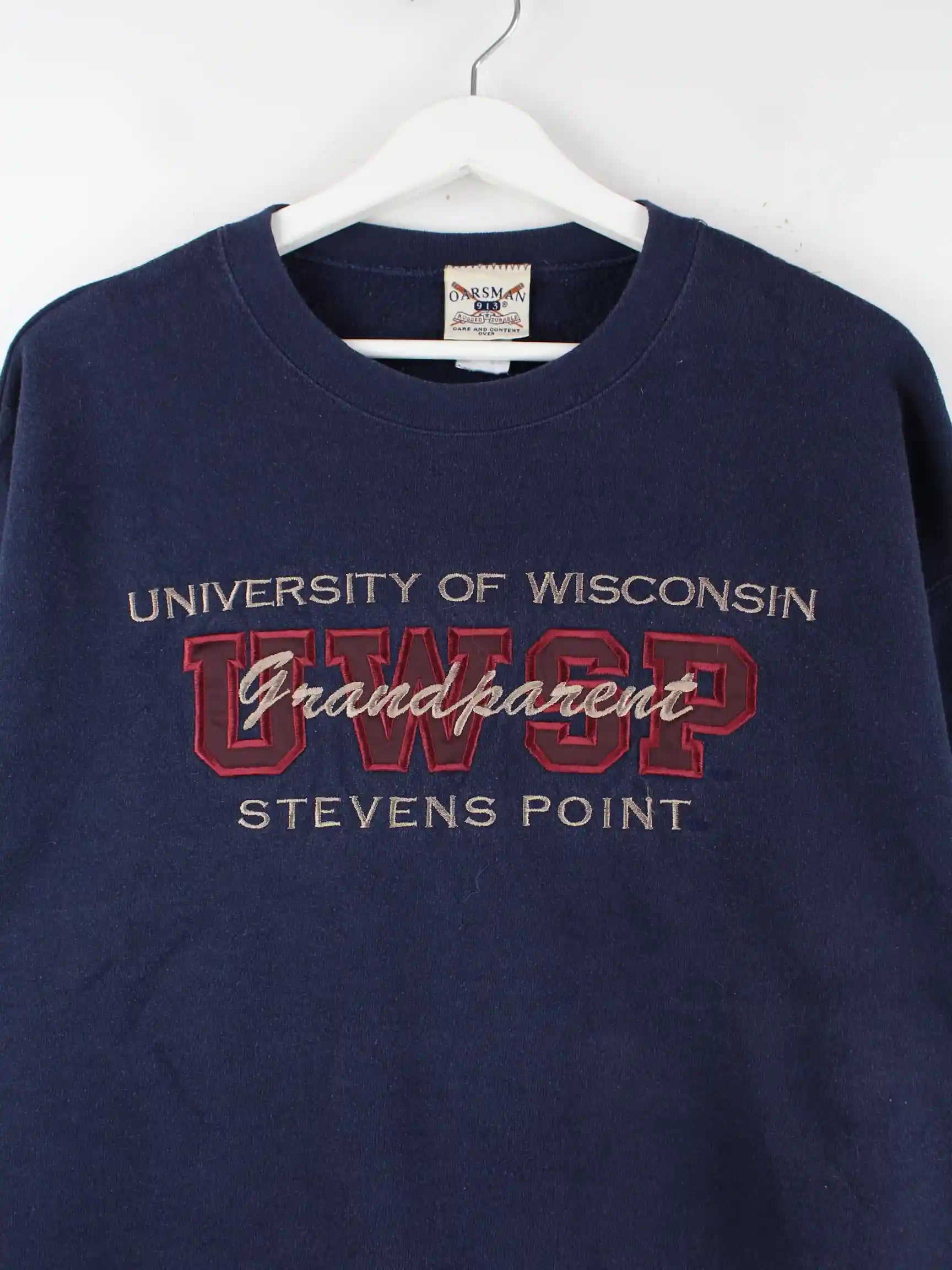 Blauer Vintage Sweater mit gesticktem Logo aus den 90'ern in Größe L. Er ist aus einer Baumwollmischung angefertigt und in sehr gutem Zustand bei uns vorrätig.