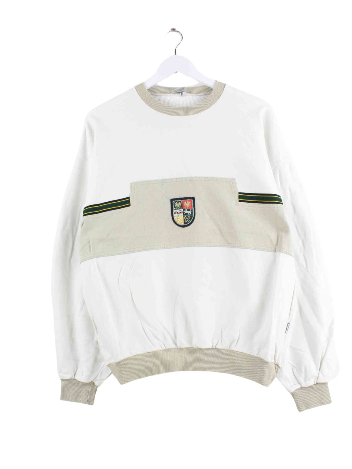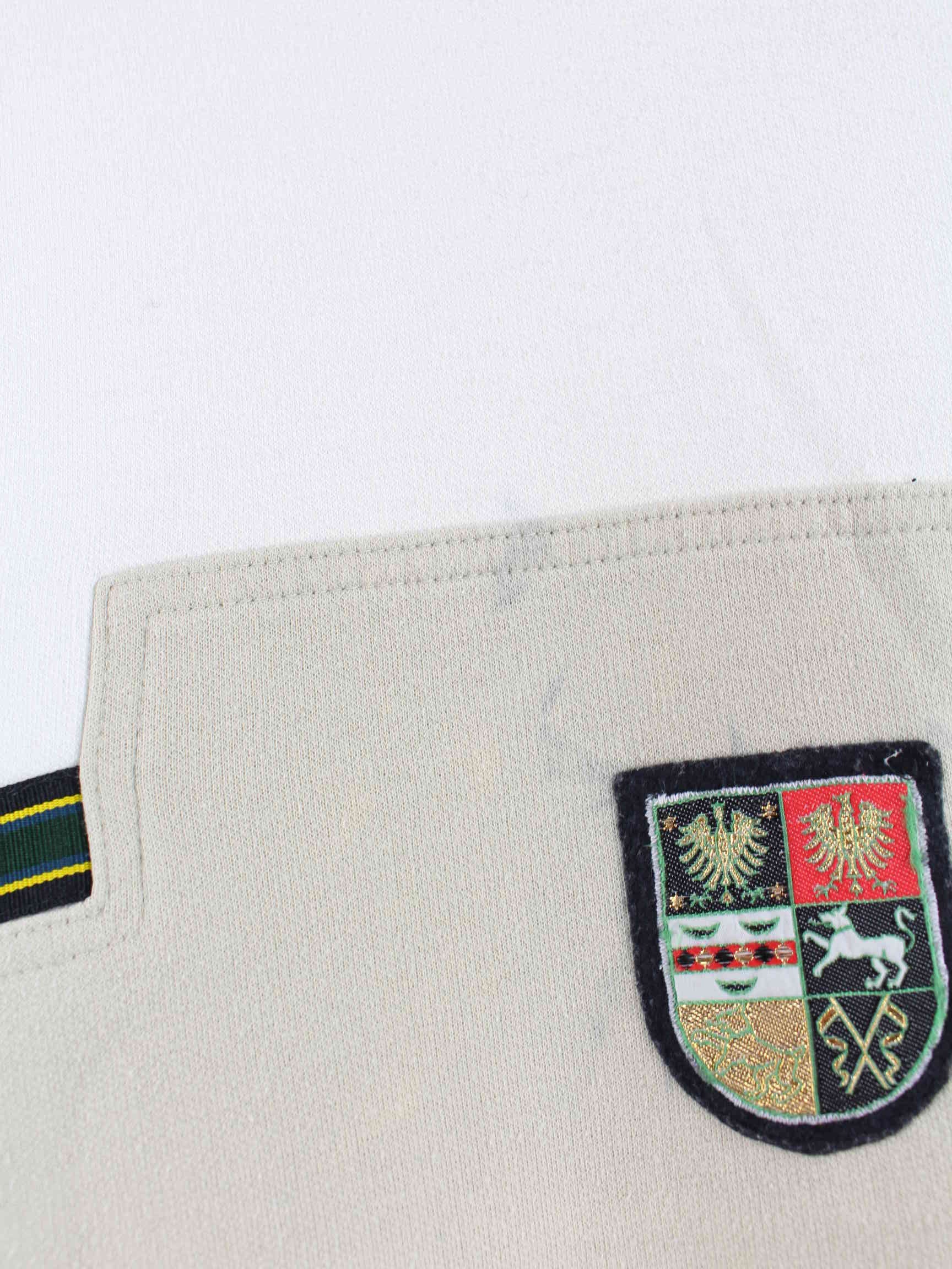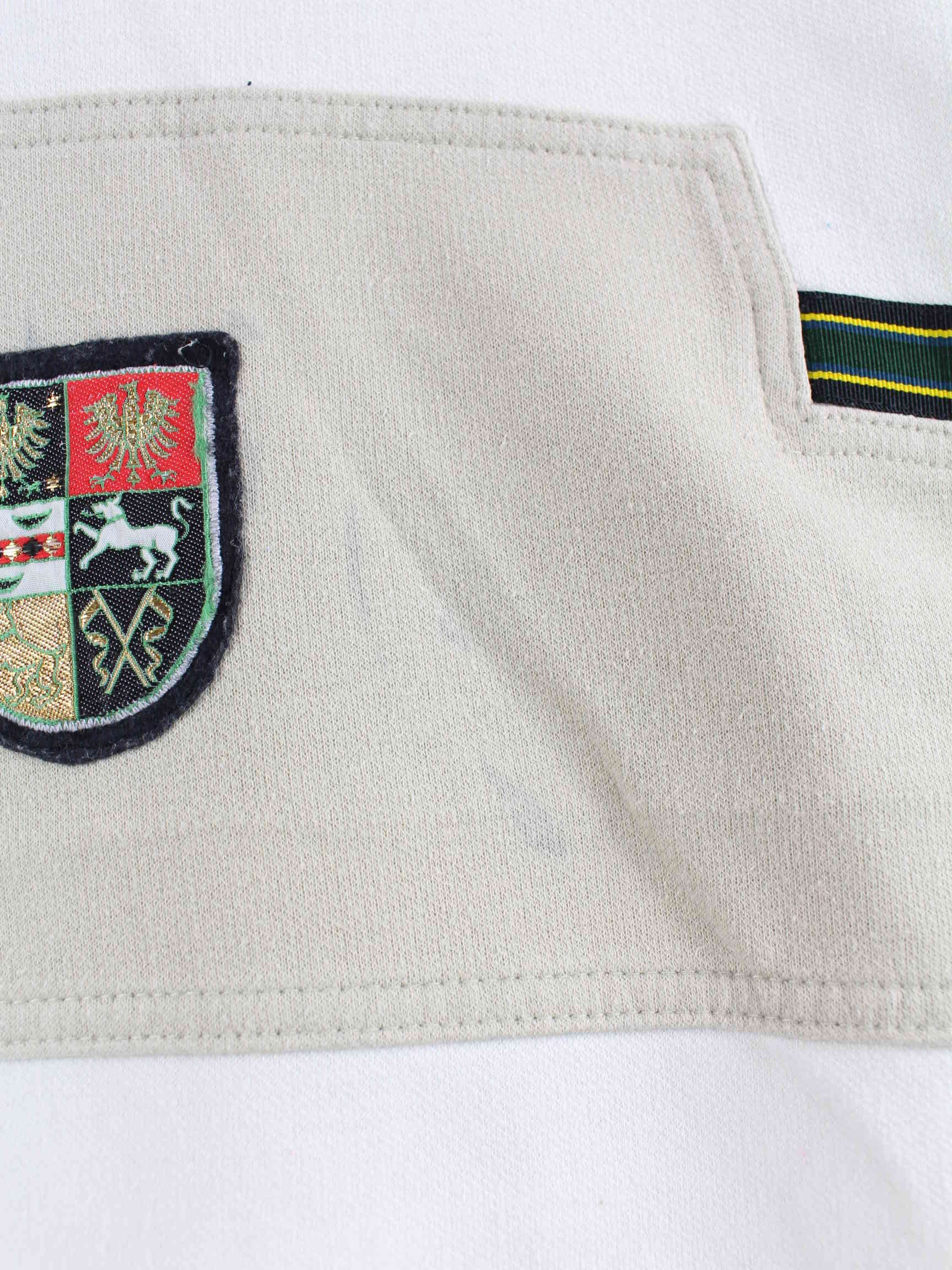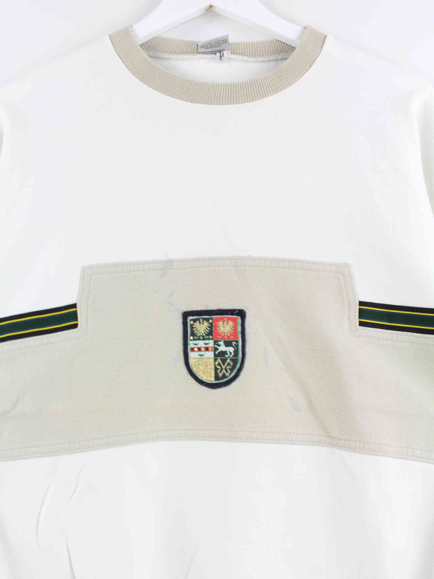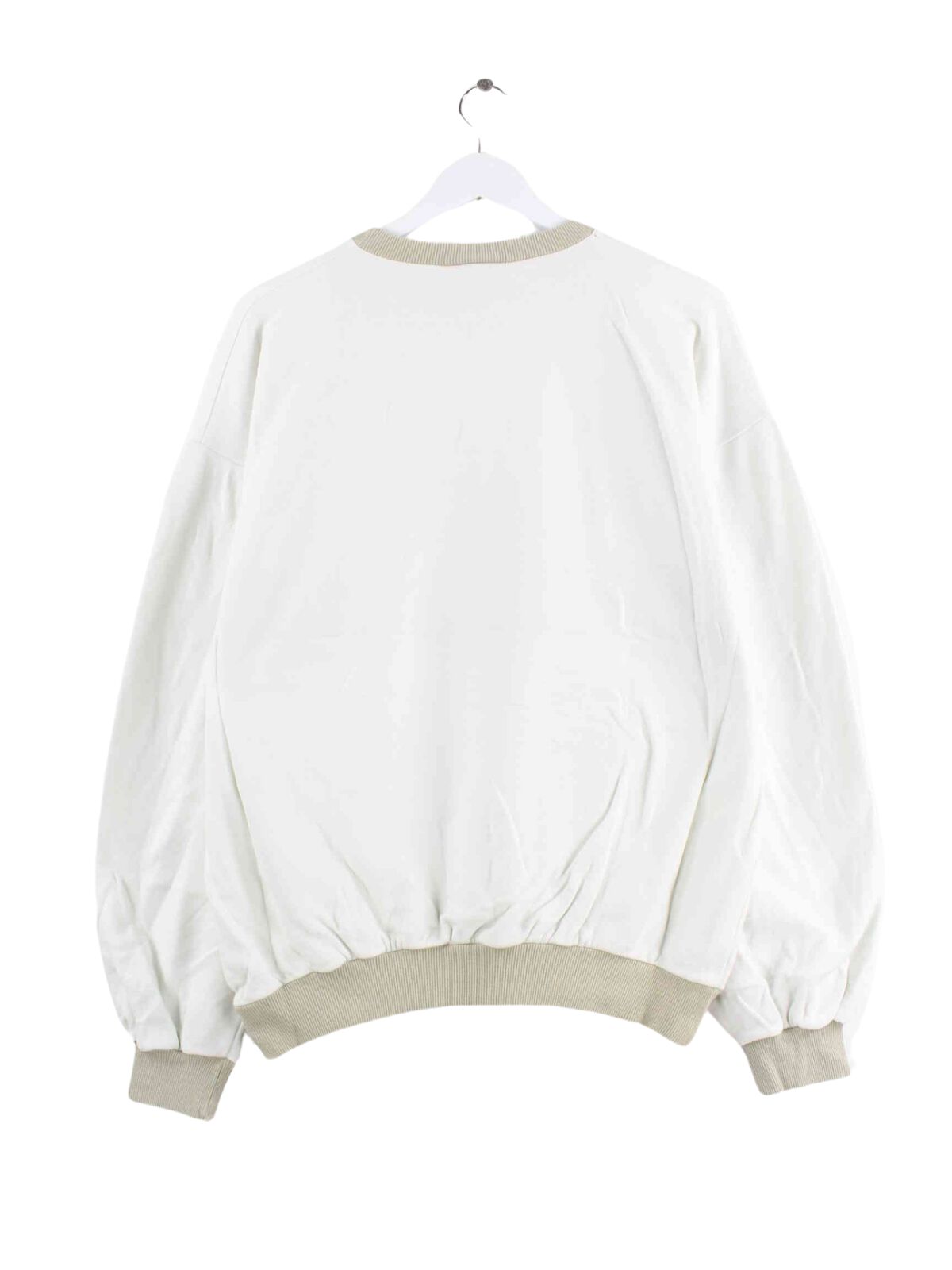 Weißer Vintage Sweater mit Stickereien aus den 90'ern in Größe M. Er ist aus einer Baumwollmischung hergestellt und in gutem Zustand bei uns zu bekommen.
