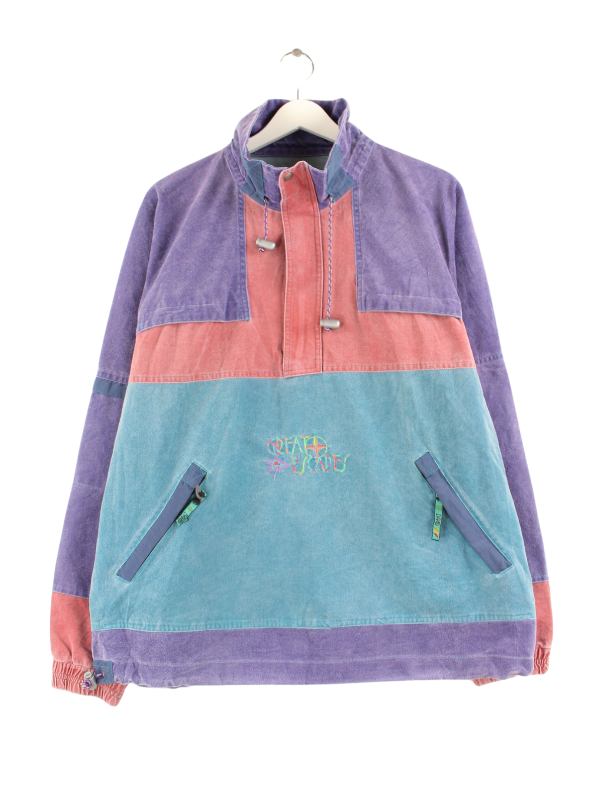 Vintage Trainingsjacke mit Stick und halbem Reißverschluß in Größe L aus den 90'ern. Sie ist aus Synthetik gefertigt und in bunten Farben zu haben.
