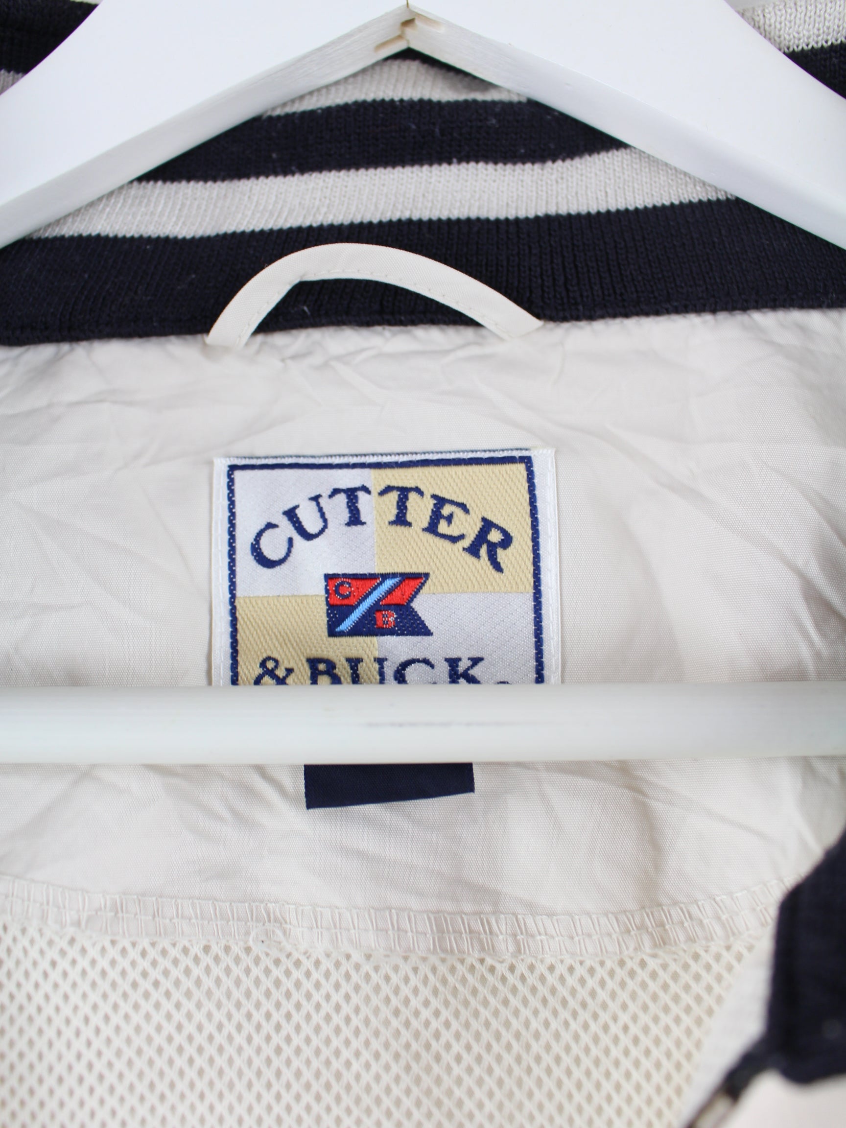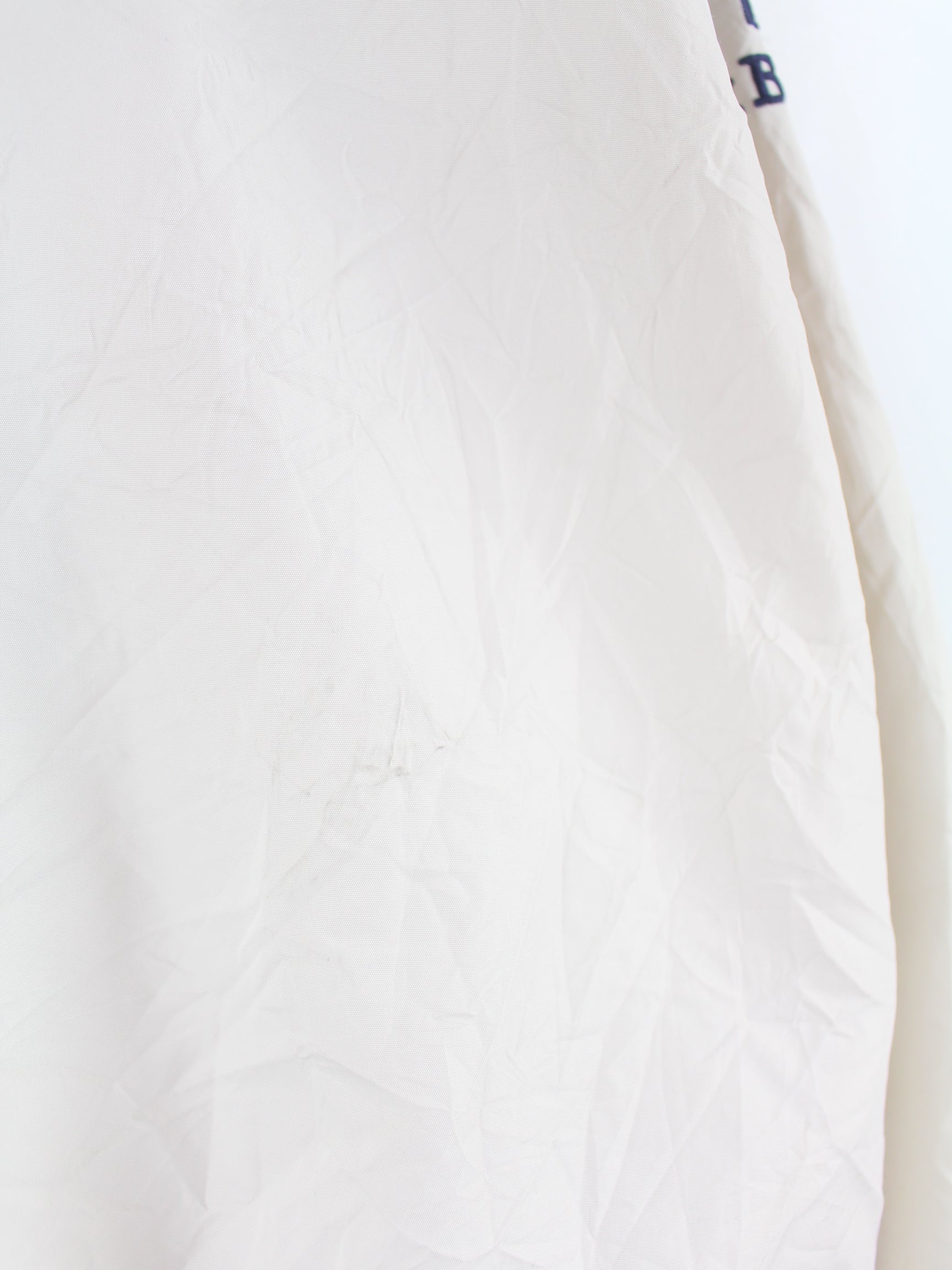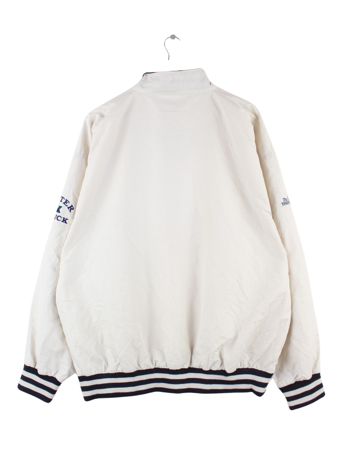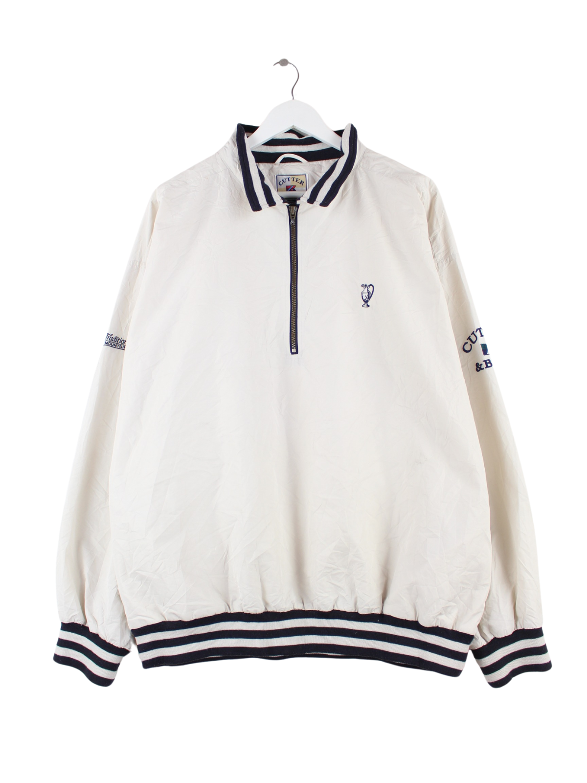 Weißer Vintage Sweater mit kurzem Reißverschluß aus den 90'ern in Größe XXL. Er ist aus Synthetik angefertigt und in gutem Zustand bei uns zu bekommen.
